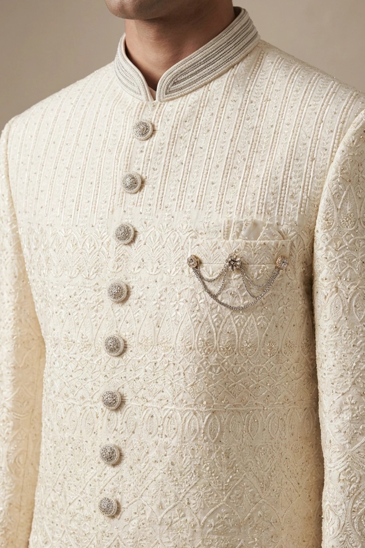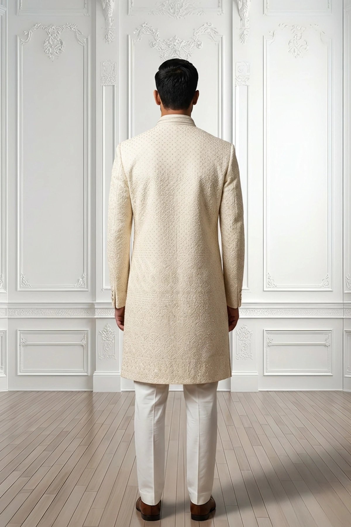 This elegant off-white sherwani features intricate self-woven jacquard patterns throughout, giving it a rich and regal texture with a subtle sheen. It is tailored in a straight, knee-length silhouette with a structured band collar, full front button placket, and a decorative chain brooch on the chest pocket for a refined finish. Paired with slim white trousers, the ensemble offers a timeless, sophisticated look perfect for weddings and formal occasions. Note: Design details and embellishments may vary slightly from the imagery shown.
