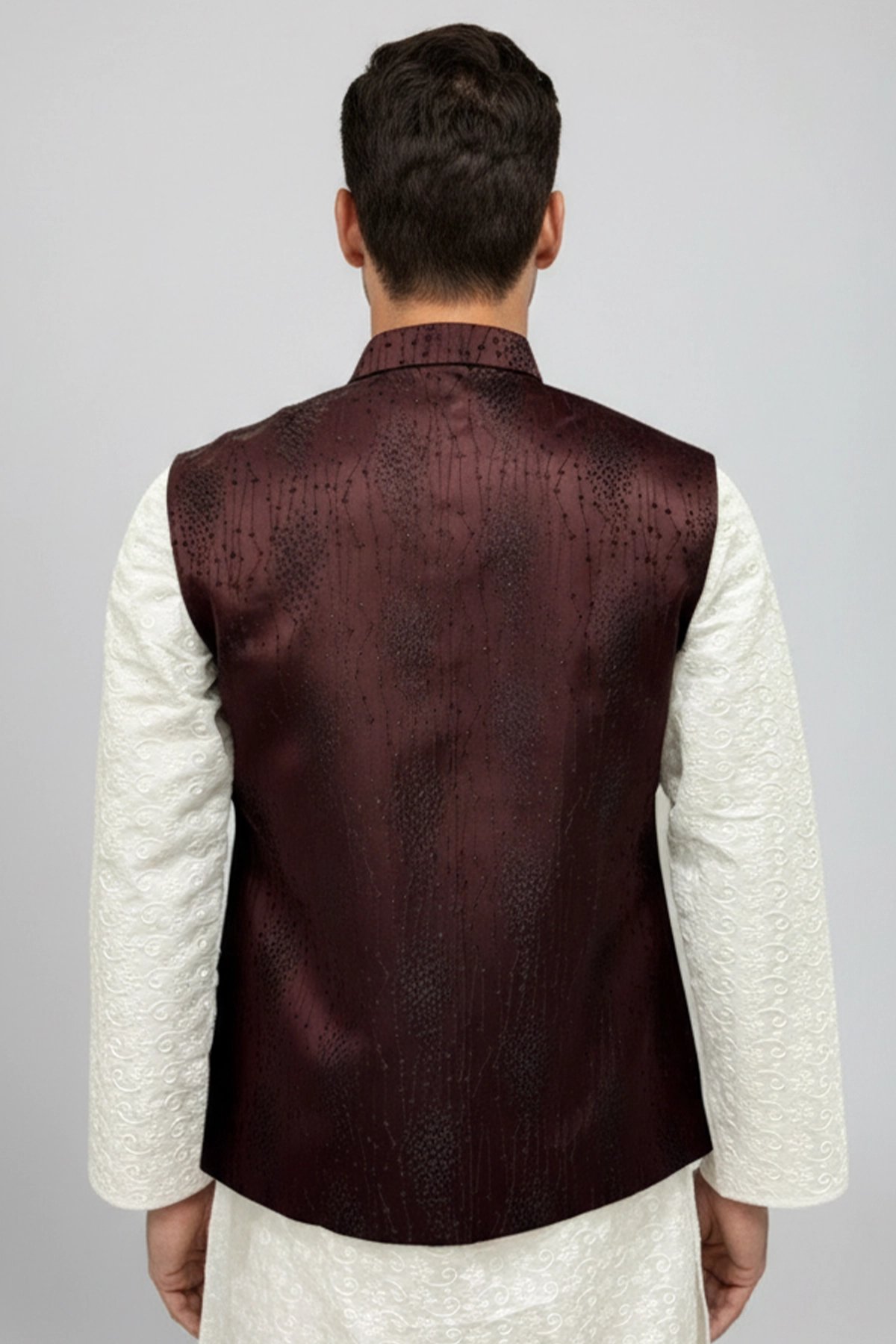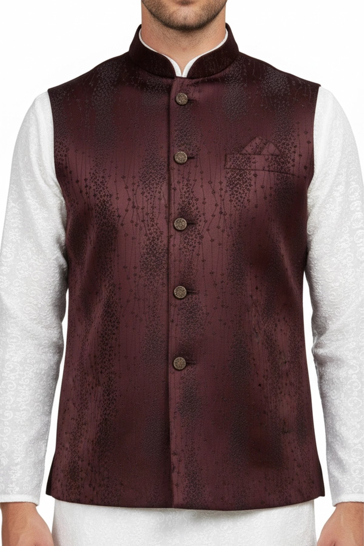 This beautiful waistcoat is crafted from a blend of brocade fabric enhanced by moulded buttons and mandarin collar along with a straight cut that fits easy around the chest and then tapers at the waist creating a broad shoulder-slim waist look. It is perfect for formal occasions as well as layering over basic clothing.