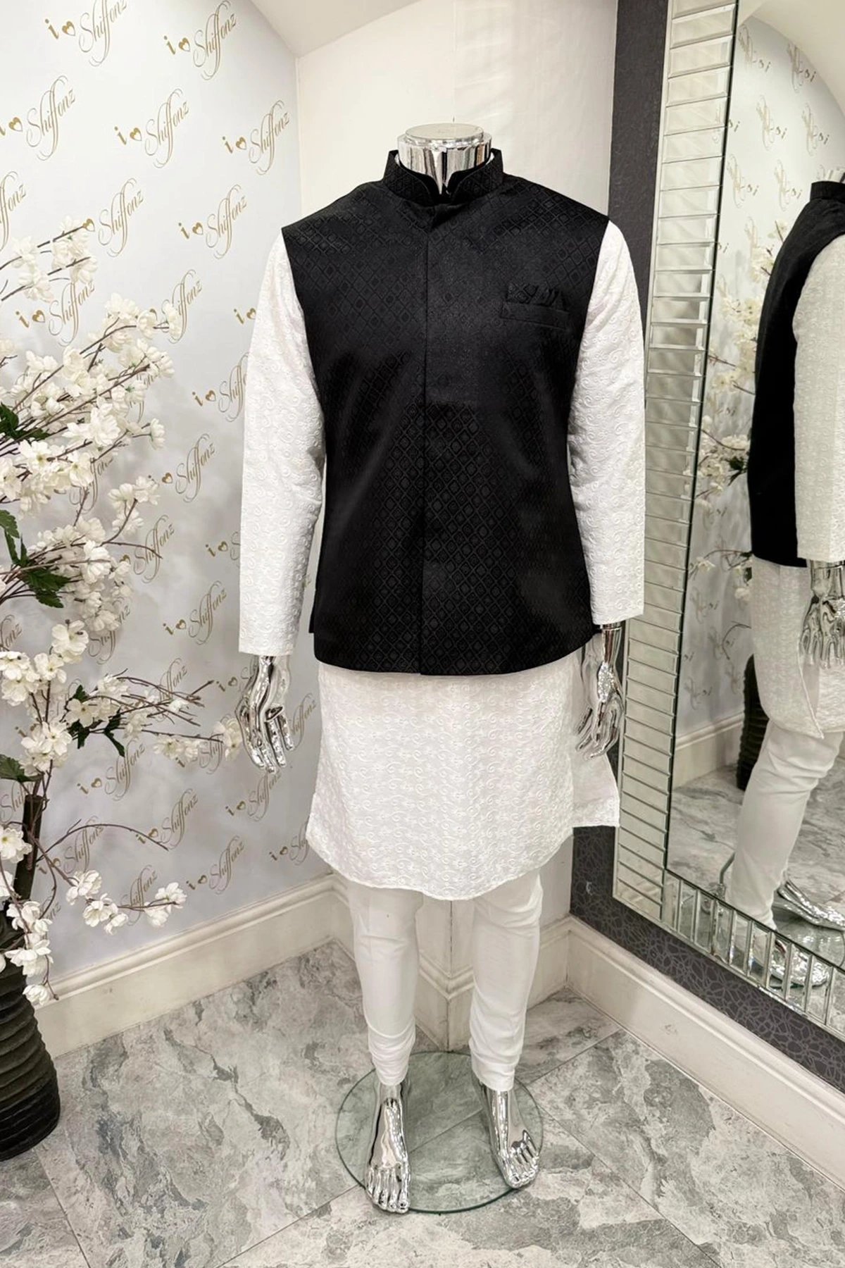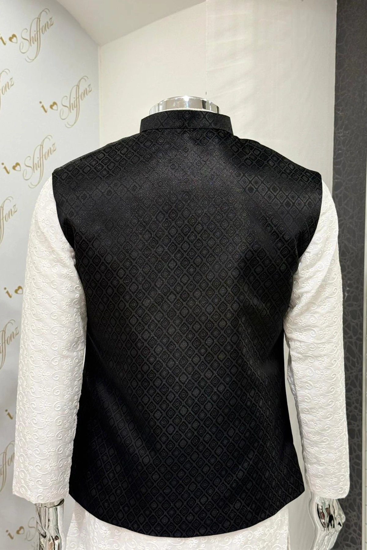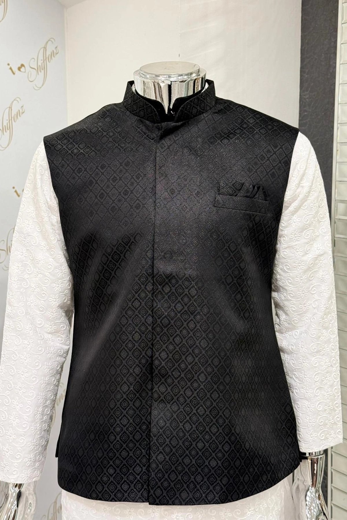 This beautiful waistcoat is crafted from a blend of brocade fabric enhanced by moulded buttons and mandarin collar along with a straight cut that fits easy around the chest and then tapers at the waist creating a broad shoulder-slim waist look. It is perfect for formal occasions as well as layering over basic clothing. Note: Kurta pyjama shown in the picture is not included.