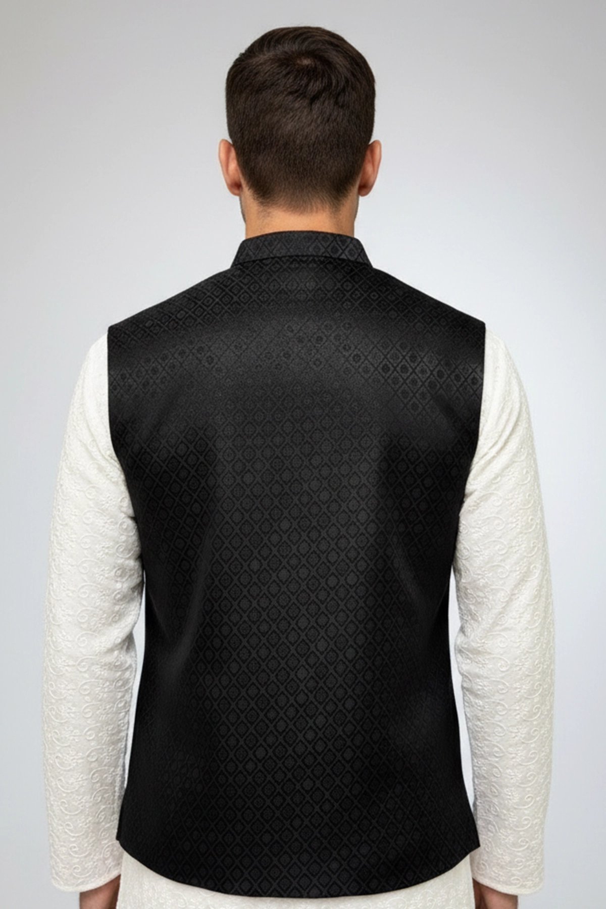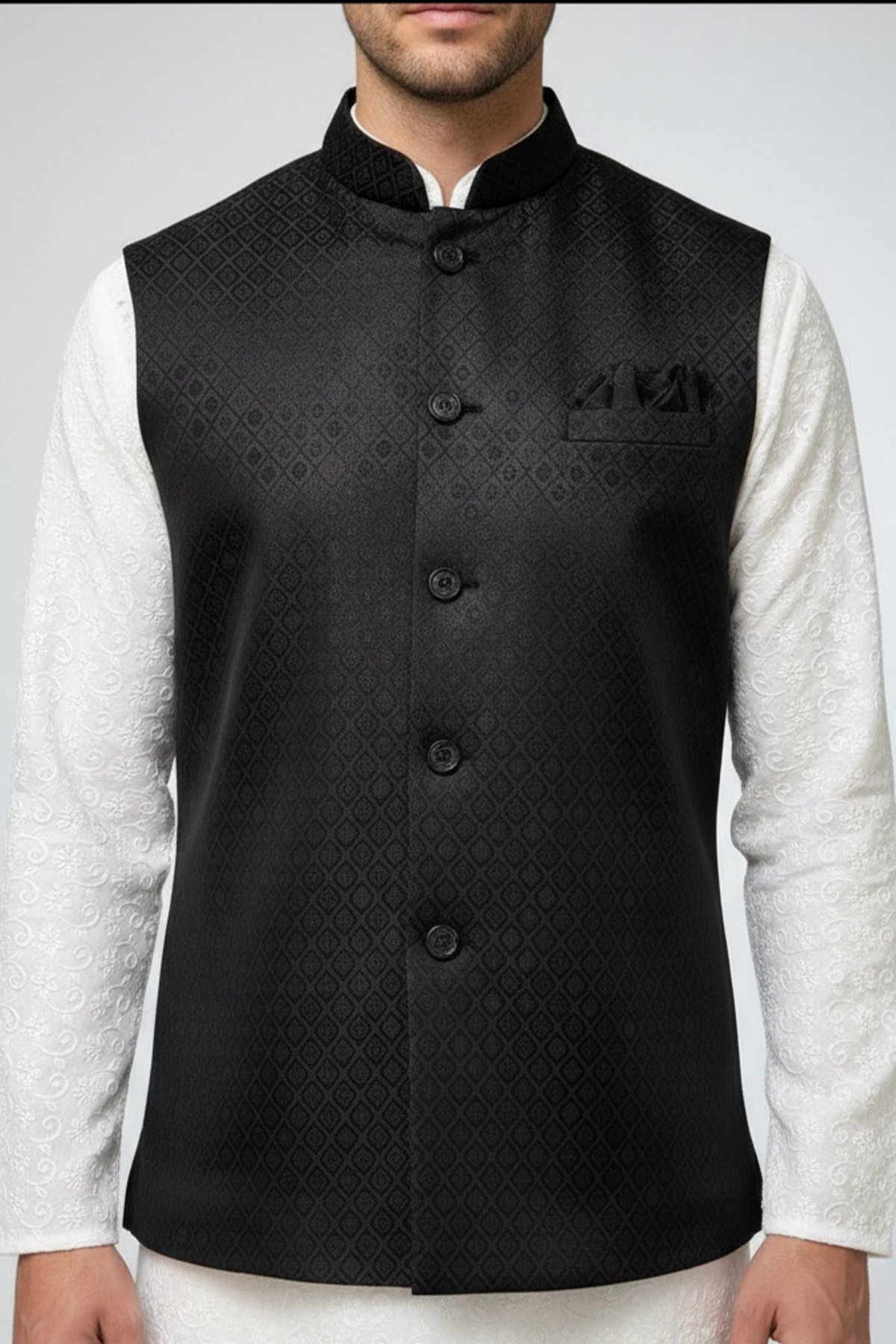 This beautiful waistcoat is crafted from a blend of brocade fabric enhanced by moulded buttons and mandarin collar along with a straight cut that fits easy around the chest and then tapers at the waist creating a broad shoulder-slim waist look. It is perfect for formal occasions as well as layering over basic clothing. Note: Kurta pyjama shown in the picture is not included.
