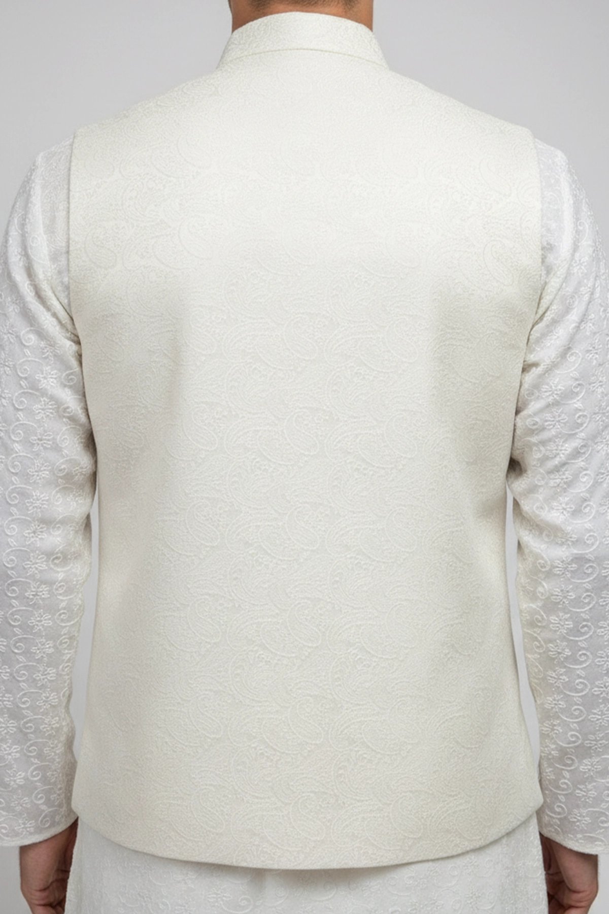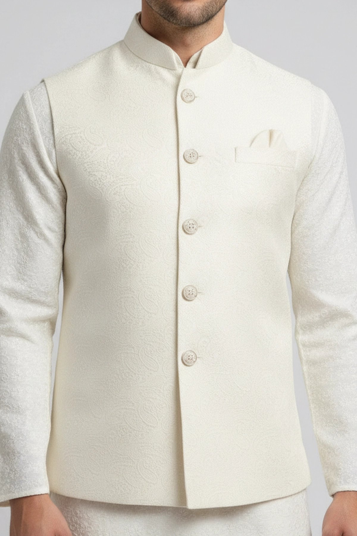 This beautiful waistcoat is crafted from a blend of brocade fabric enhanced by moulded buttons and mandarin collar along with a straight cut that fits easy around the chest and then tapers at the waist creating a broad shoulder-slim waist look. It is perfect for formal occasions as well as layering over basic clothing. Note: Kurta pyjama shown in the picture is not included.