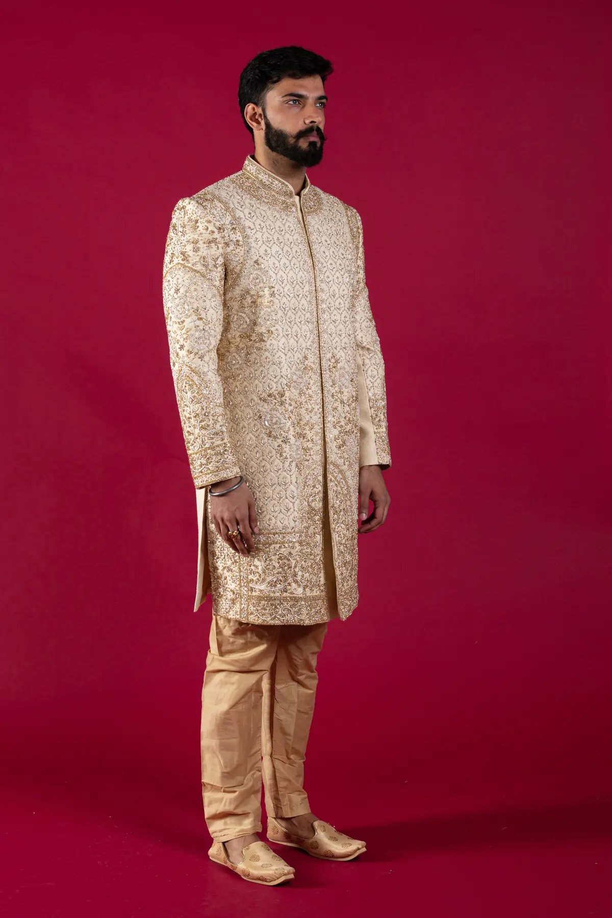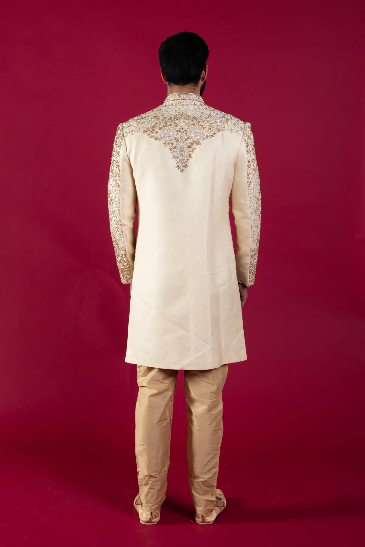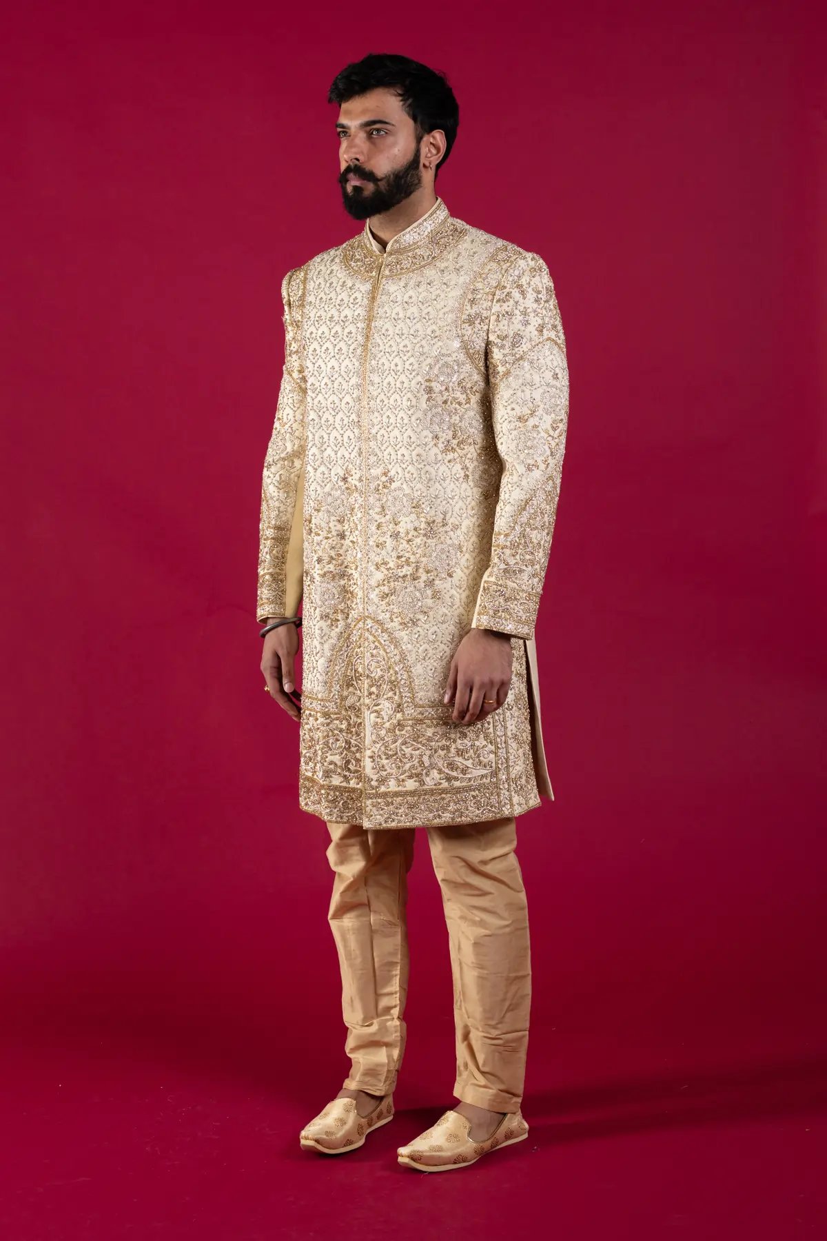 Indulge in timeless elegance with our classic ensemble; a perfect fusion of sophistication and traditional style. The pristine sherwani is intricately designed with luxury thread work embroidery as well as antique motif embellishments striking a balance between tradition and modernity. This ensemble, crafted with meticulous attention to detail, is ideal for both formal gatherings and festive occasions. Step into the spotlight with grace and poise, leaving a lasting impression in this versatile and enchanting outfit. Paired with contrasted raw silk trousers.