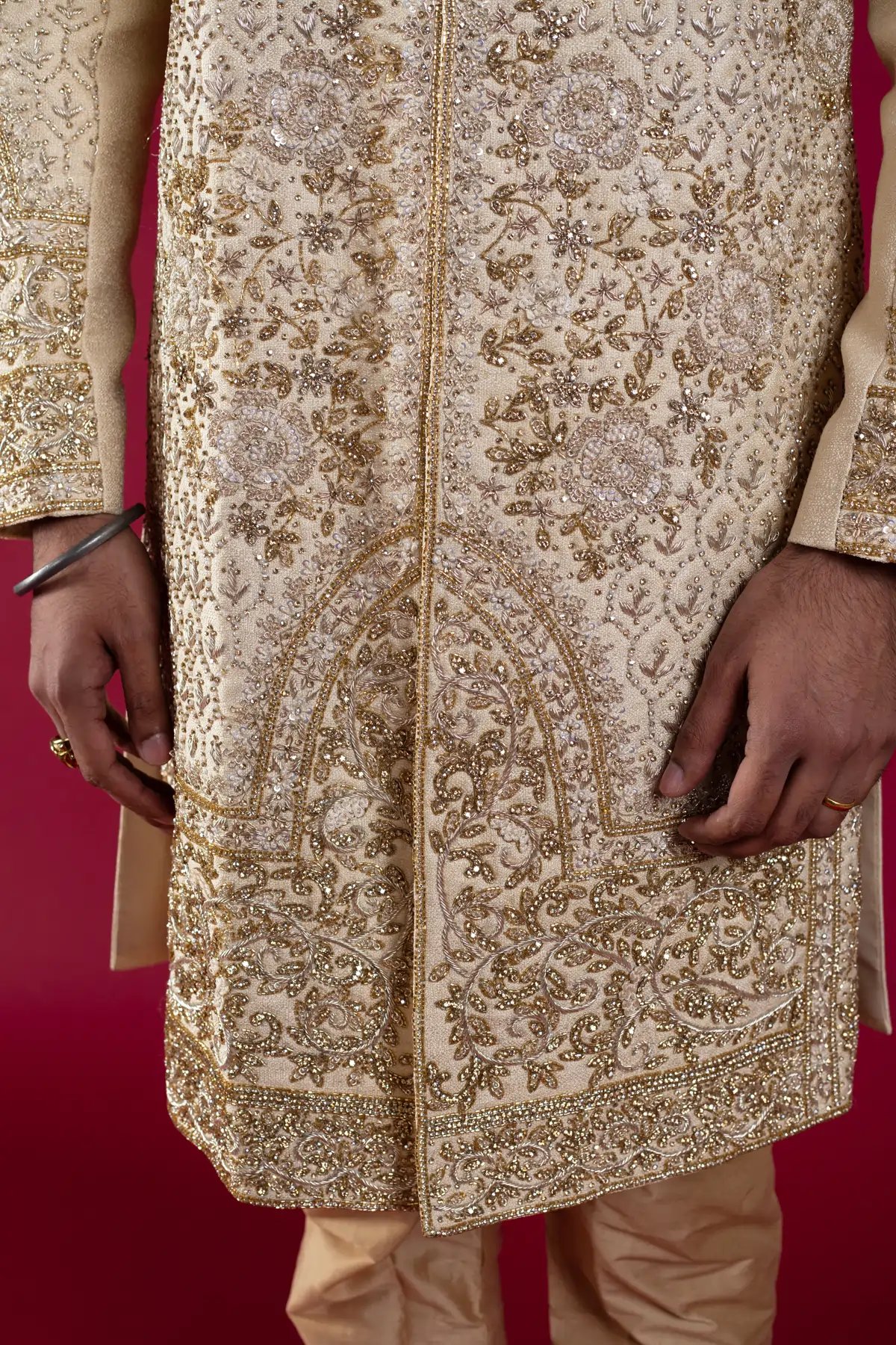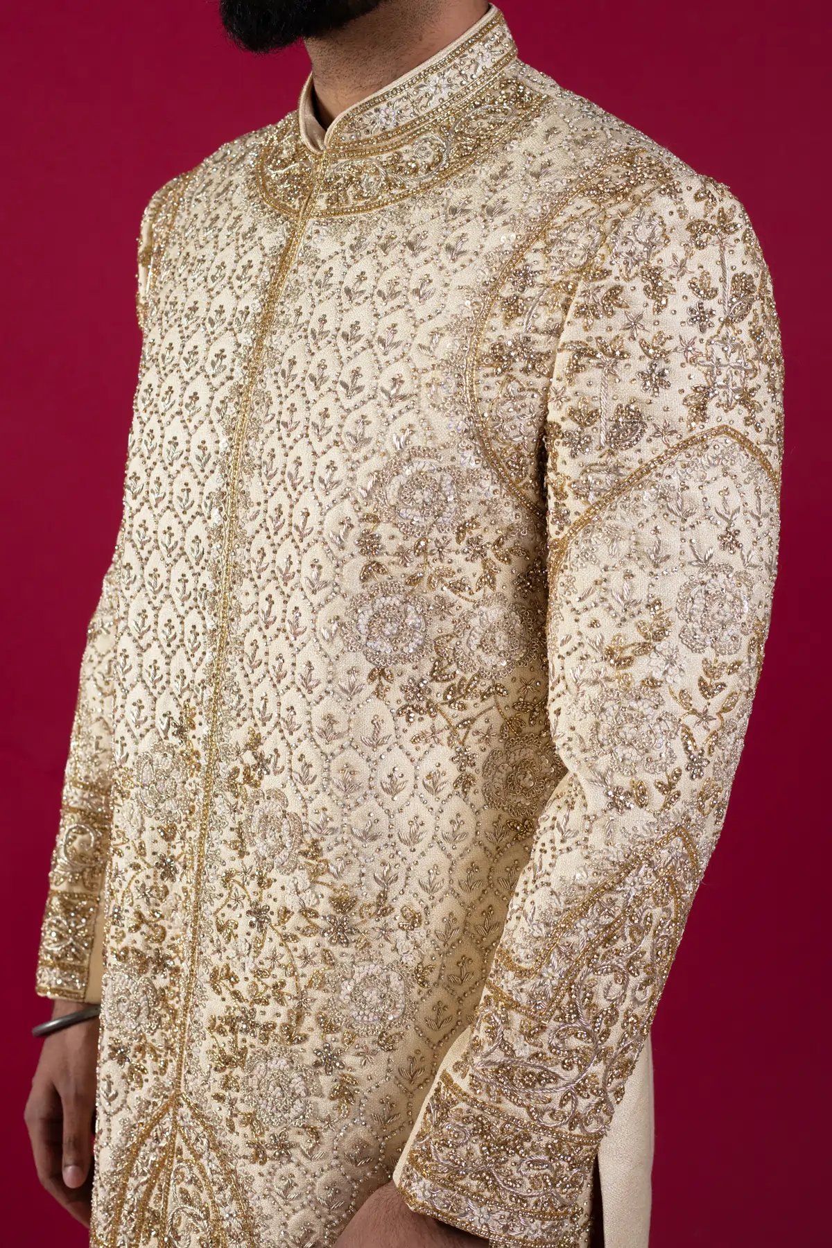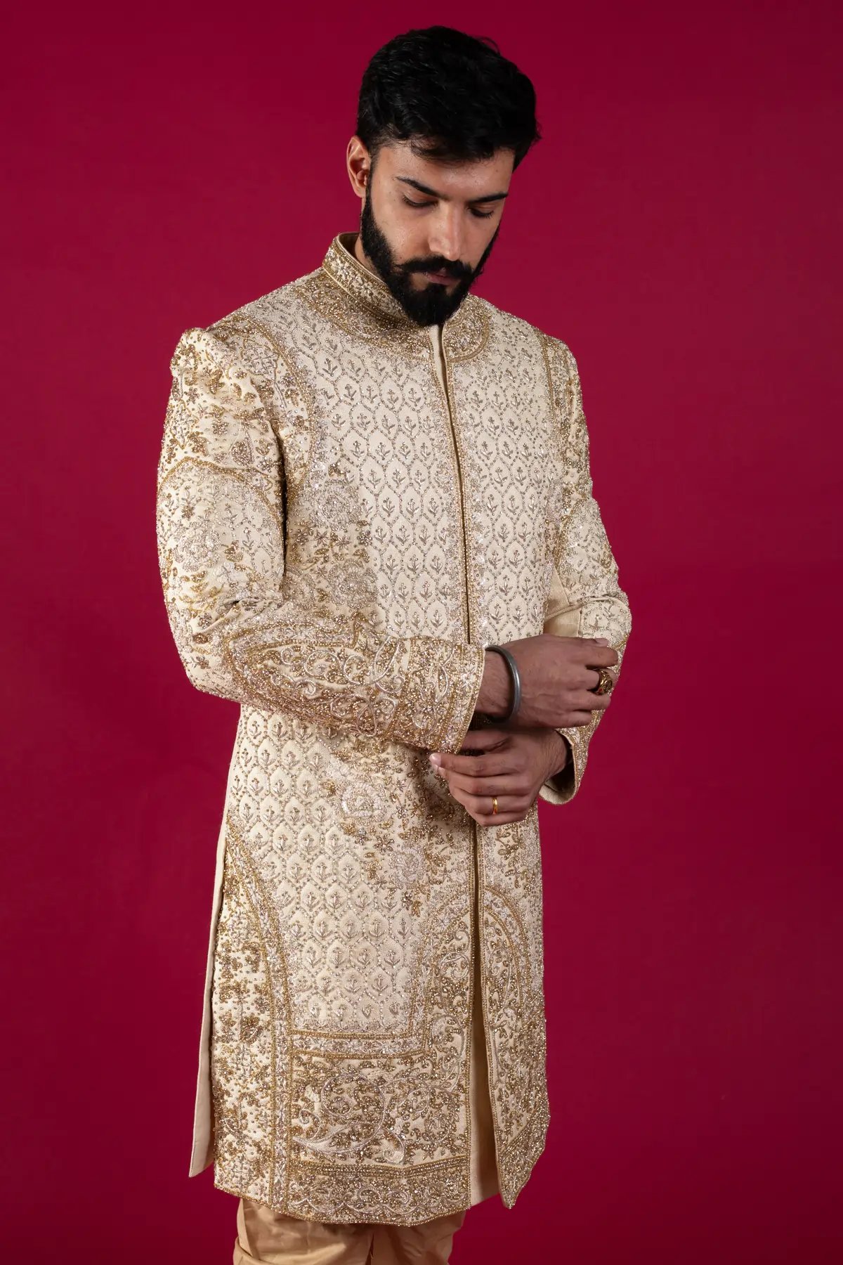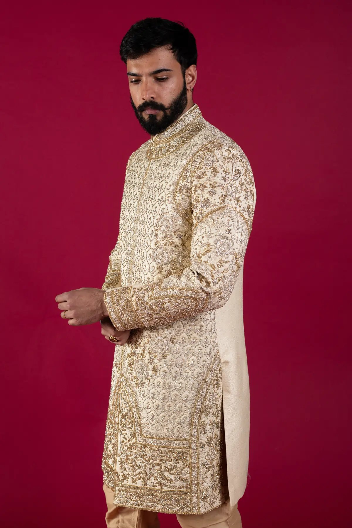 Indulge in timeless elegance with our classic ensemble; a perfect fusion of sophistication and traditional style. The pristine sherwani is intricately designed with luxury thread work embroidery as well as antique motif embellishments striking a balance between tradition and modernity. This ensemble, crafted with meticulous attention to detail, is ideal for both formal gatherings and festive occasions. Step into the spotlight with grace and poise, leaving a lasting impression in this versatile and enchanting outfit. Paired with contrasted raw silk trousers.