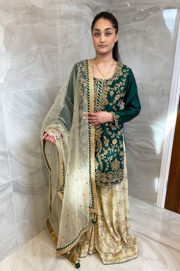 This beautiful 2 piece mens’s brocade sherwani features a long printed coat with full length printed sleeves. It comes with a mandarin contrasted embroidered collar with an embroidered pocket. The look is finished with contrasted duping silk churidaar trousers.