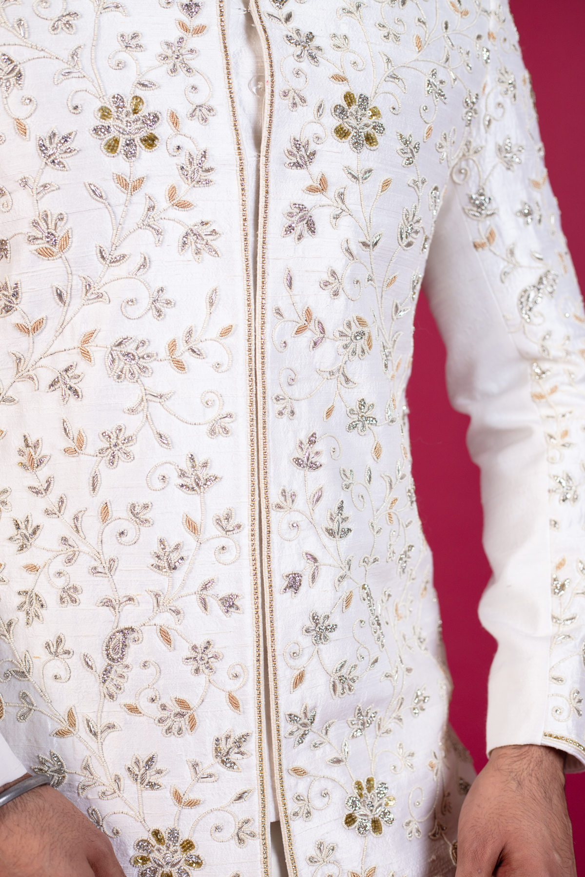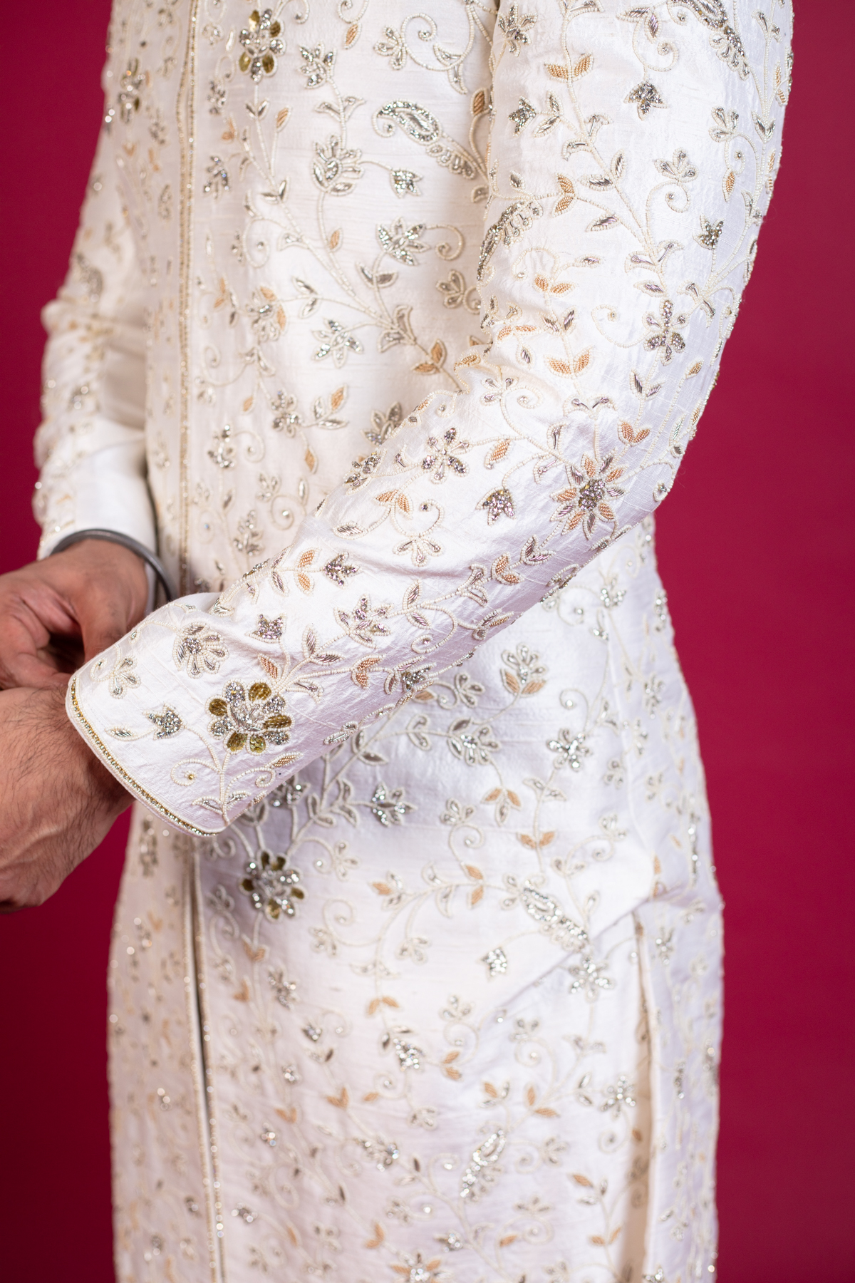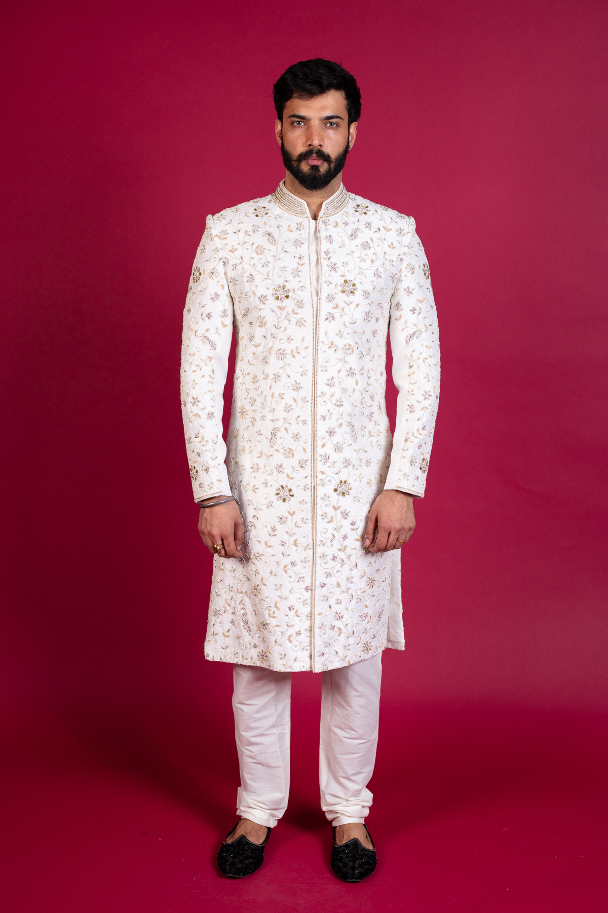 This beautiful men’s sherwani features a long coat all closed up to the collar and below the knee lengthwise. It is designed with beautiful thread-work embroidered detailing all over the front and full length sleeves with silver shiny scattered diamanté’s. It’s finished with churidaar trousers.