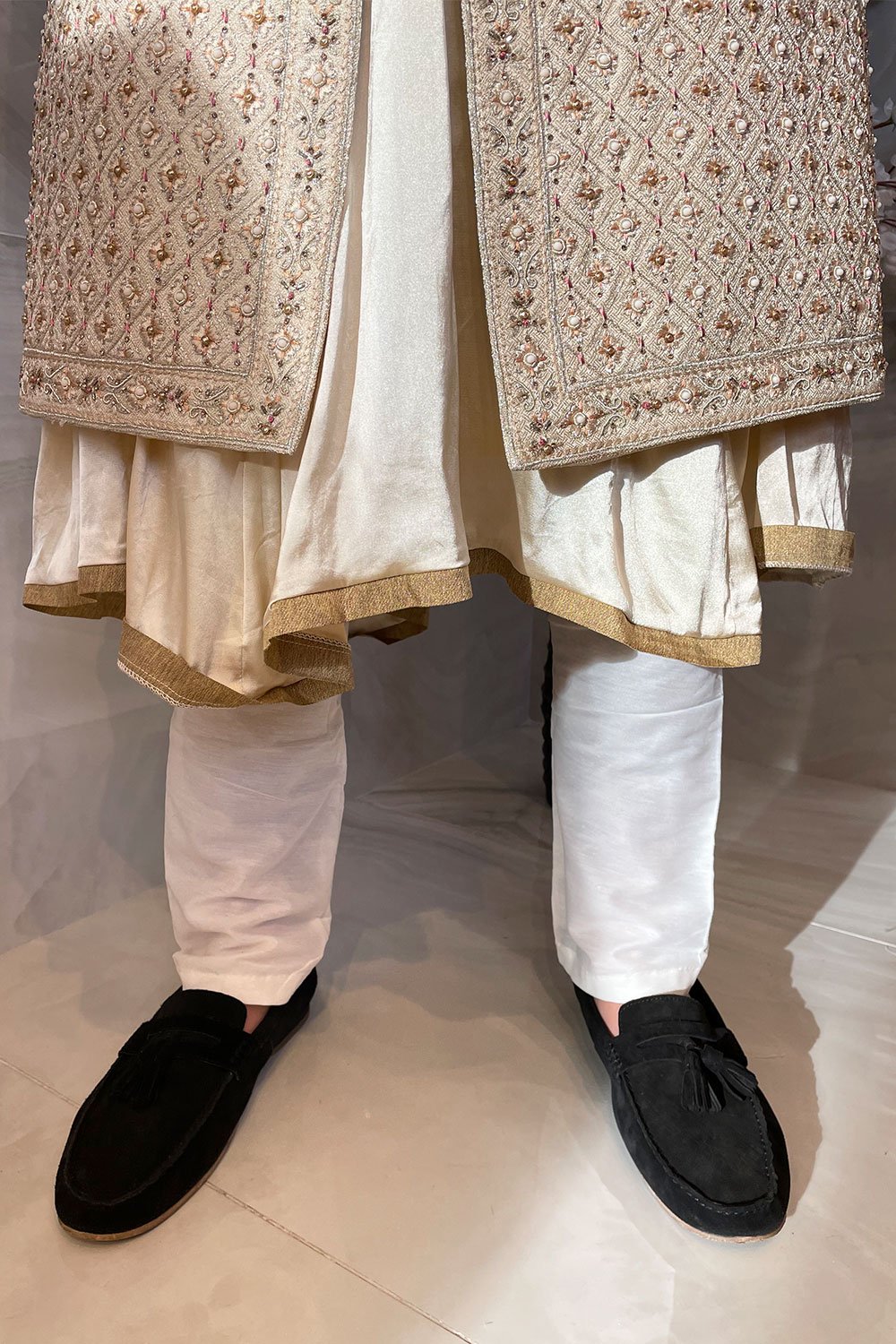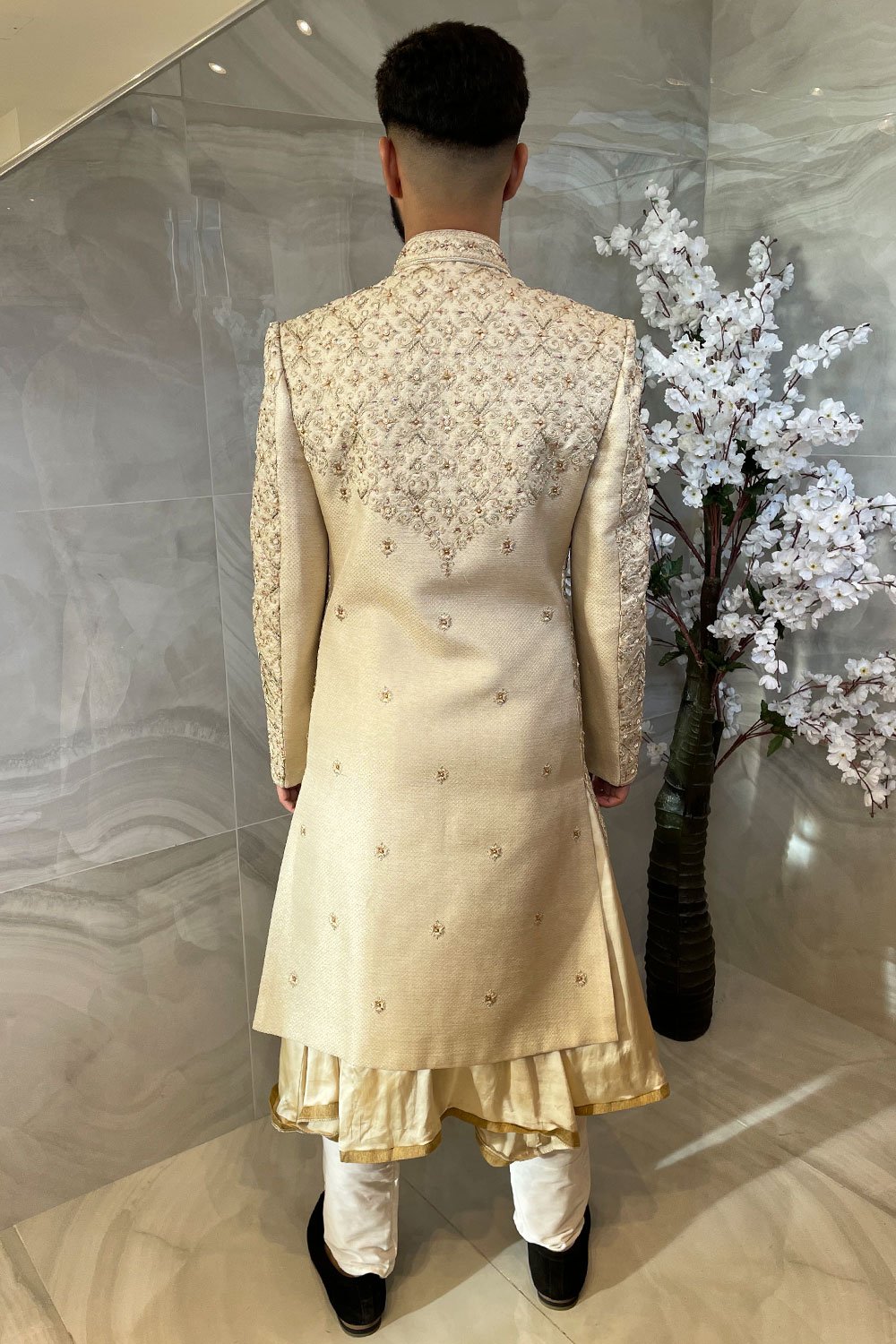 This beautiful men’s sherwani features a long coat all closed up to the collar and below the knee lengthwise, finished with a peplum under layer in silk. It is designed with beautiful thread-work embroidered detailing all over the front and full length sleeves with silver shiny scattered diamanté’s. It’s finished with a plain dupion silk churidar.