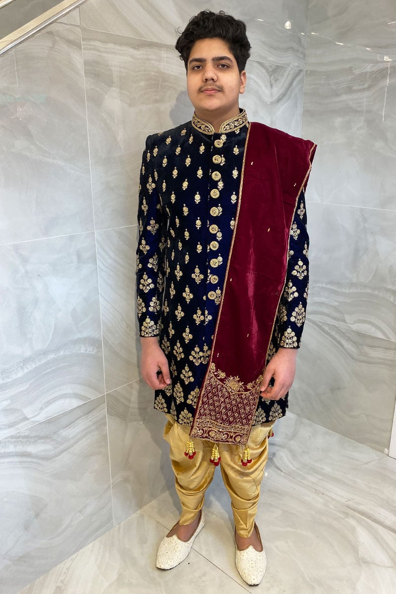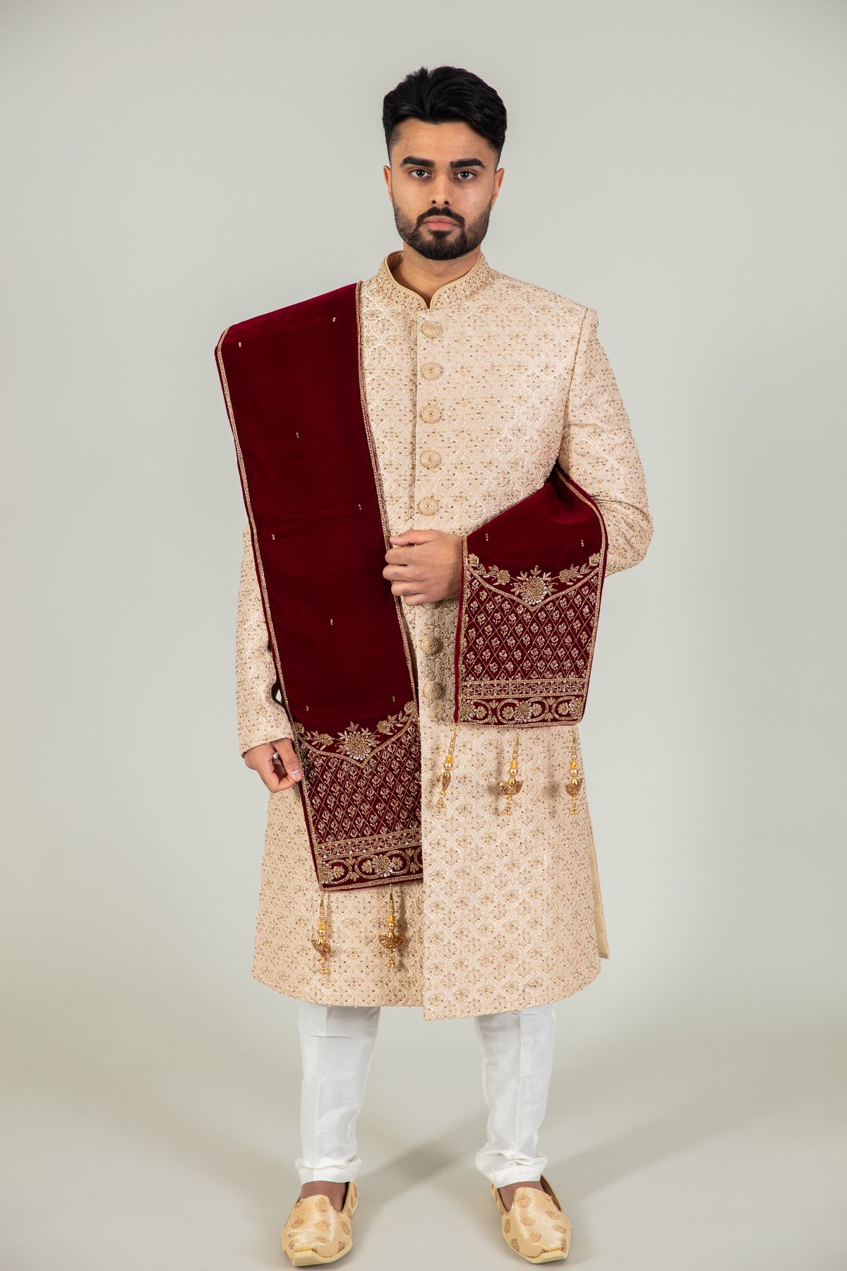 The beautiful velvet mens shawl features luxury beaded embroidery along with thread-work embroidery throughout, finished with dangling tassels from the border.