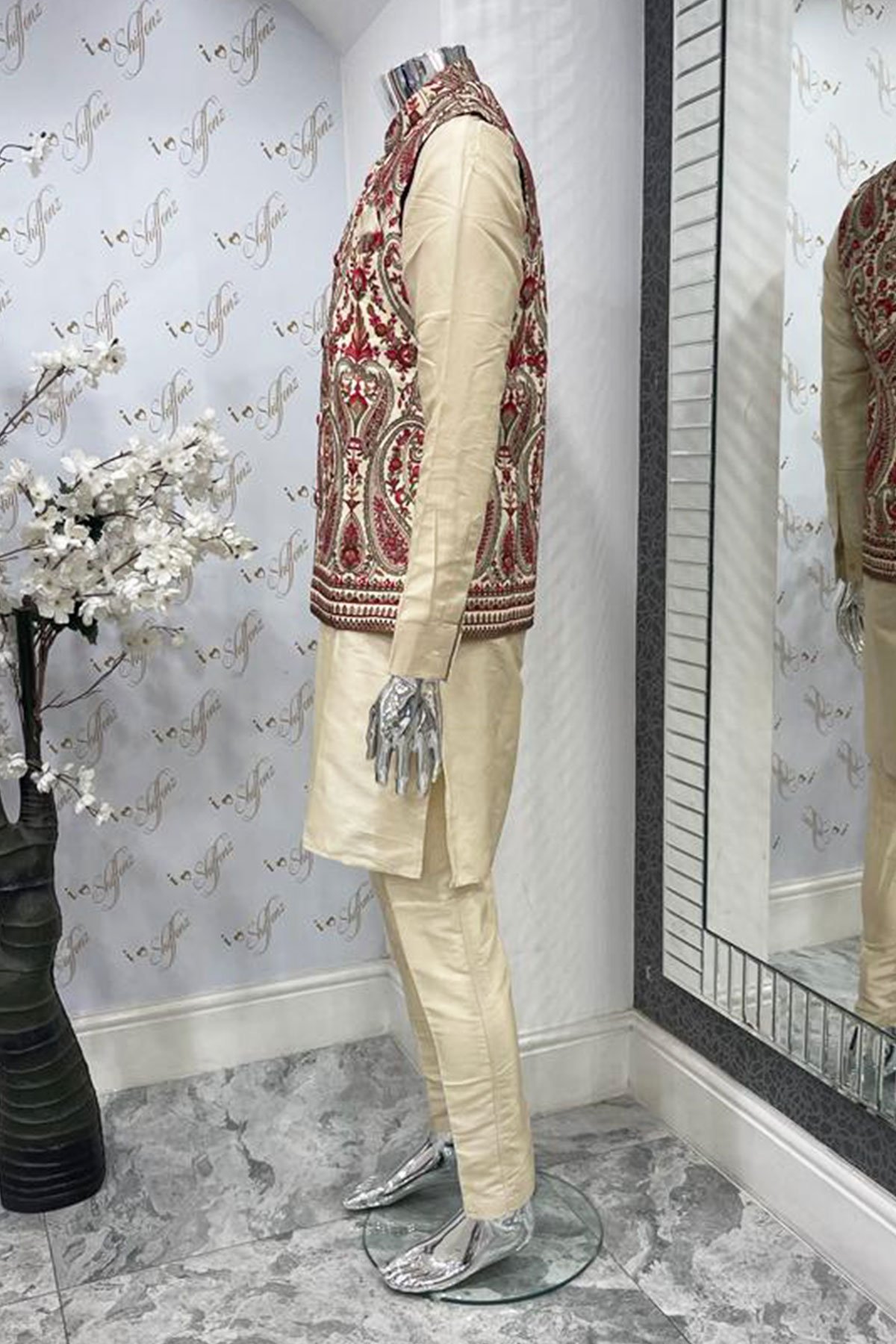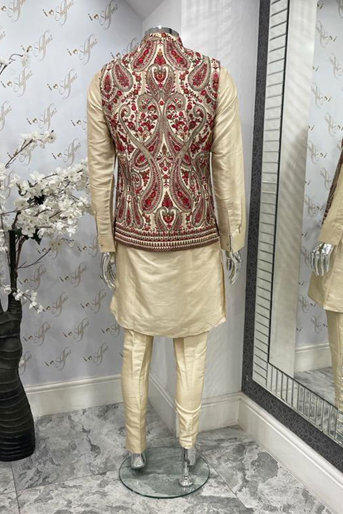 This beautiful 3 piece men’s suit features a silk long loose shirt almost reaching the knees work with full length sleeves, finished with a luxury multi coloured printed waistcoat with button embellishments along the middle and an embroidered collar, whereas the pyjama is a lightweight drawstring trouser.
