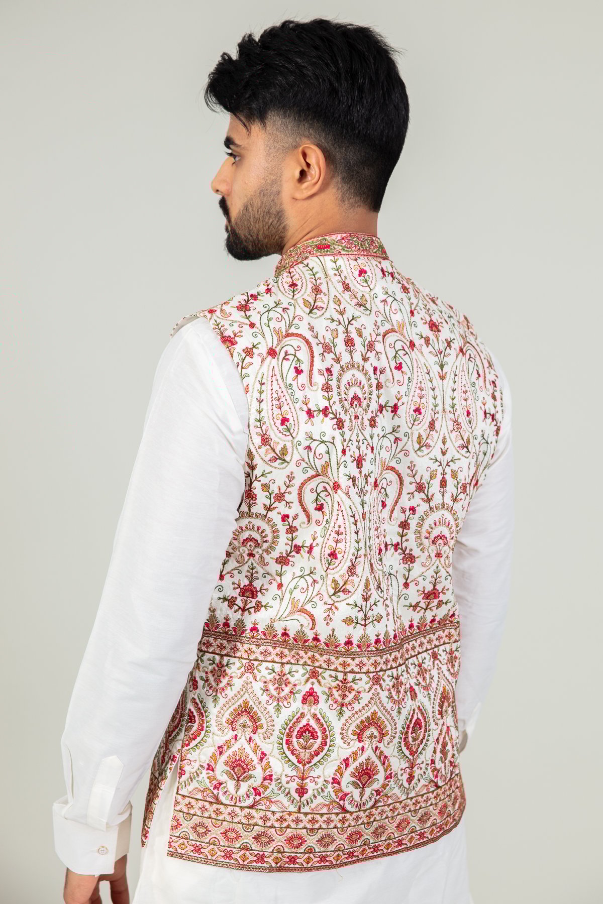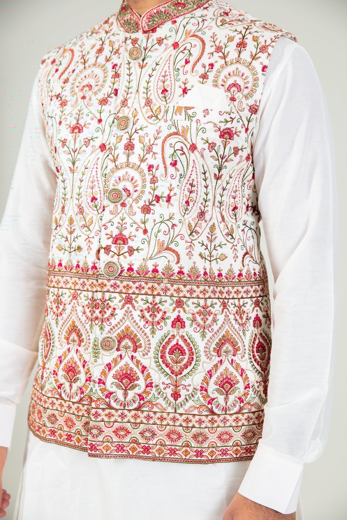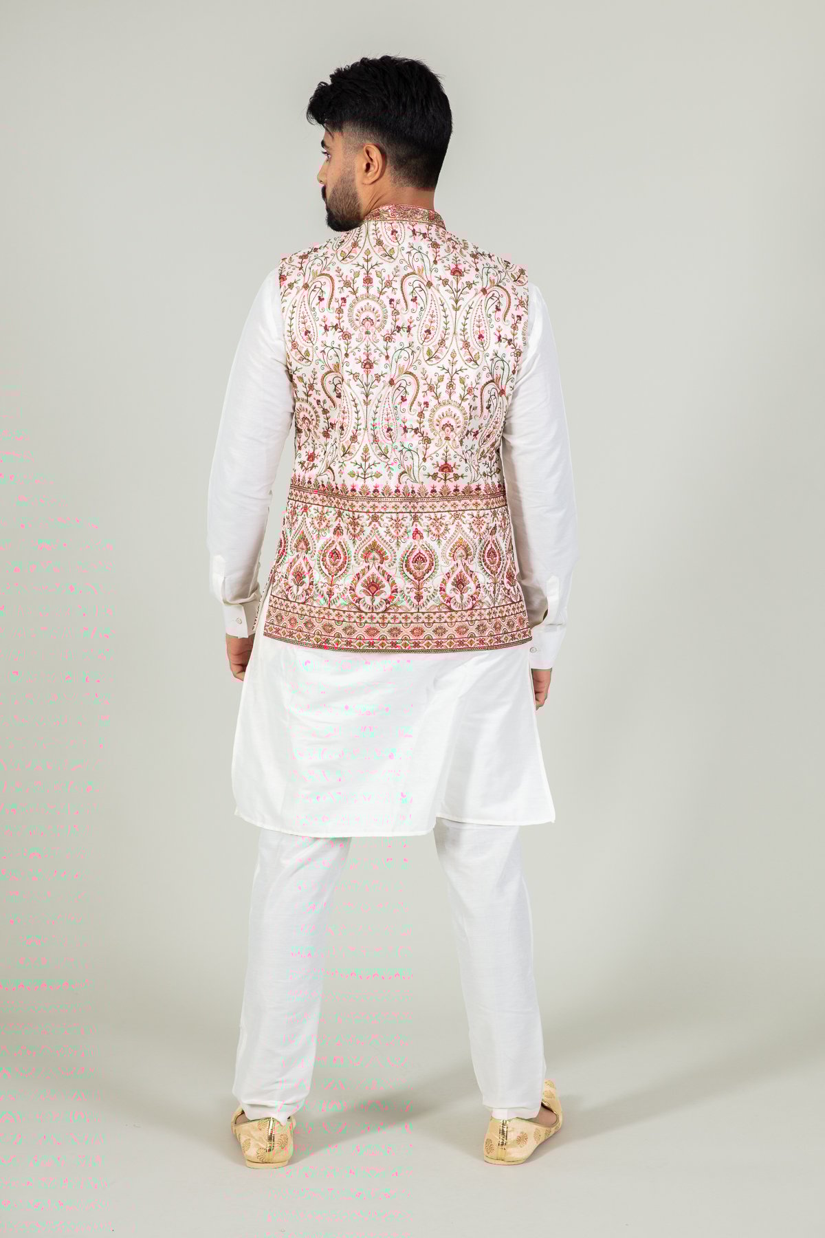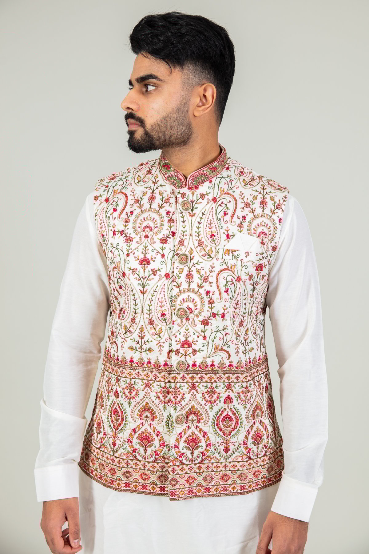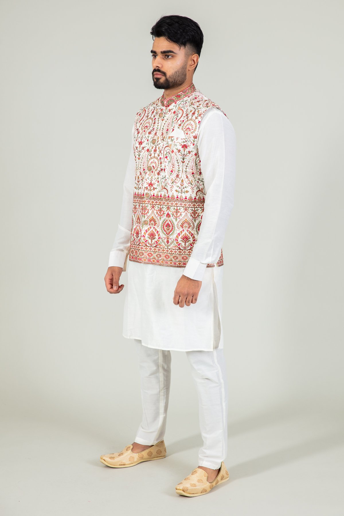 This beautiful 3 piece men’s suit features a silk long loose shirt almost reaching the knees work with full length sleeves, finished with a luxury printed waistcoat with button embellishments along the middle and an embroidered collar, whereas the pyjama is a lightweight drawstring trouser.