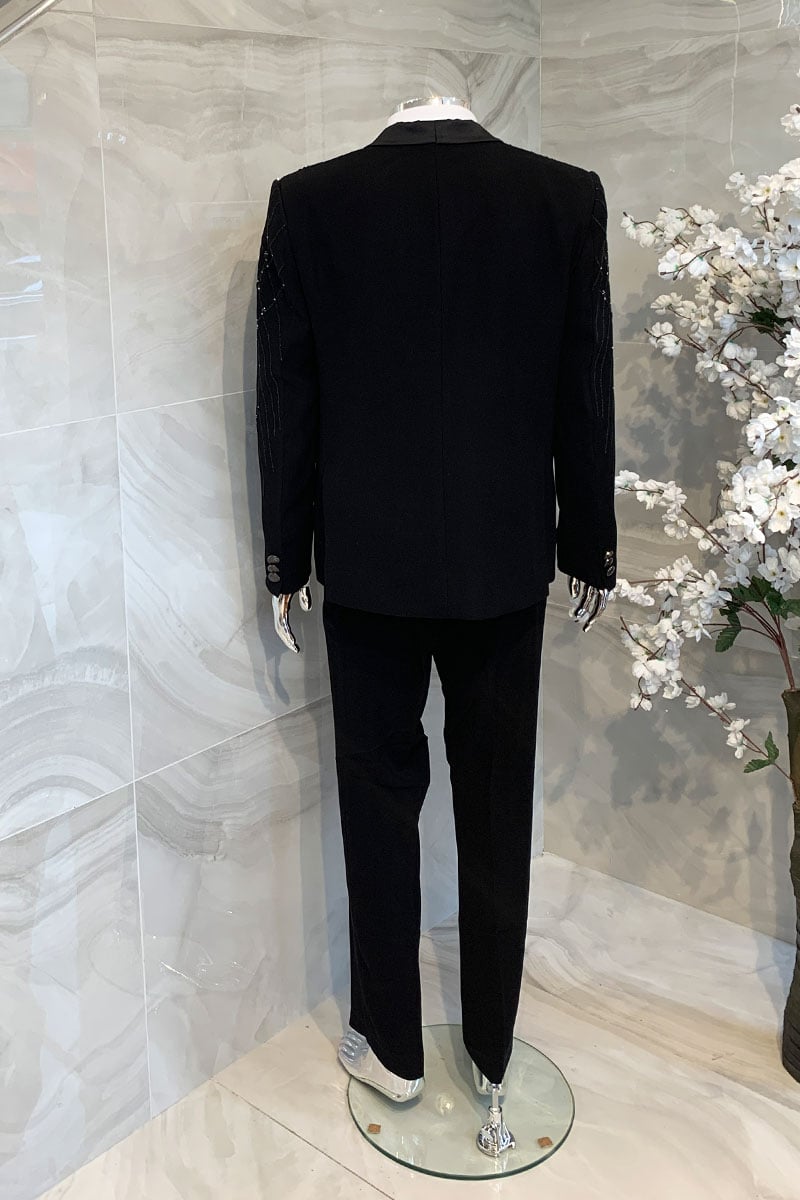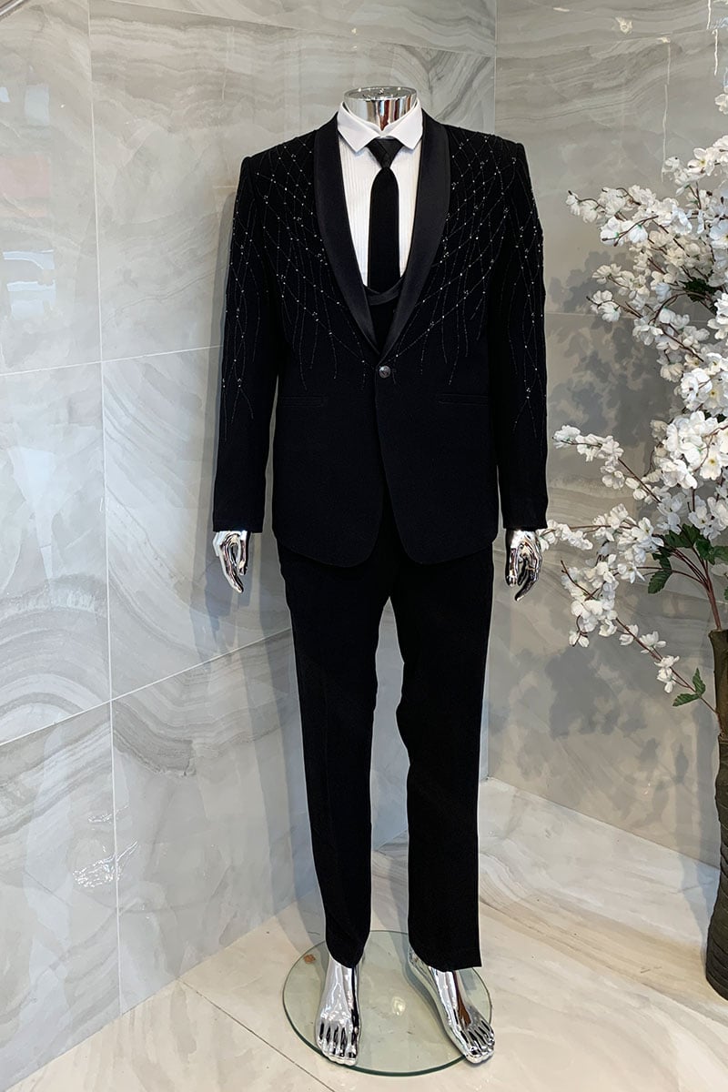 This luxury men’s tailored suit features a stretchy nylon black with thread and beaded embroidery along the front with tuxedo collar. It comes with a white shirt along with tie and waistcoat. The look is finished with tailored trousers.