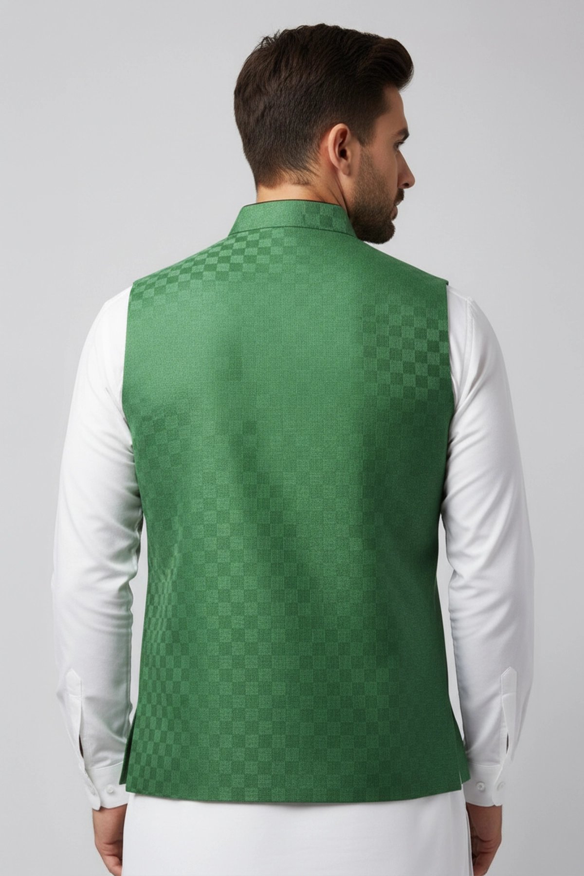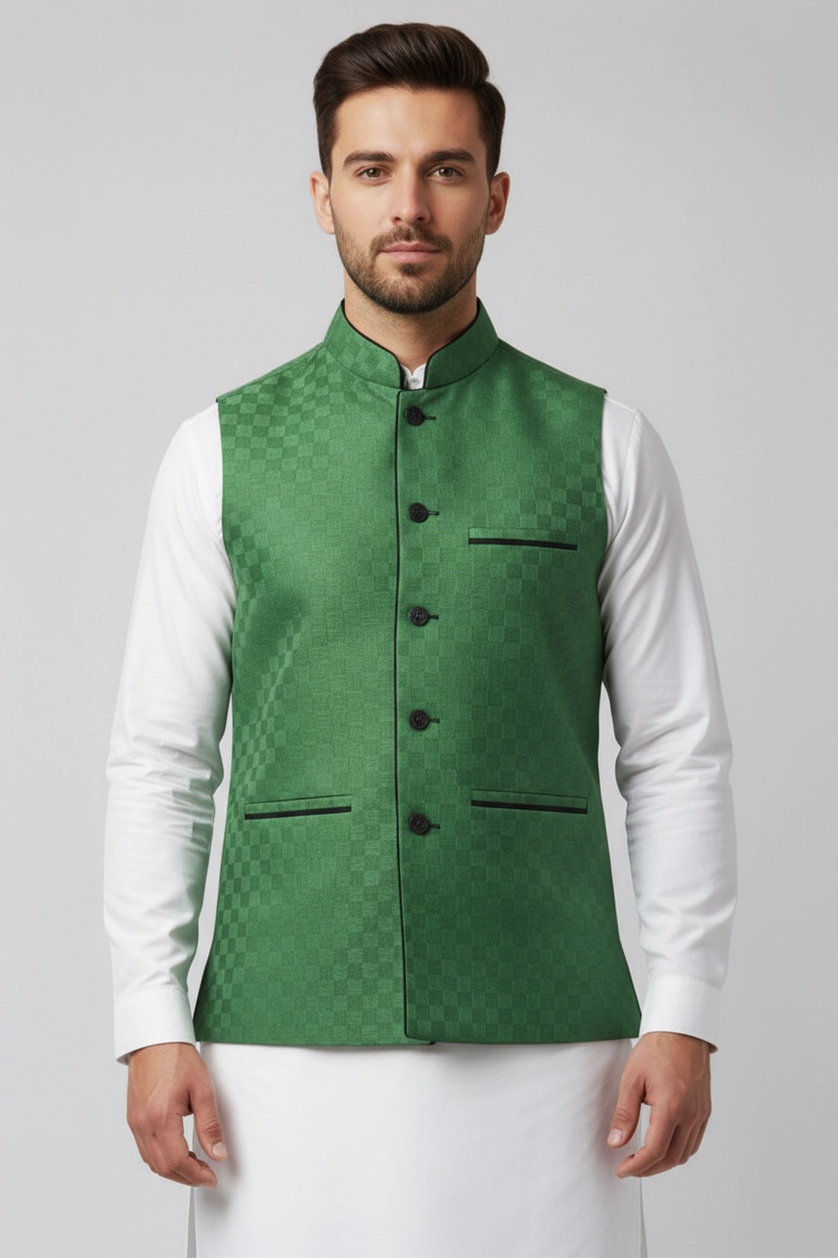 This elegant waistcoat is crafted from high‑quality poly viscose fabric, featuring a subtle check‑patterned weave that adds texture and refinement to the design. It is finished with moulded buttons, contrasting black piping, and a classic mandarin collar, paired with a straight cut that sits comfortably across the chest before tapering slightly at the waist to create a broad‑shoulder, slim‑waist silhouette. Perfect for formal occasions or for layering over simple traditional attire, this waistcoat delivers a sophisticated and timeless look. Note: Kurta pyjama shown in the picture is not included. This image is used for reference; slight design variants may occur.