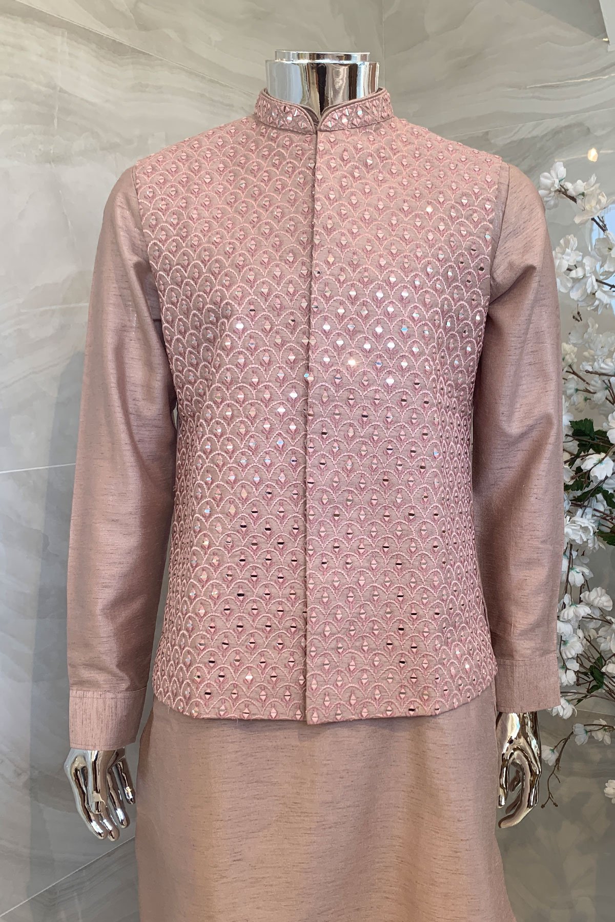 Men’s 3 Piece suit features raw silk kurta pyjama with full length sleeves, finished with a chicken embroidered waistcoat embellished with embroidered button along the front.