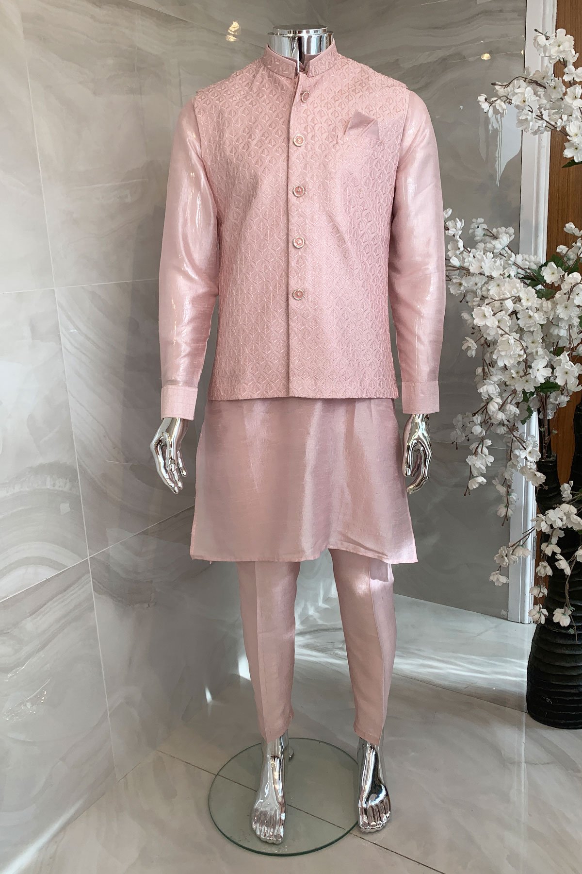 Men’s 3 Piece suit features raw silk kurta pyjama with full length sleeves, finished with a chikan embroidered waistcoat embellished with embroidered button along the front.