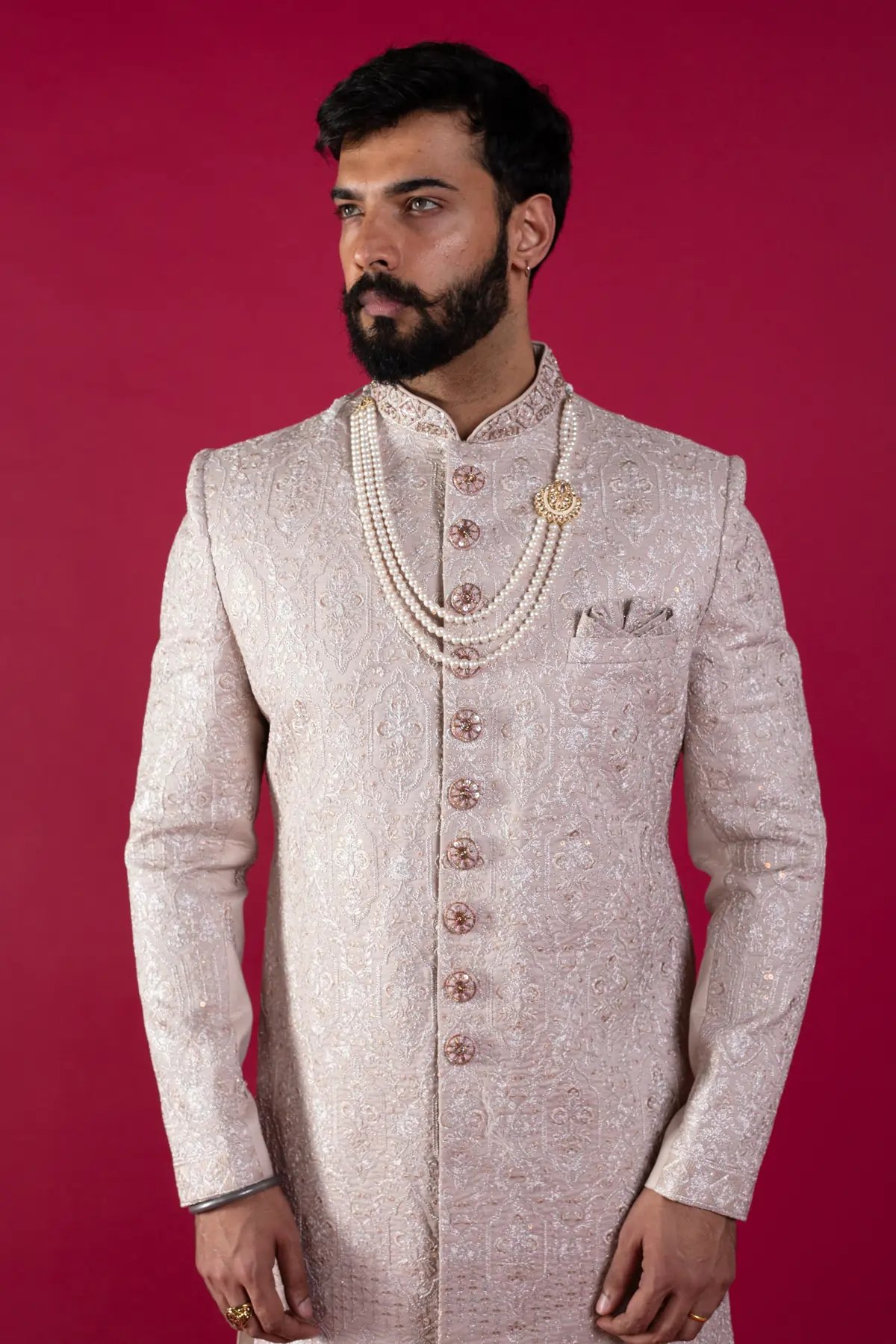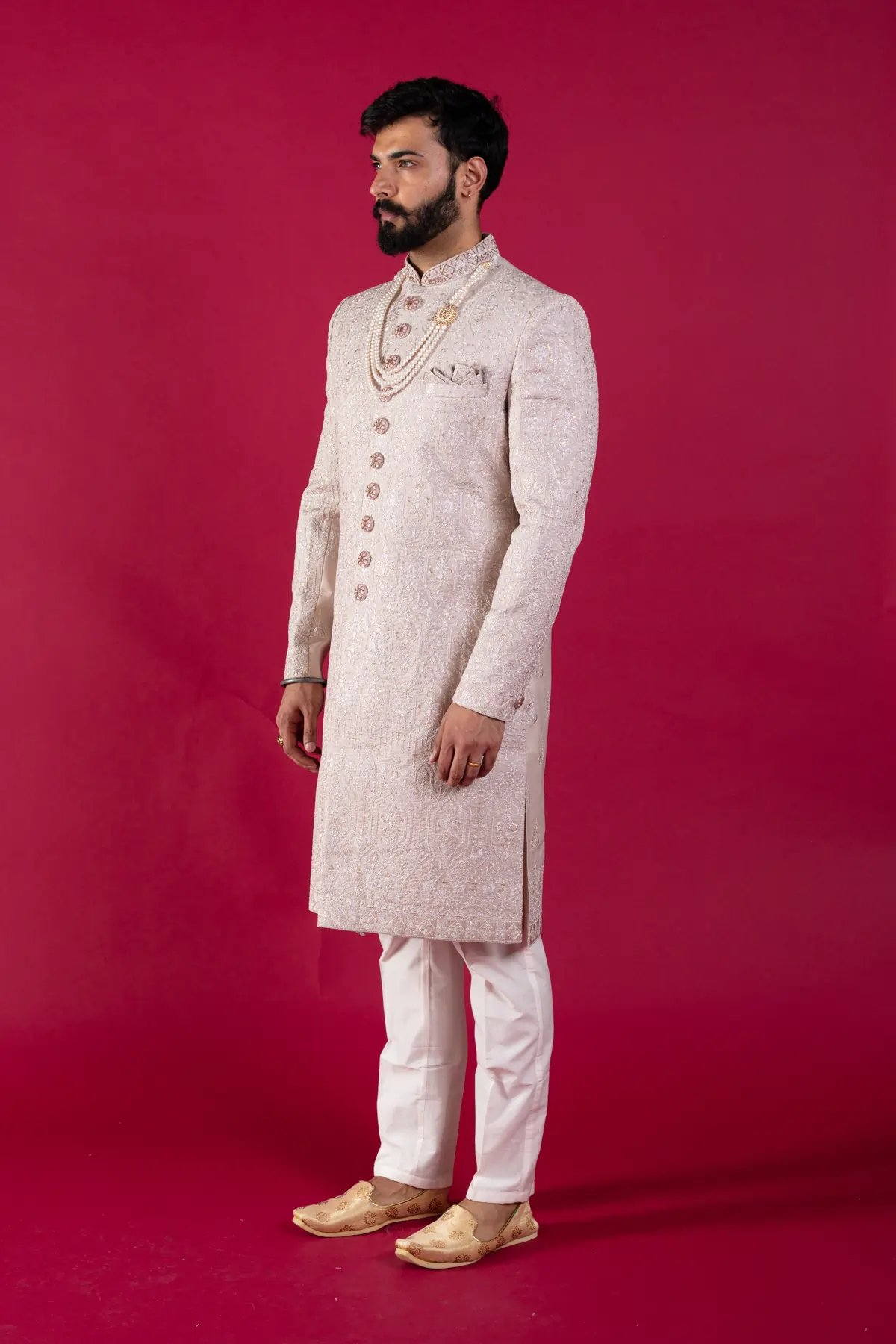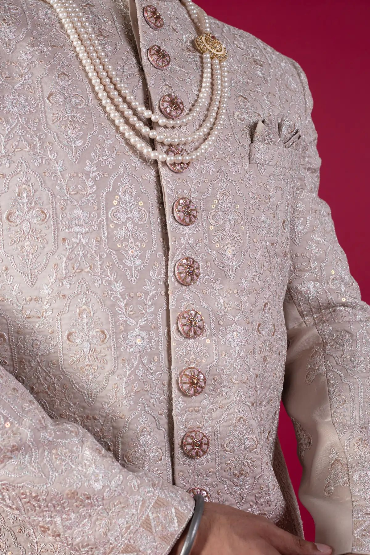 This sherwani set showcases exquisite patterns, offering a blend of classic beauty and elegance. The sherwani is accentuated with embellished buttons and thread work, enhancing its ornate design. The set includes an intricately embroidered bandhgala collar, adding to its sophisticated charm. Perfect for special occasions and cultural ceremonies, Paired with raw silk trousers and a pearl maala for a complete and opulent look.