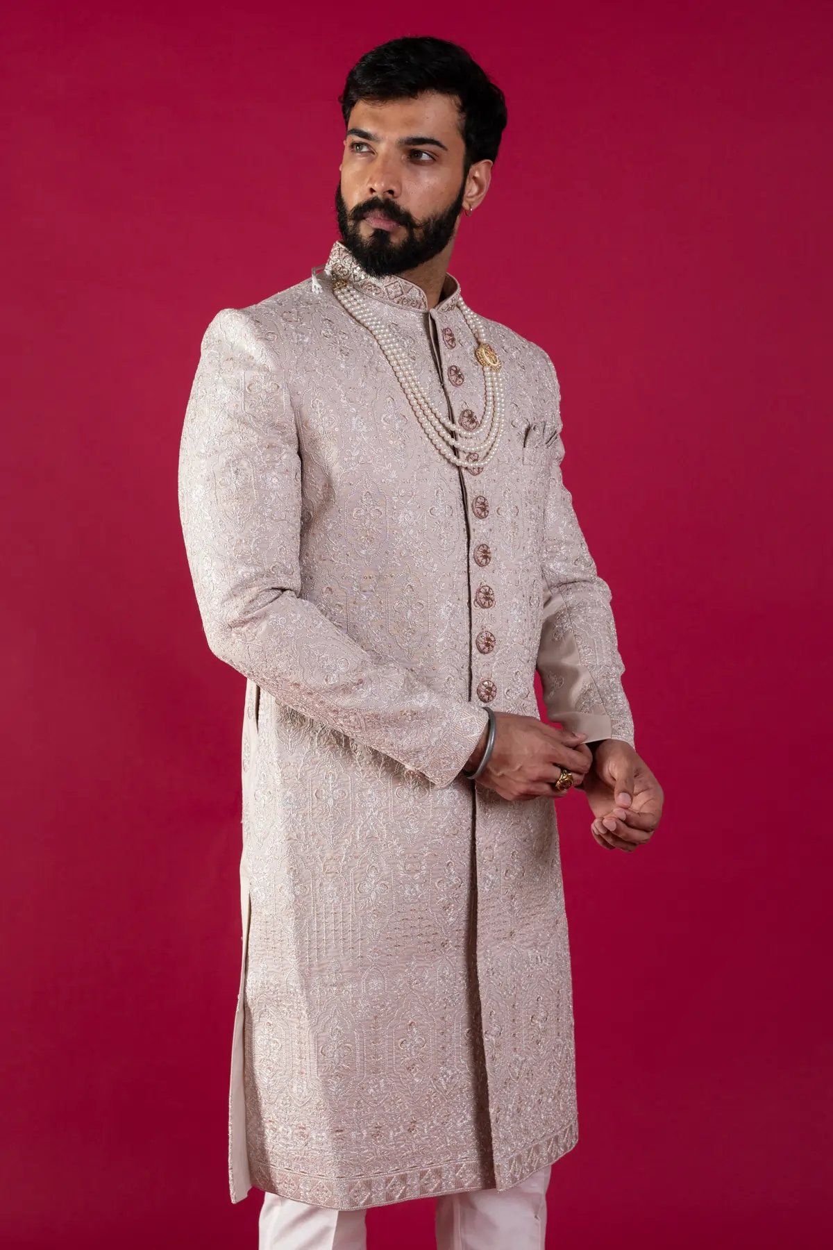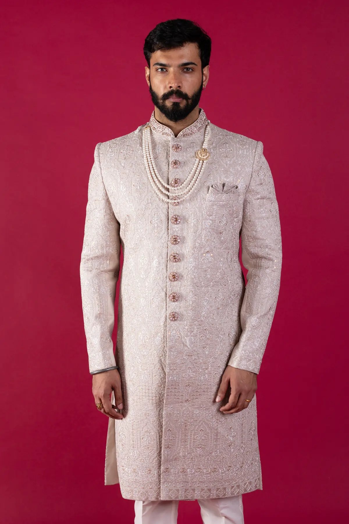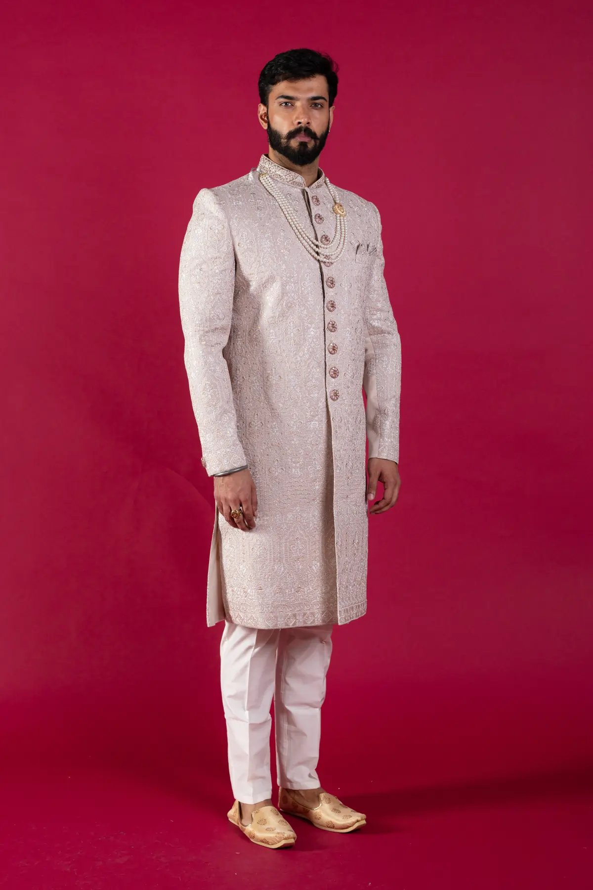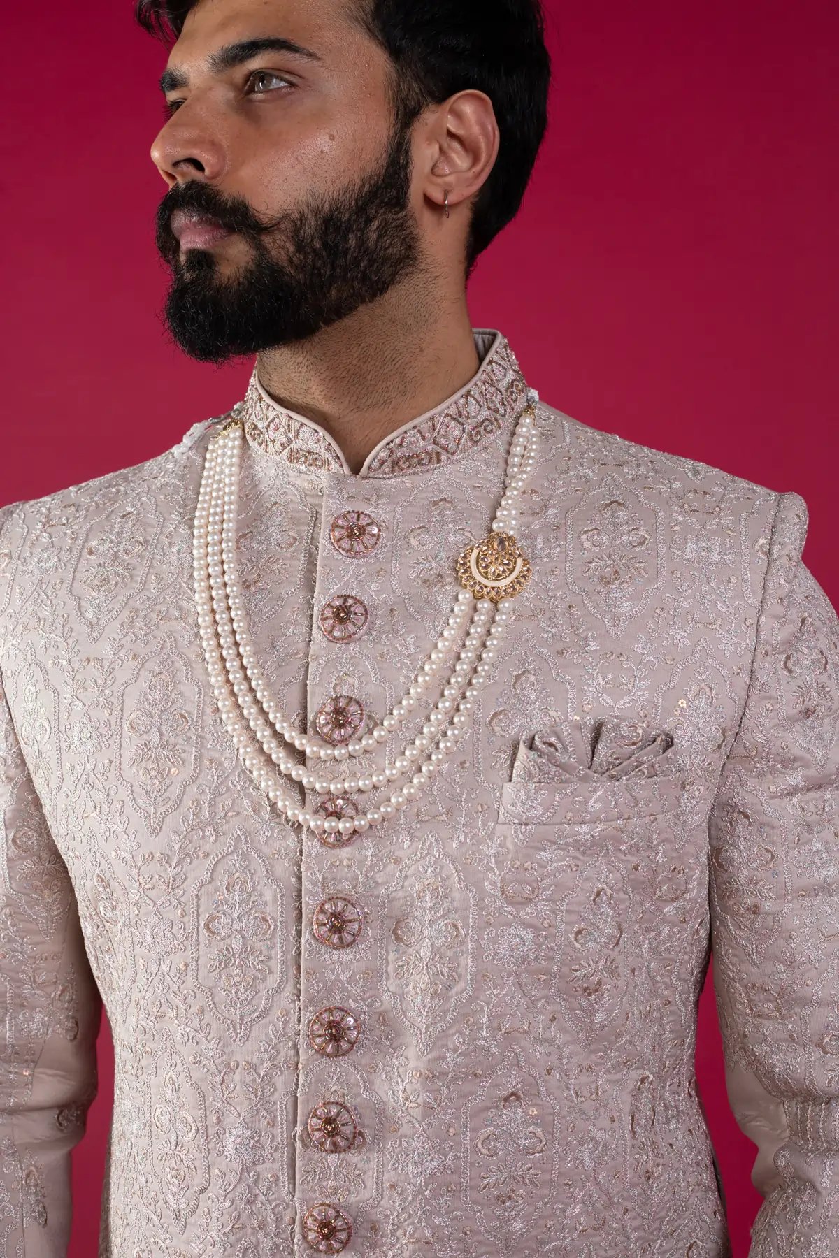 This sherwani set showcases exquisite patterns, offering a blend of classic beauty and elegance. The sherwani is accentuated with embellished buttons and thread work, enhancing its ornate design. The set includes an intricately embroidered bandhgala collar, adding to its sophisticated charm. Perfect for special occasions and cultural ceremonies, Paired with raw silk trousers and a pearl maala for a complete and opulent look.