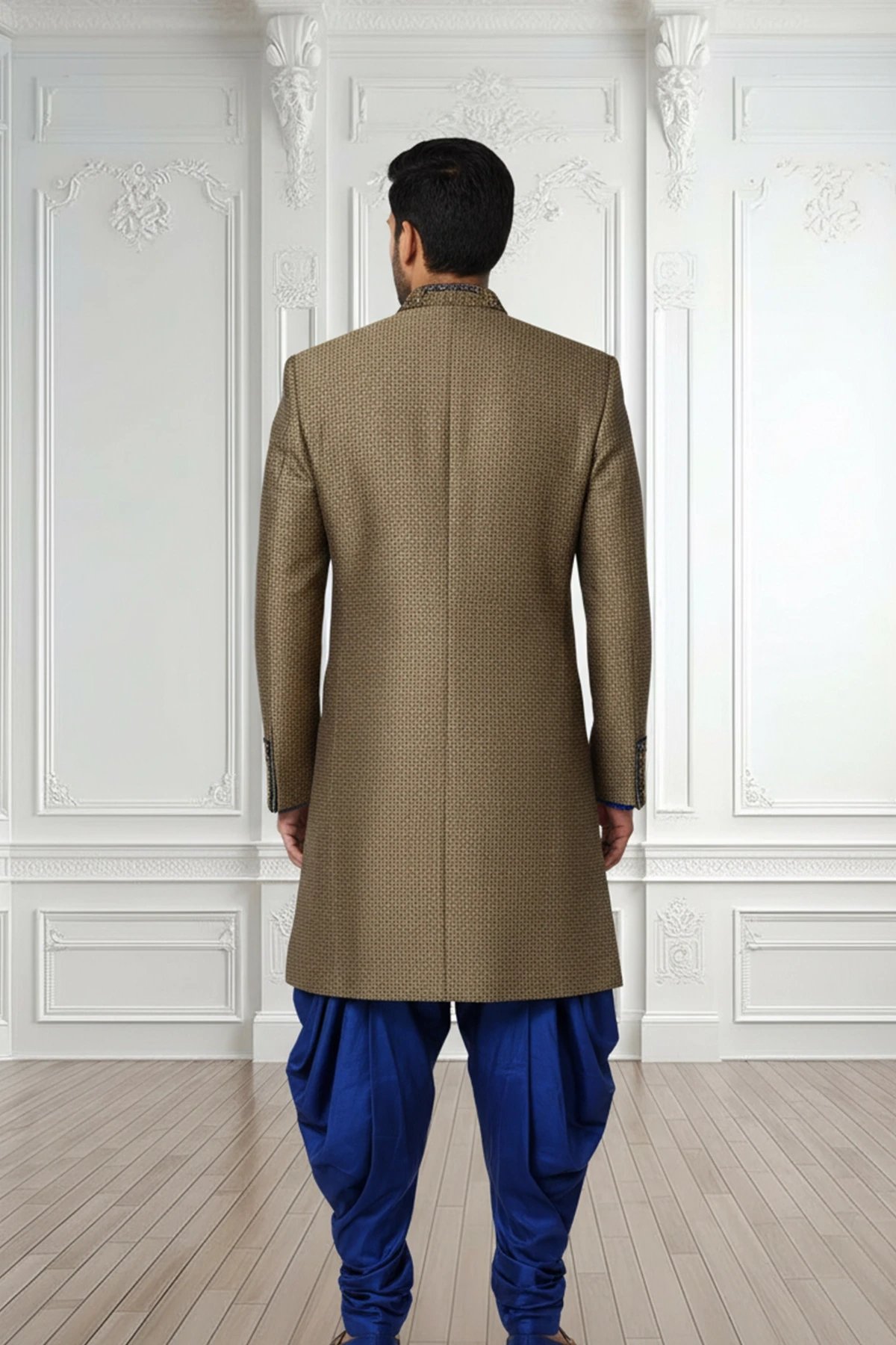 This sophisticated sherwani features a rich golden-brown textured fabric enhanced with sleek navy piping along the front placket and collar. Detailed cuff accents and a matching pocket square add a refined contrast, while the deep blue shalwar completes the regal look. Perfect for festive occasions and wedding celebrations, it blends tradition with modern elegance.