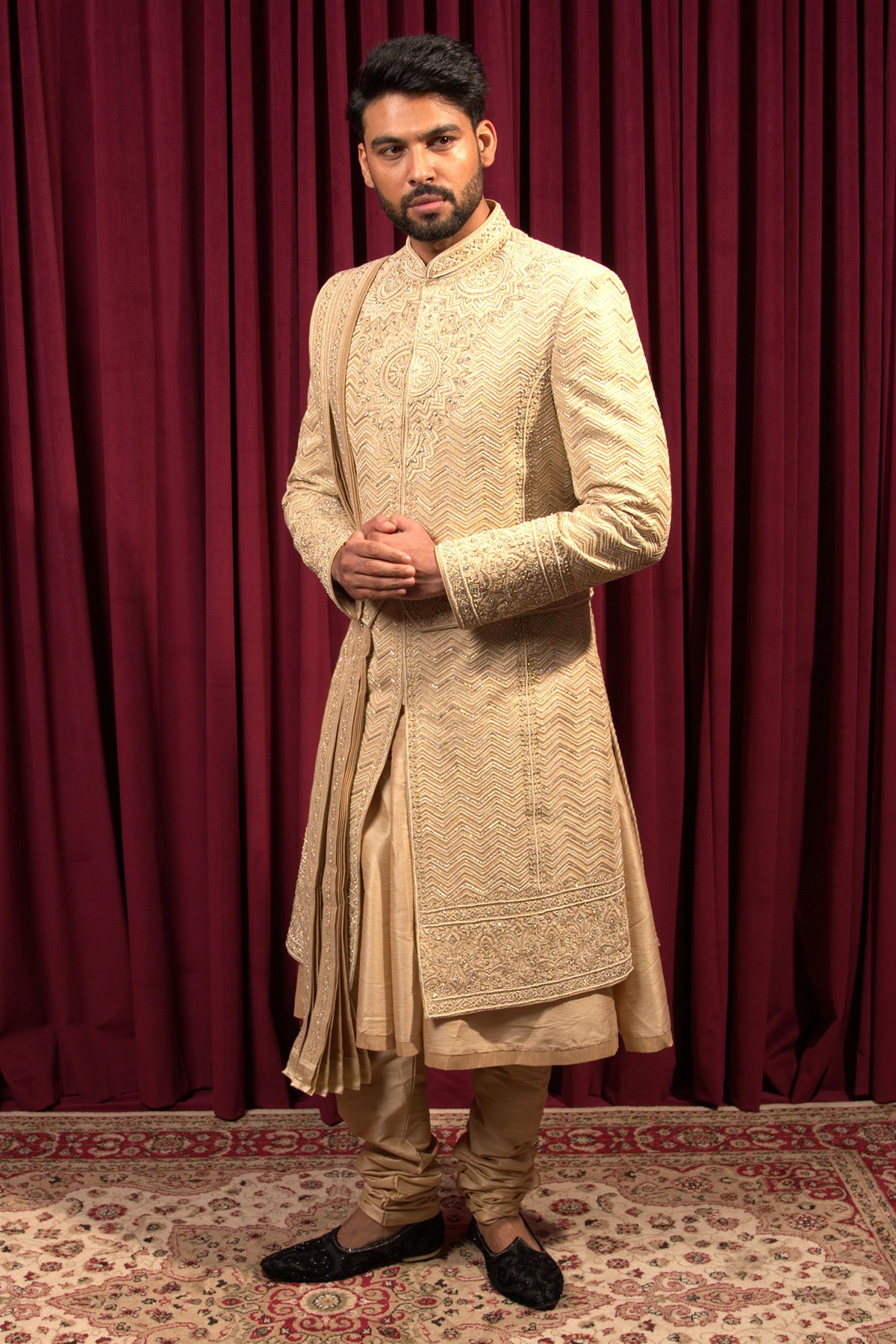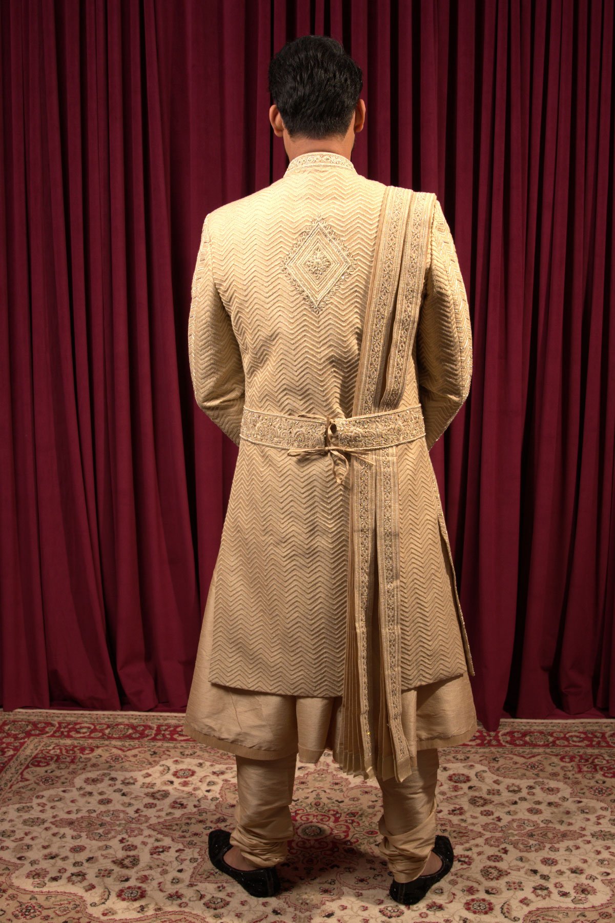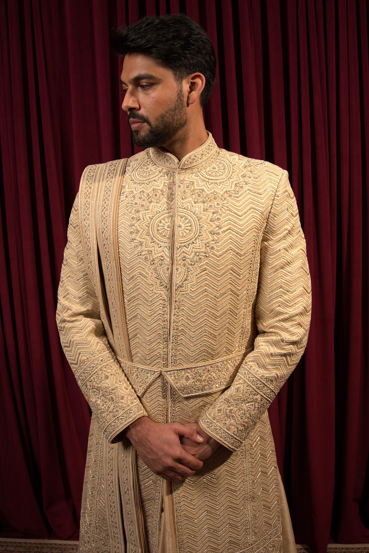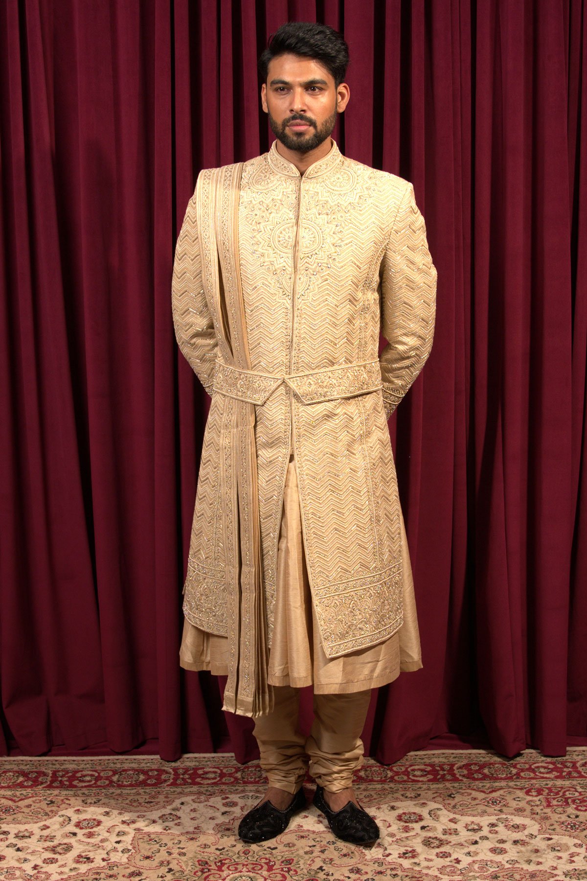 Men’s sherwani featuring luxury thread work embroidery along with beads and scattered diamante’s throughout, finished with an embroidered belt to enhance the waist and a peplum inner shirt in raw silk. It comes with raw silk trousers and an embroidered dupatta to complete the groom look.