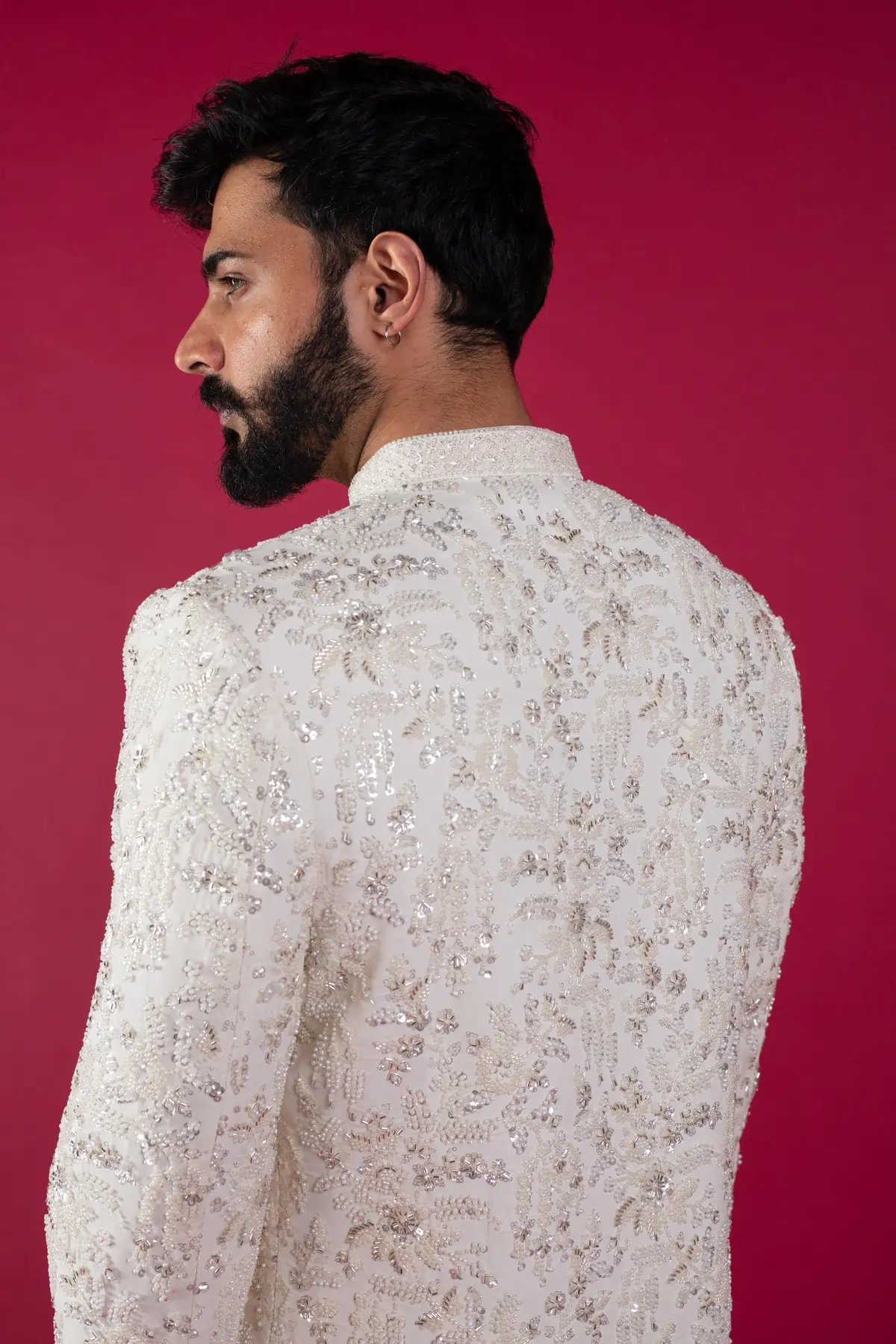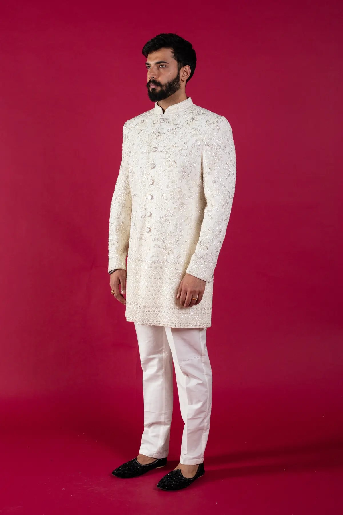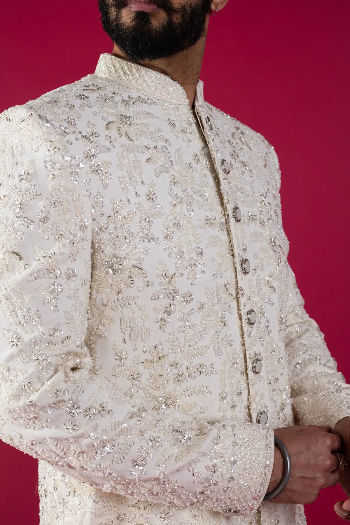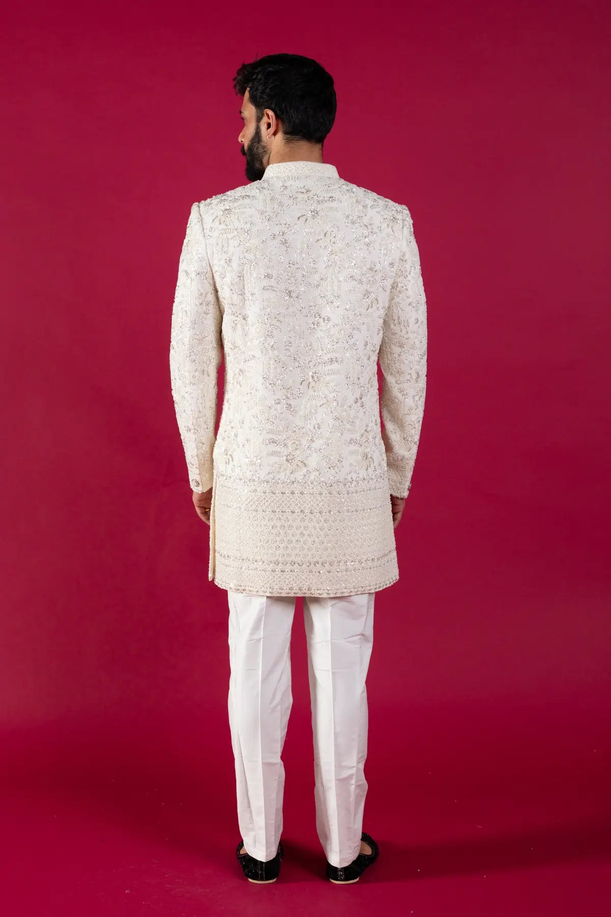 Step into sophistication with this embroidered patterned indo western set. Featuring a rich white hue and intricate ogee patterns, this set combines elegance with a modern twist with the detailed button embellishments along the middle. Complete your look with raw silk trousers to elevate your ensemble and make a lasting impression at any celebration.