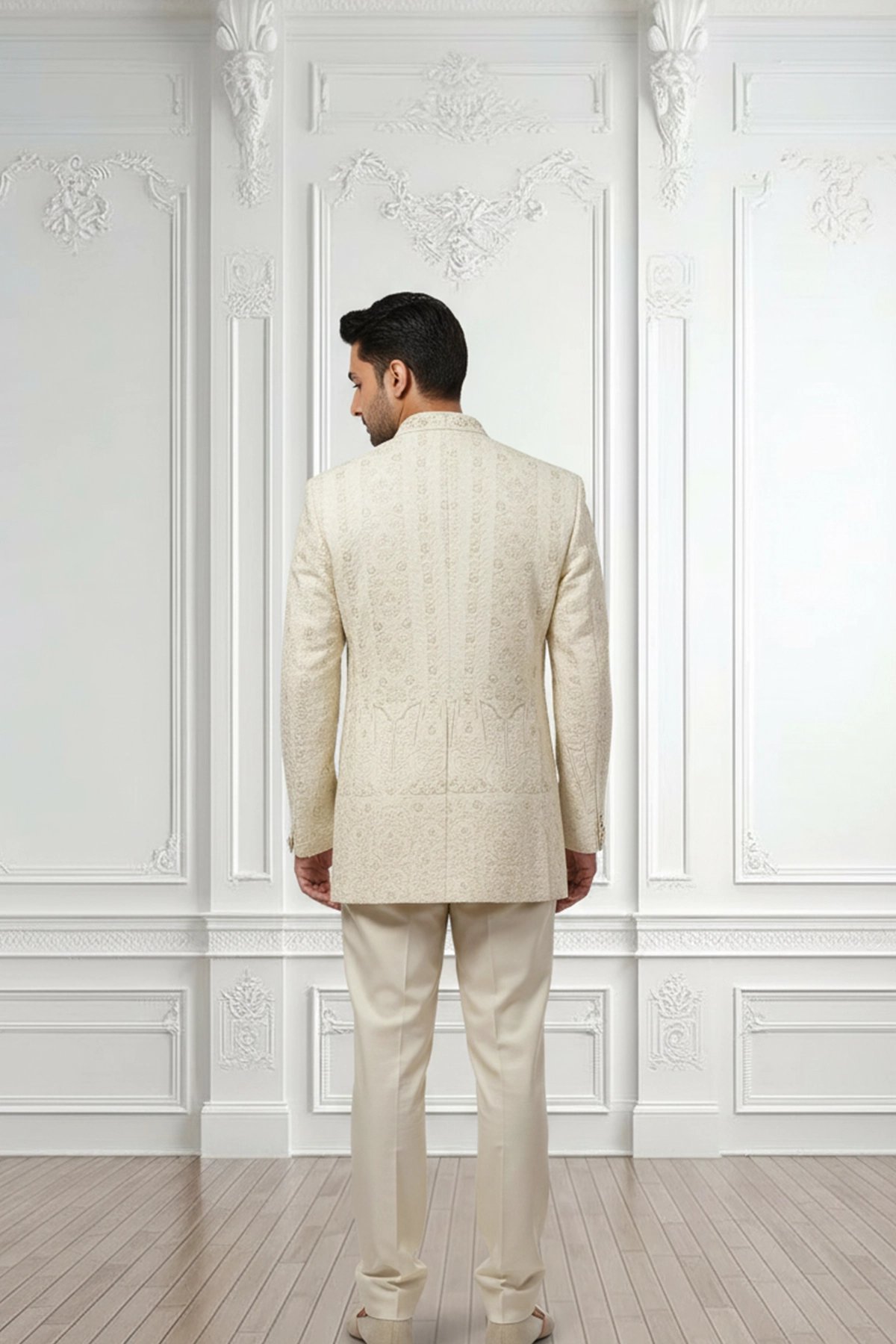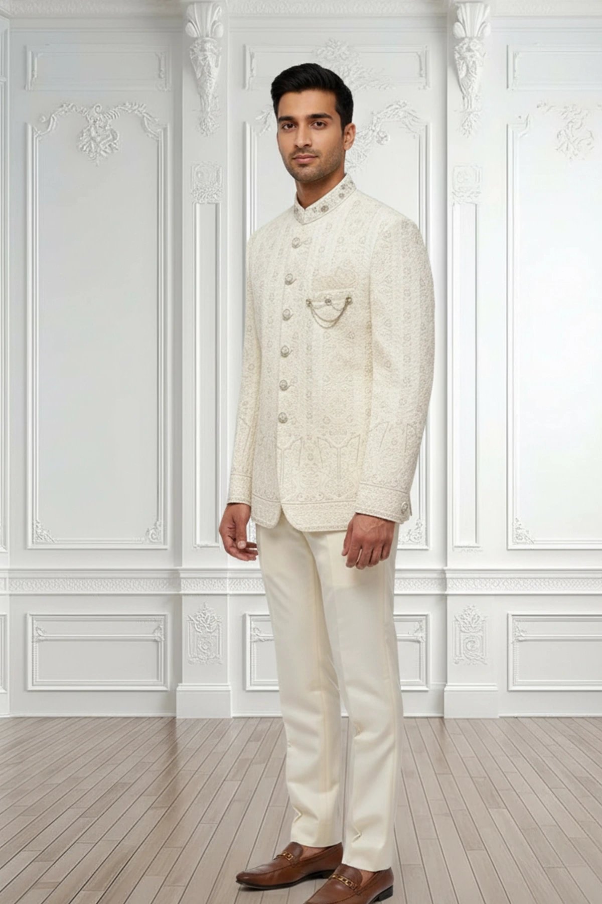 This elegant cream sherwani showcases delicate self-embroidered patterns that create a subtle yet luxurious texture. Designed with a classic band collar, decorative buttons, and a refined chain brooch detail, it exudes timeless sophistication. Paired with matching trousers, it’s a perfect choice for weddings and formal celebrations.