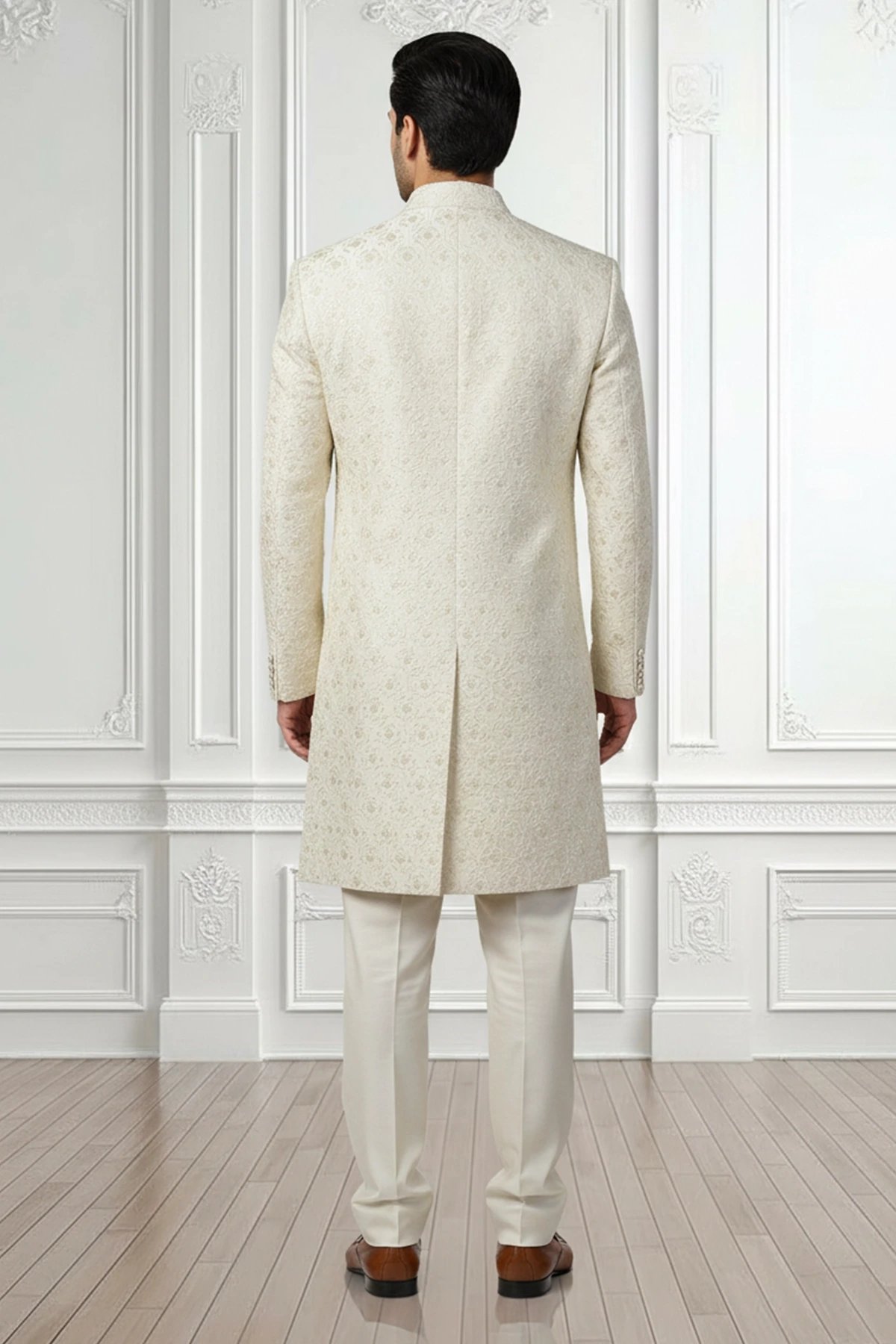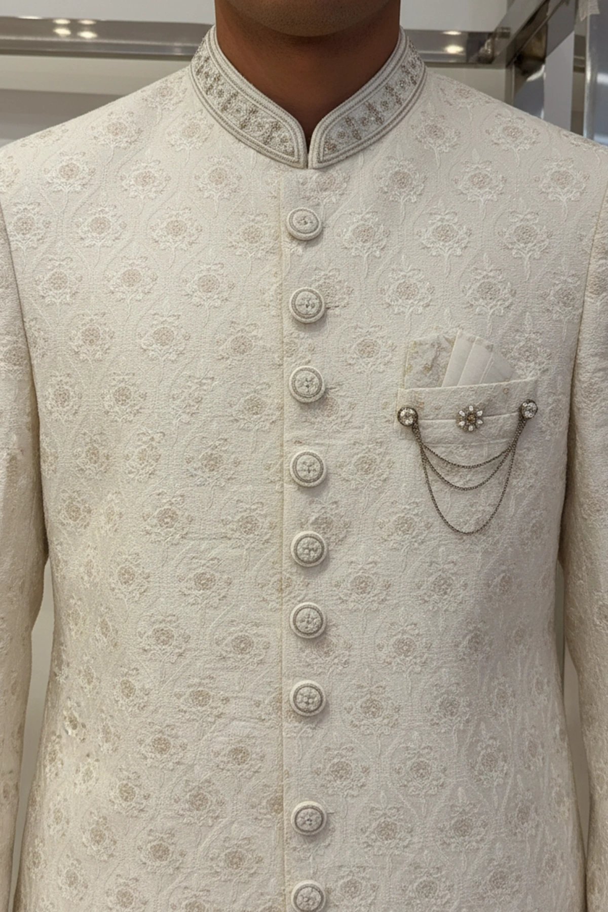 This ivory sherwani features intricate all-over floral embroidery on a subtly textured fabric, giving it a refined and luxurious finish. It is tailored in a structured, knee-length silhouette with a sharp mandarin collar detailed with delicate border work. The front showcases fabric-covered buttons aligned along a clean placket, complemented by a neatly folded pocket square and an elegant brooch chain accent. Paired with slim-fit ivory trousers, the ensemble reflects timeless sophistication and modern craftsmanship.