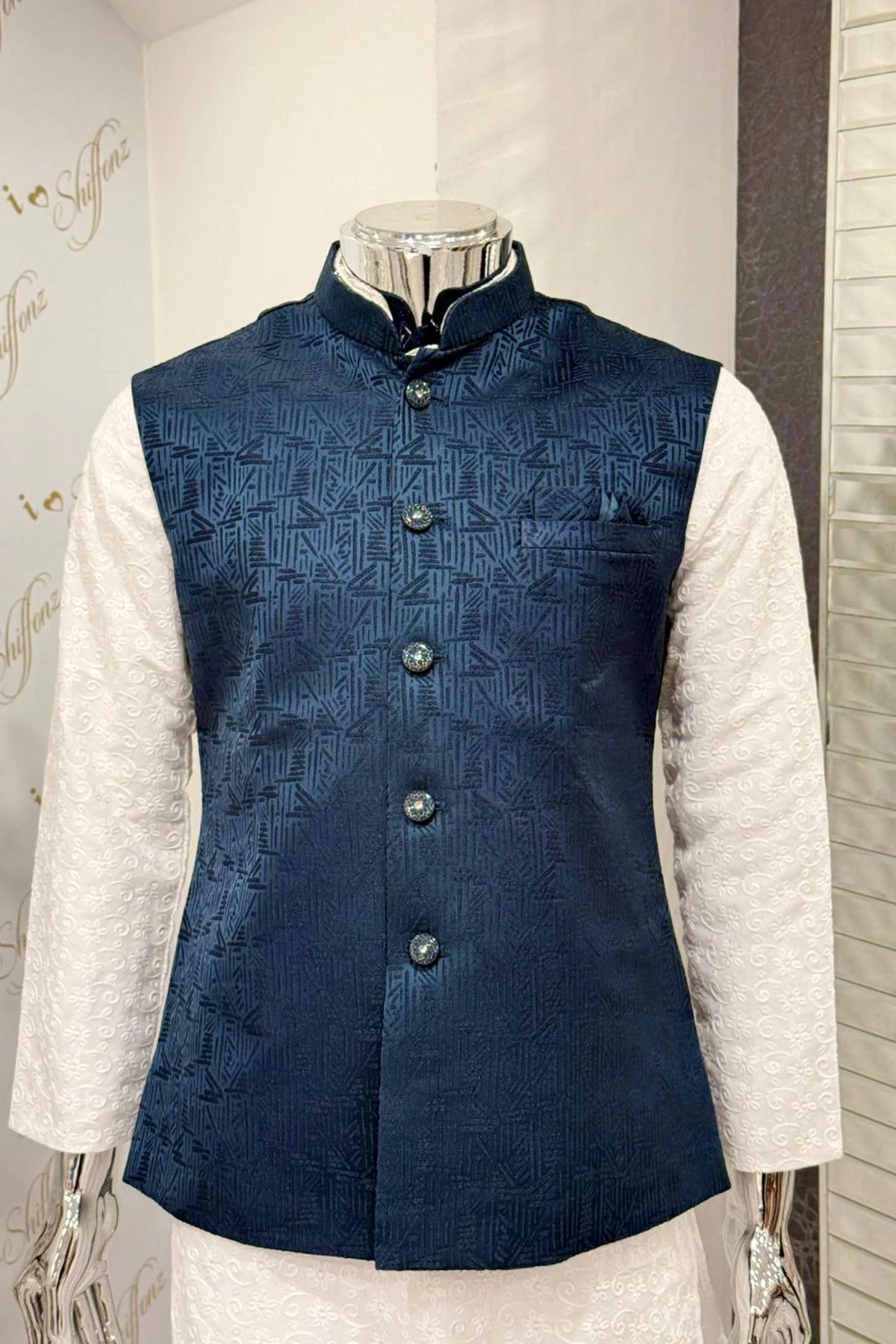 This beautiful waistcoat is crafted from a blend of brocade fabric enhanced by moulded buttons and mandarin collar along with a straight cut that fits easy around the chest and then tapers at the waist creating a broad shoulder-slim waist look. It is perfect for formal occasions as well as layering over basic clothing. Note: Kurta pyjama shown in the picture is not included.