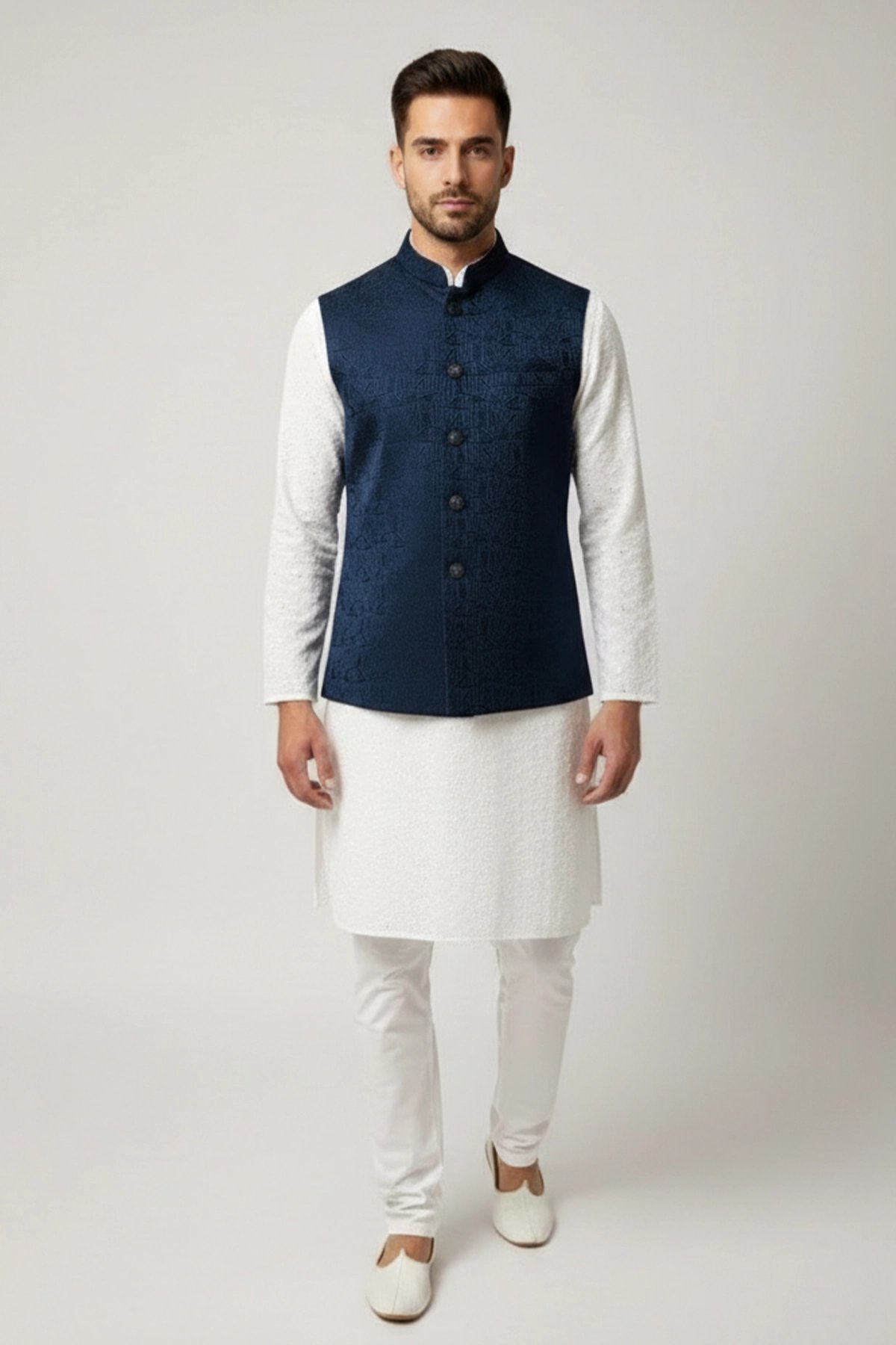This beautiful waistcoat is crafted from a blend of brocade fabric enhanced by moulded buttons and mandarin collar along with a straight cut that fits easy around the chest and then tapers at the waist creating a broad shoulder-slim waist look. It is perfect for formal occasions as well as layering over basic clothing. Note: Kurta pyjama shown in the picture is not included.