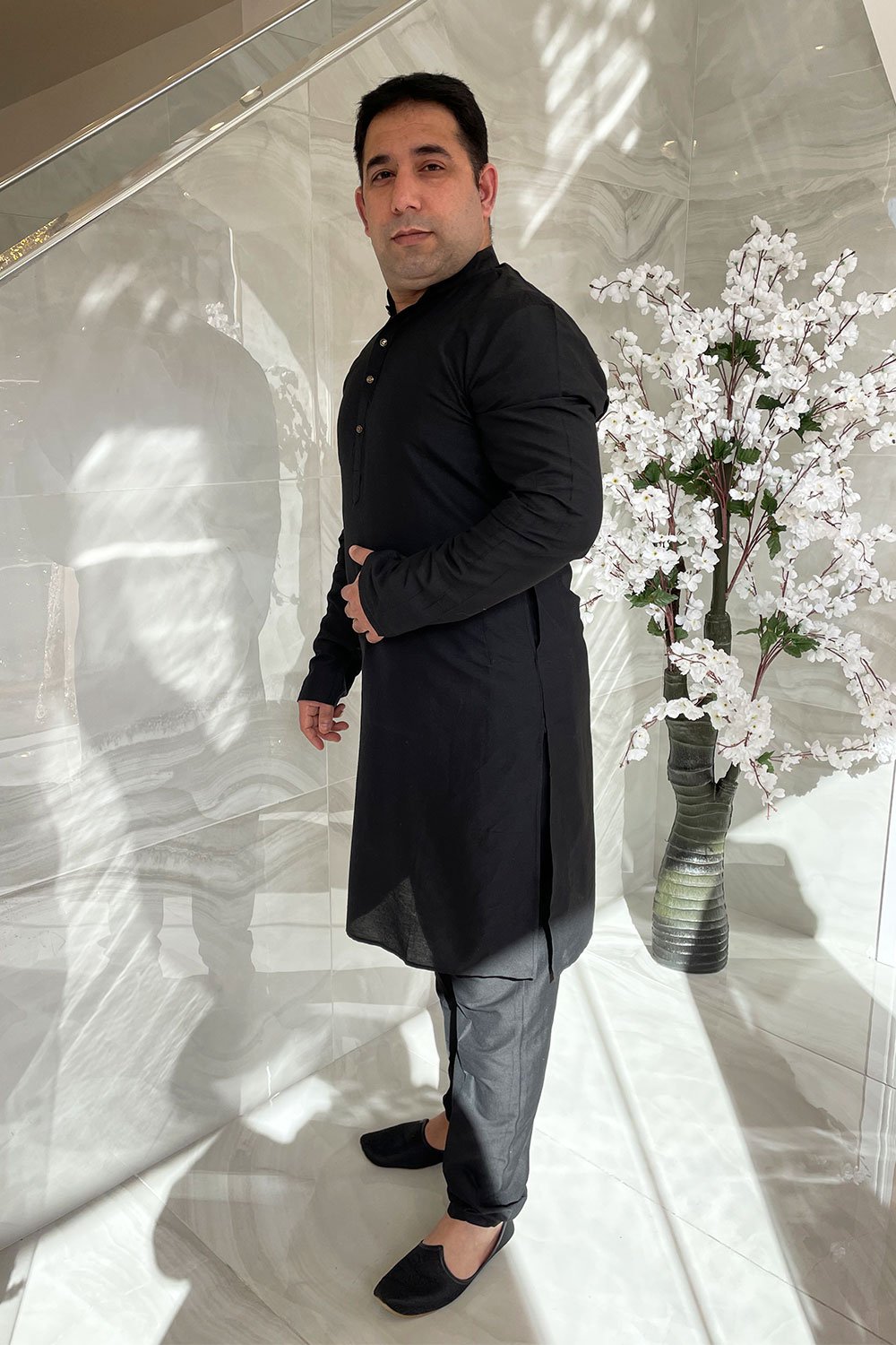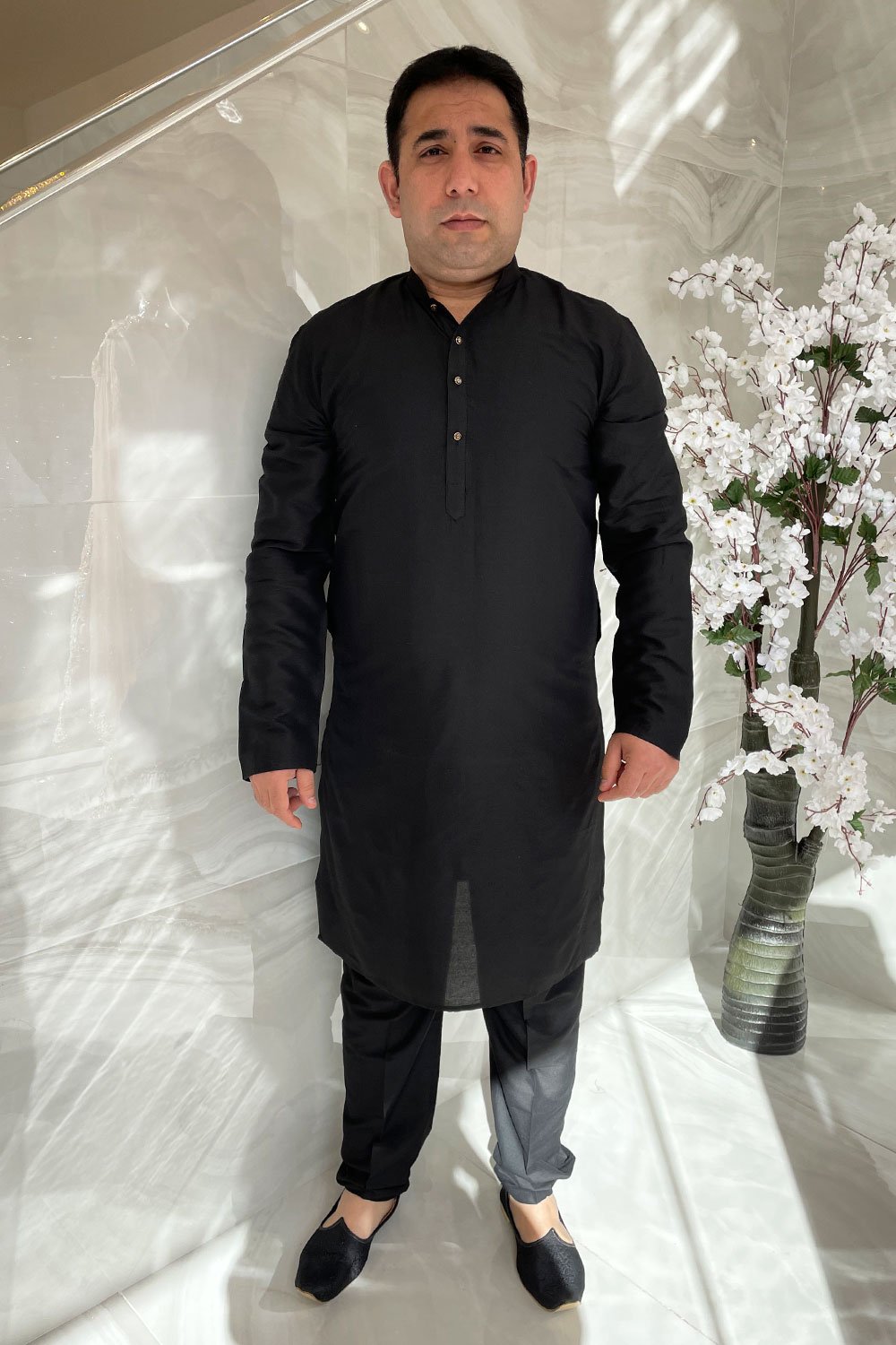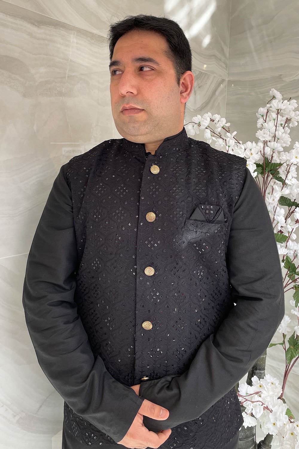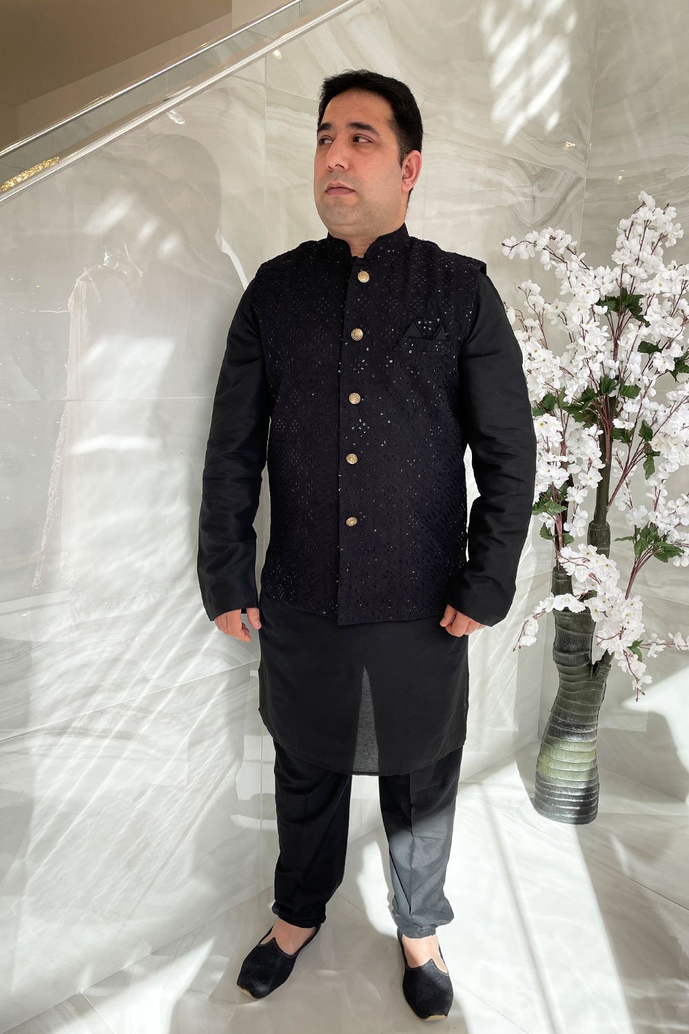 This beautiful 3 piece men’s suit features a straight shirt with button embellishments on the front and it comes with plain trousers, The look is finished with a luxury sequence embroidered waistcoat with button embellishments along the middle.