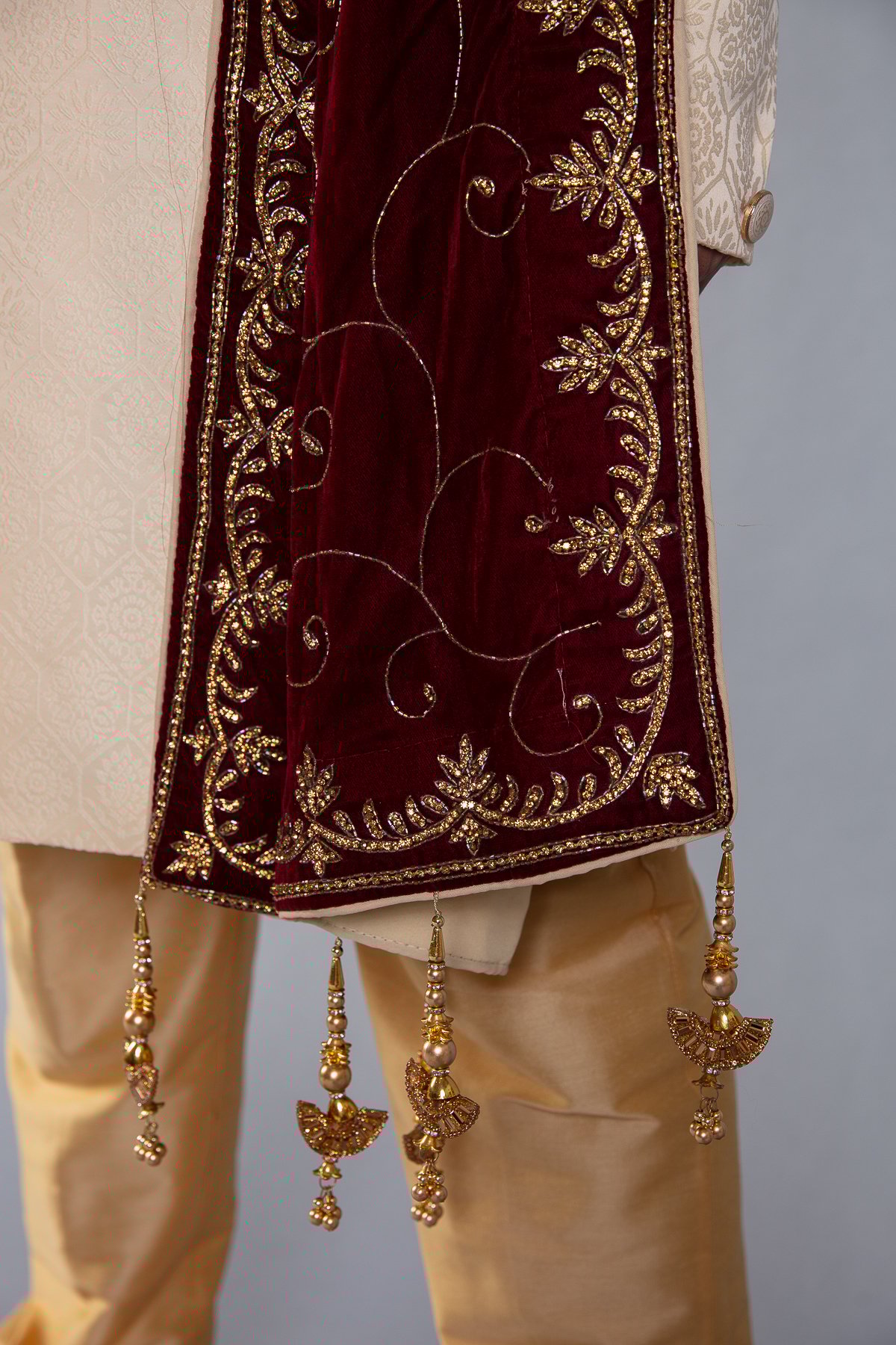 The beautiful velvet mens shawl features luxury beaded embroidery on the borders along with thread-work embroidery throughout.