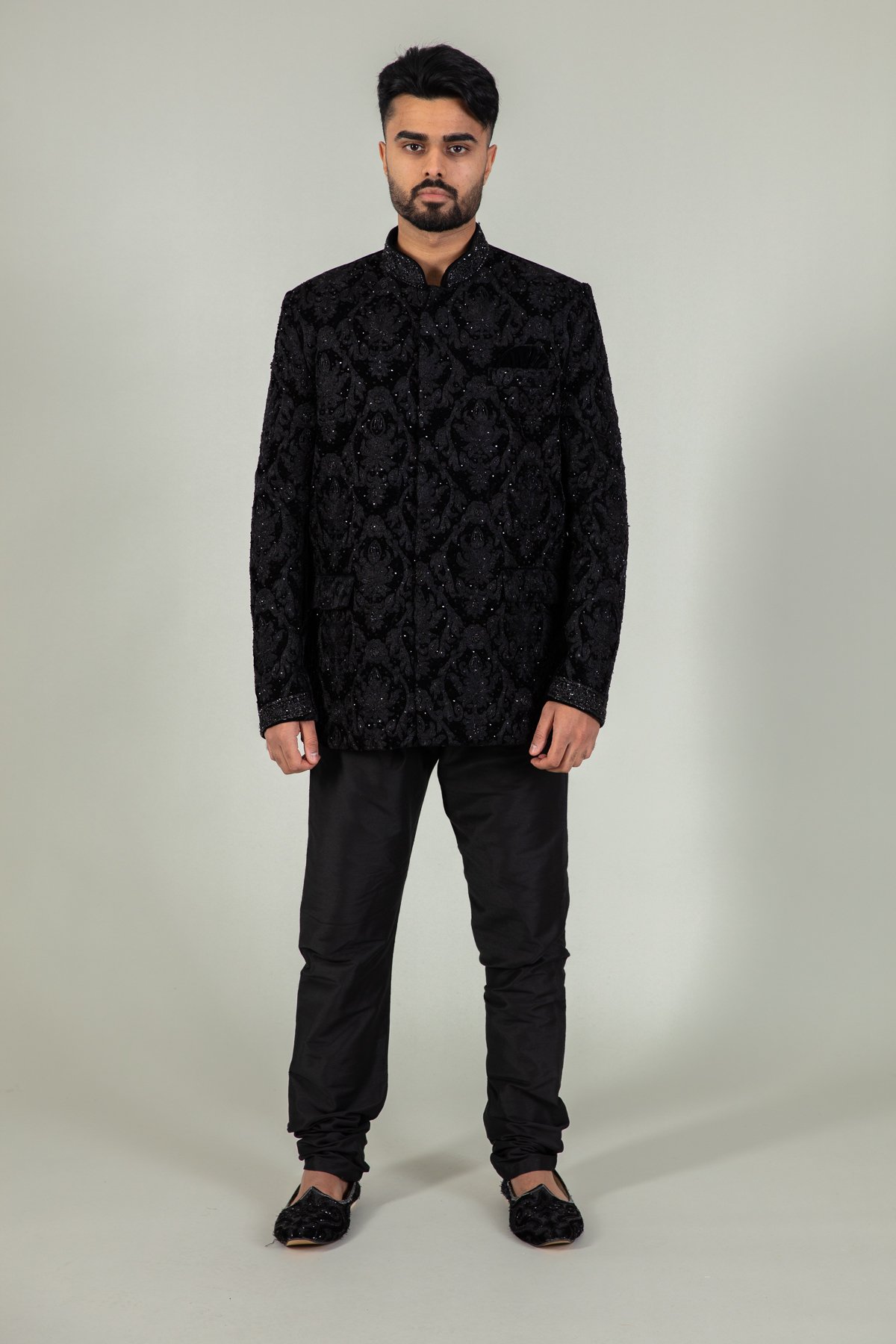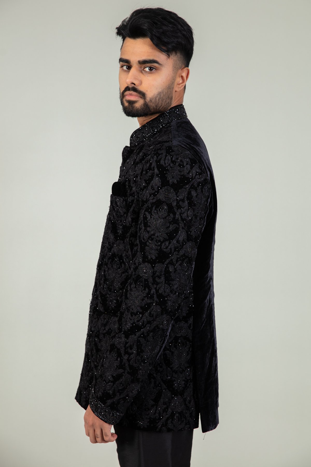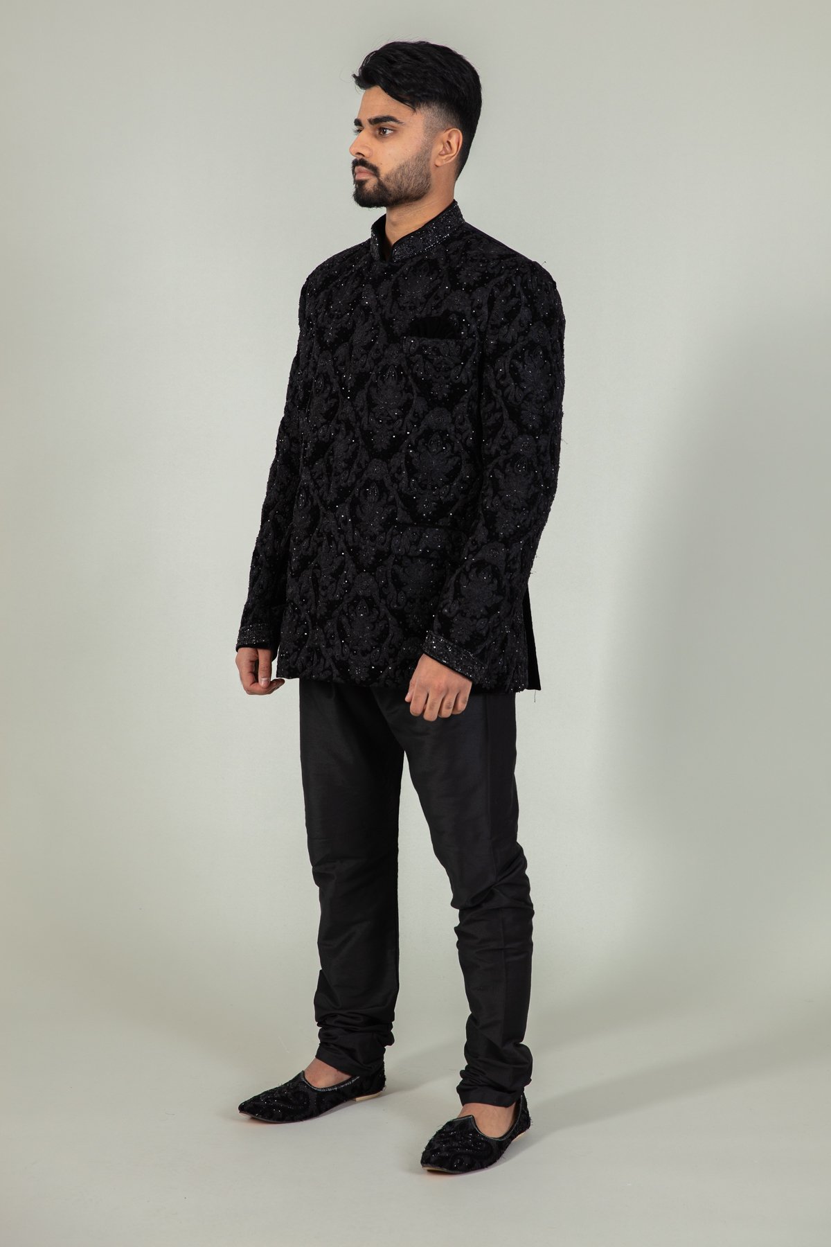 This beautiful men’s velvet sherwani features a short coat all closed upto the collar. It is designed with beautiful thread-work embroidered detailing all over the front and full length sleeves with shiny scattered diamanté’s. Note: The trousers shown in the pictures are not included.