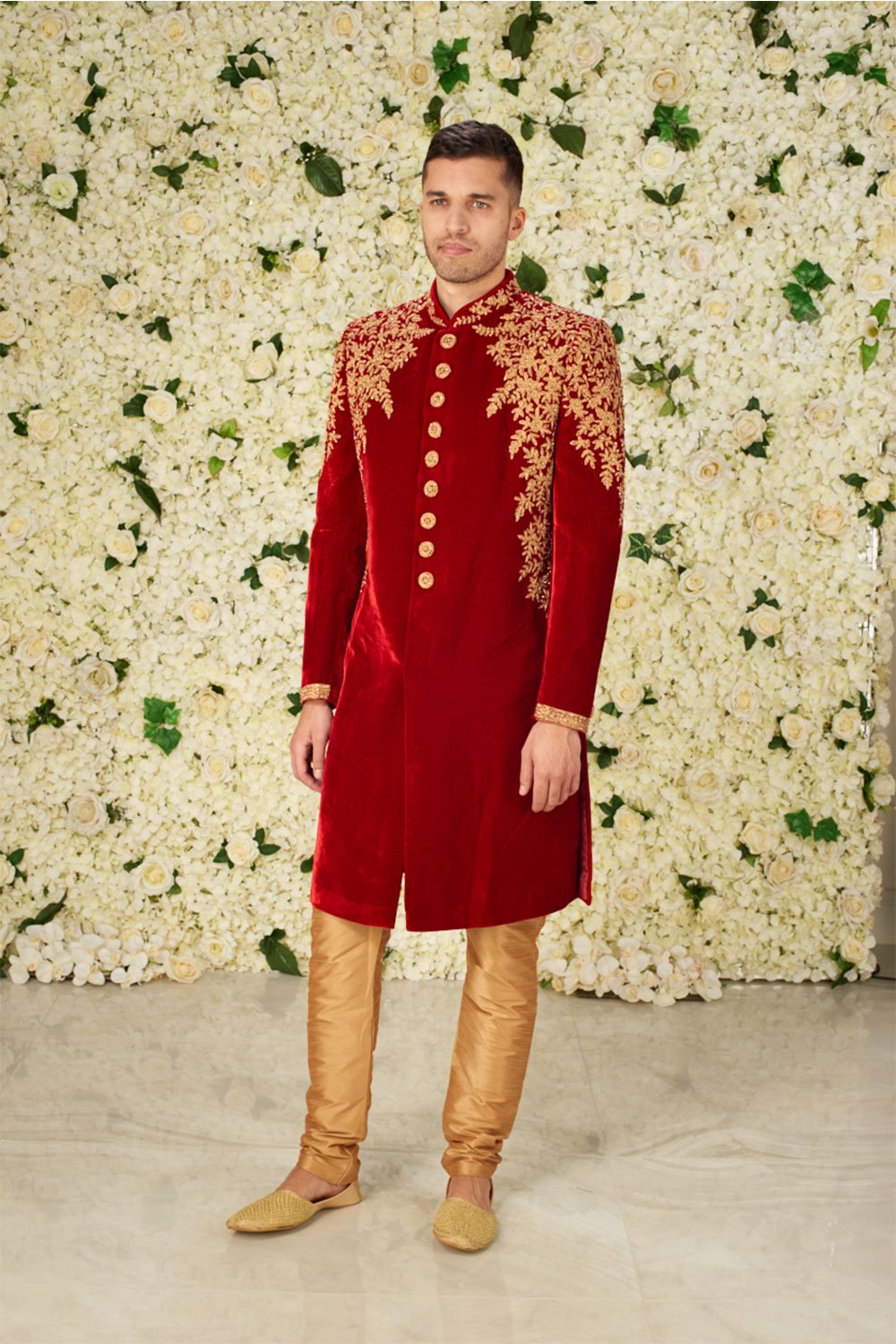 This beautiful men’s velvet sherwani features a long coat resembling achkan in styling, it is buttoned up to the collar and lengthwise, it is below the knee adding charm and grace to the look. It has gold beautiful woven detailing on the shoulders enhanced by moulded buttons and mandarin collar. The look is finished along with a plain dupion silk churidar.
