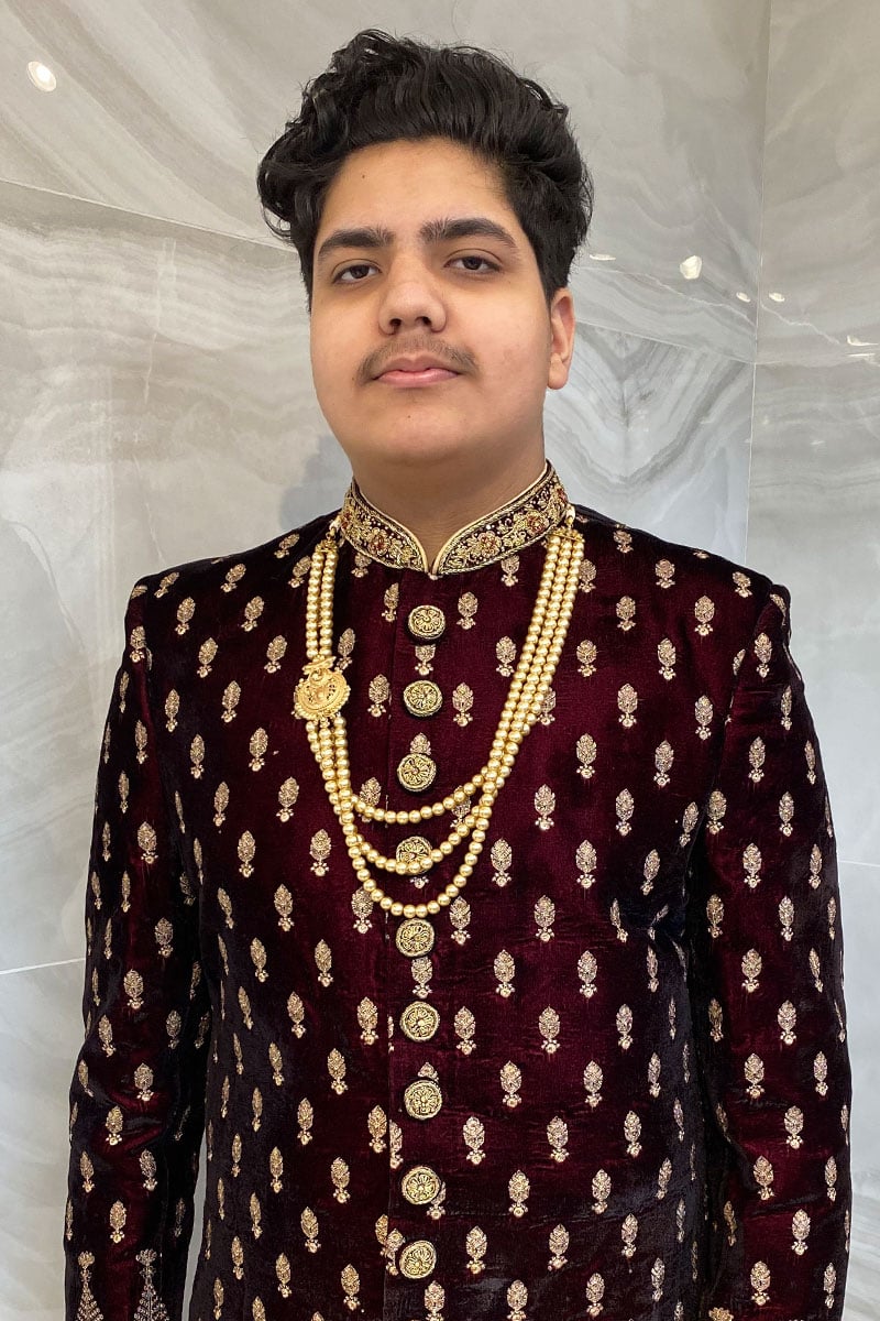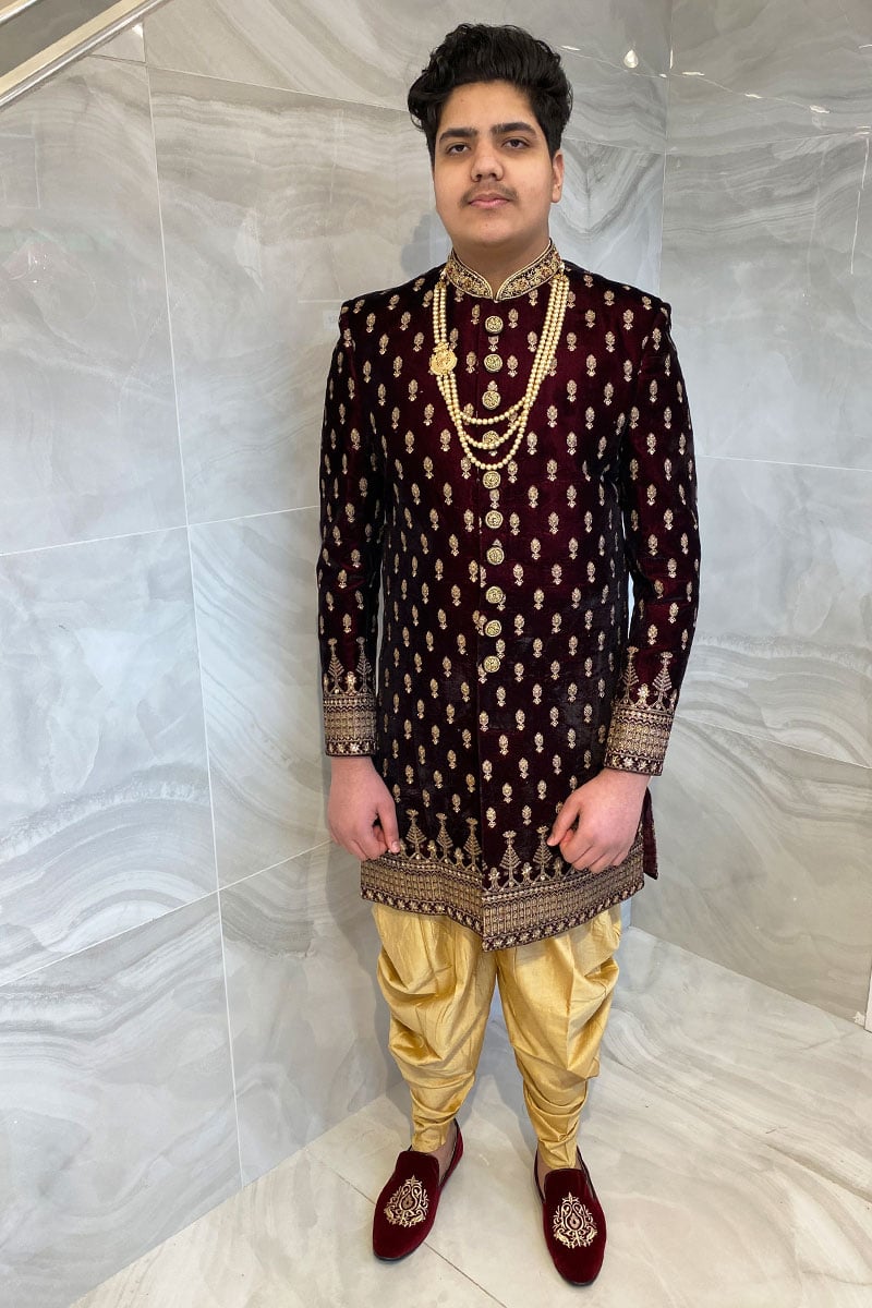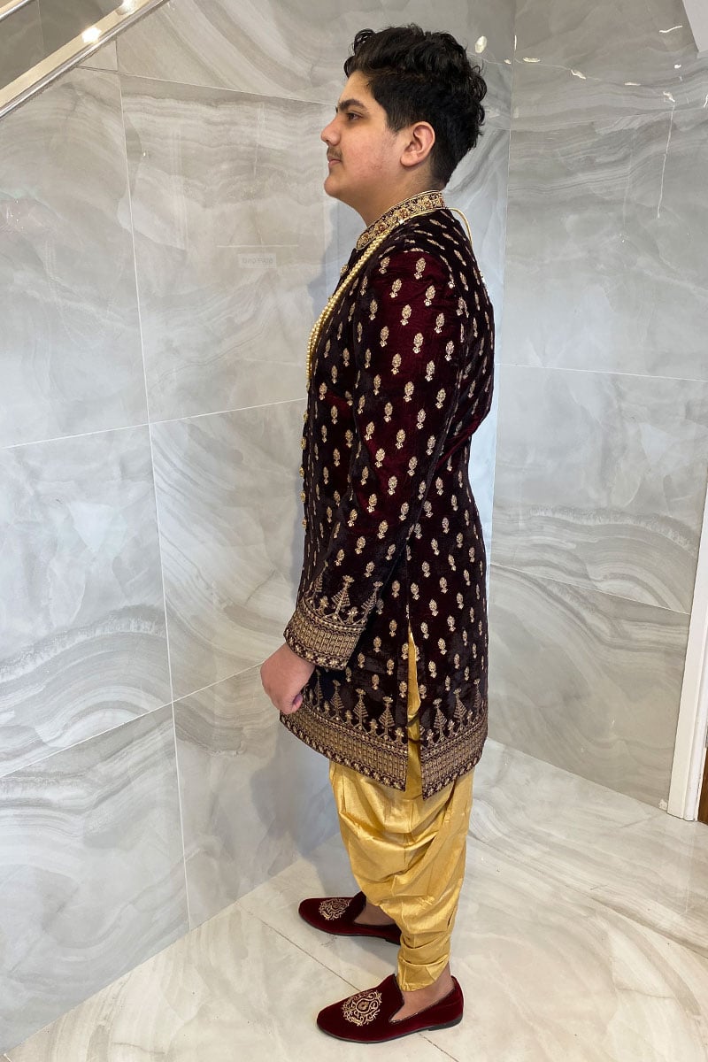 Men’s velvet sherwani with a raw silk shalwar