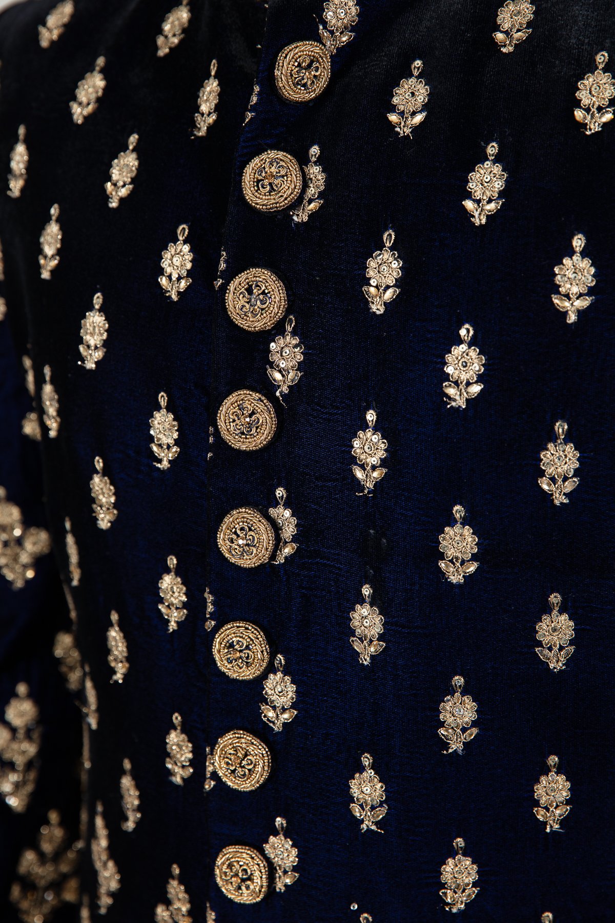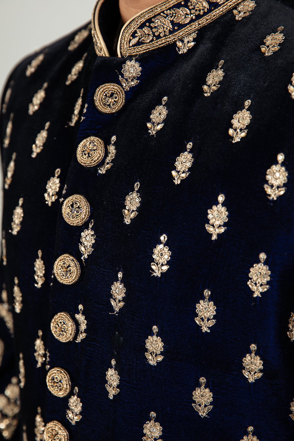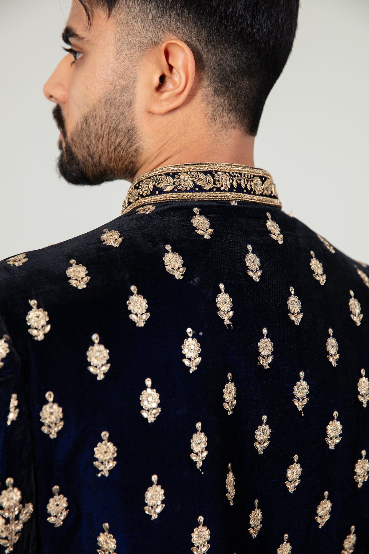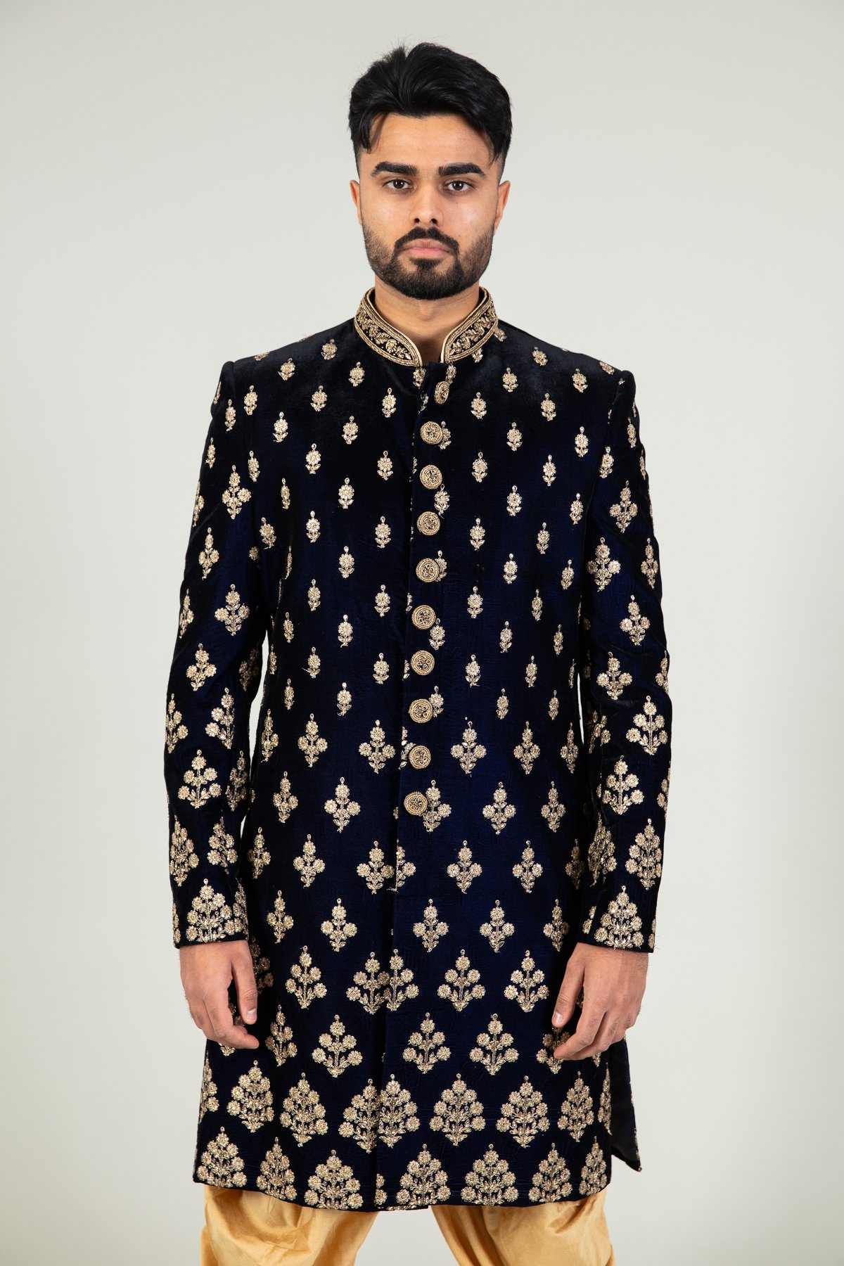 This beautiful men’s velvet sherwani features a straight coat with luxury embroidery throughout along with button embellishments along the middle with a beaded embroidered mandarin collar. It comes with full length embroidered sleeves and the look is finished with a raw silk shalwar.