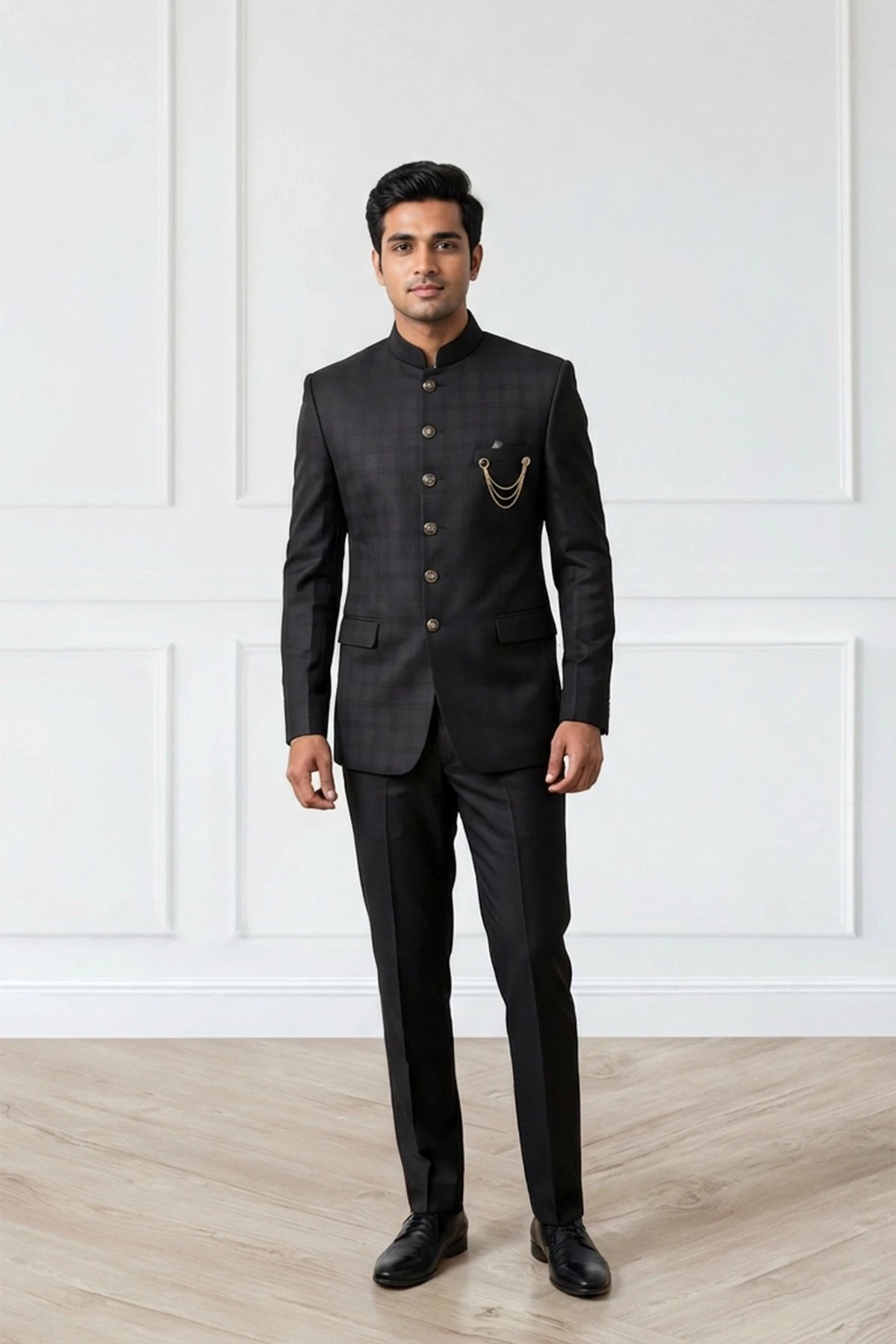 A refined take on classic menswear, this checkered bandhgala is tailored for the man who values quiet luxury. Crafted with a structured silhouette and a subtle woven check pattern, it delivers depth and sophistication without overpowering the look. The high collar and clean front placket create a sharp, regal profile, while the metallic buttons add a modern, polished finish. Paired with tailored straight trousers and a detachable gold chain that accents the left chest, introducing a touch of ceremonial elegance that elevates the ensemble for weddings, formal events, and evening celebrations.