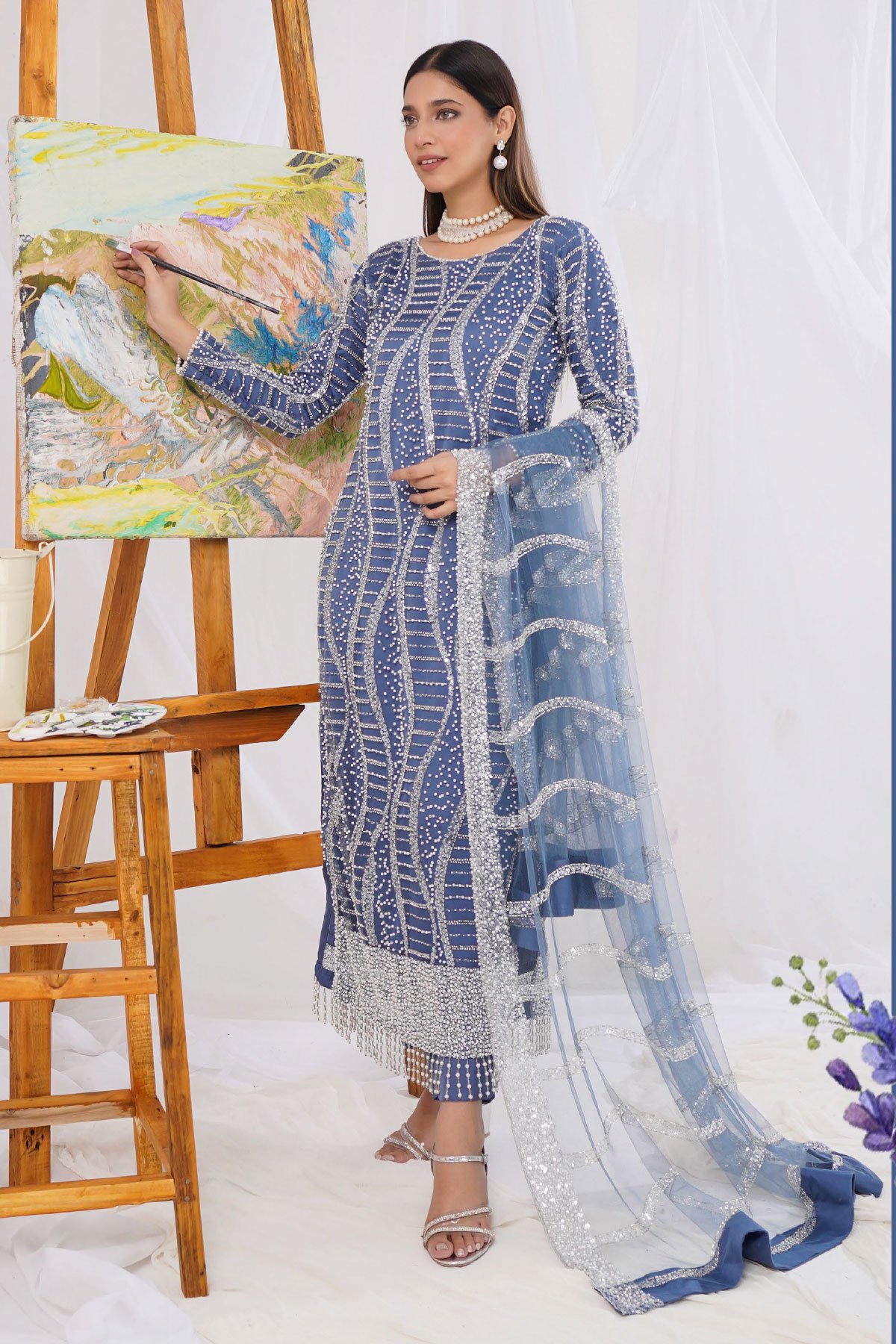This beautiful 3 piece Mirey collection features a straight shirt with luxury pearl work embroidery throughout, finished with full length embroidered sleeves, It comes  straight leg silk trousers and the look is finished with a net embroidered dupatta.