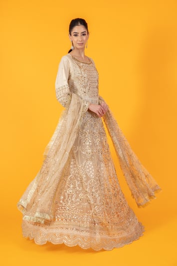 This beautiful 3 piece Mirey collection features a straight shirt with luxury pearl work embroidery throughout, finished with full length embroidered sleeves. Paired with straight leg silk trousers and the look is finished with a net dupatta with ruffled border.