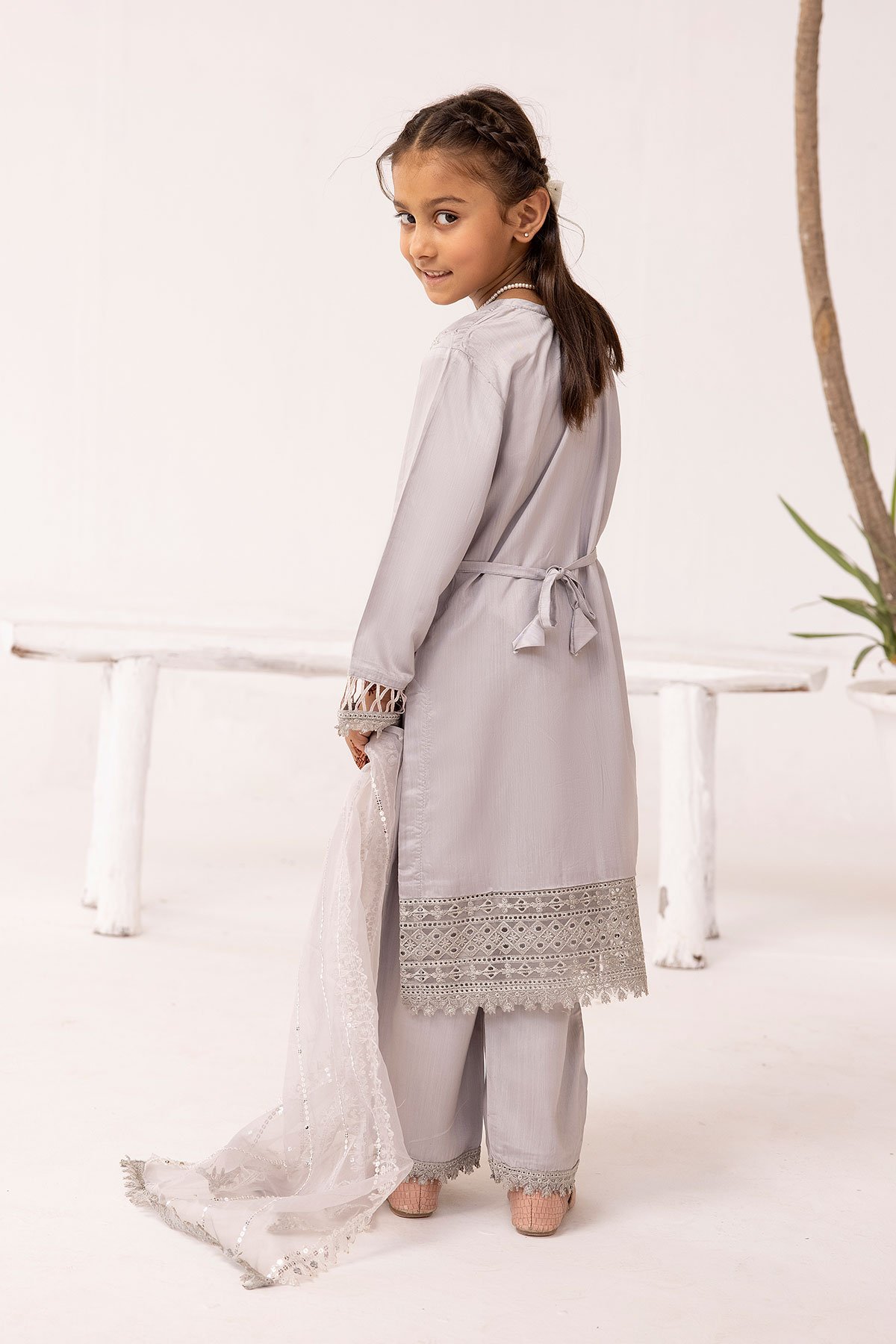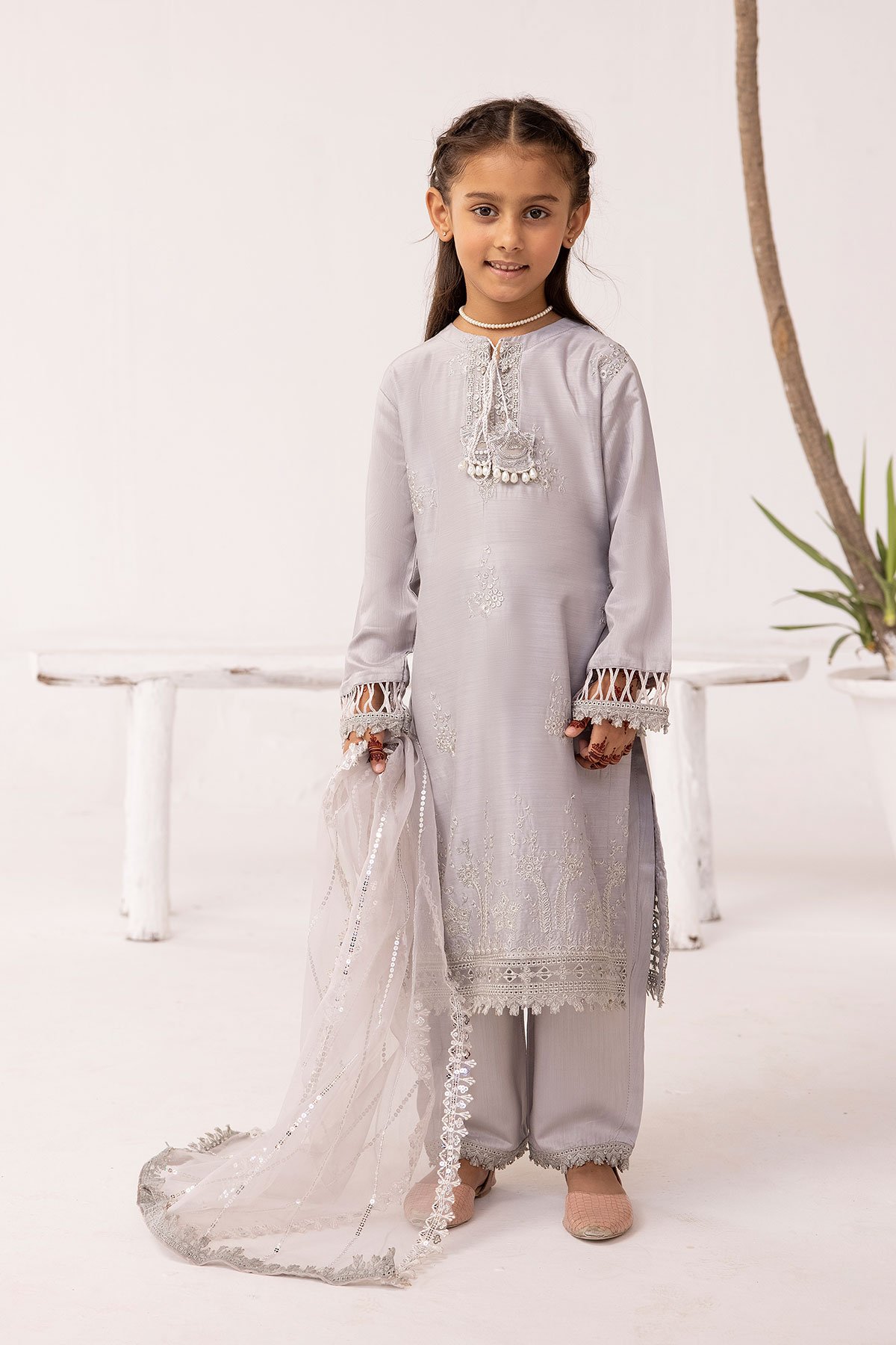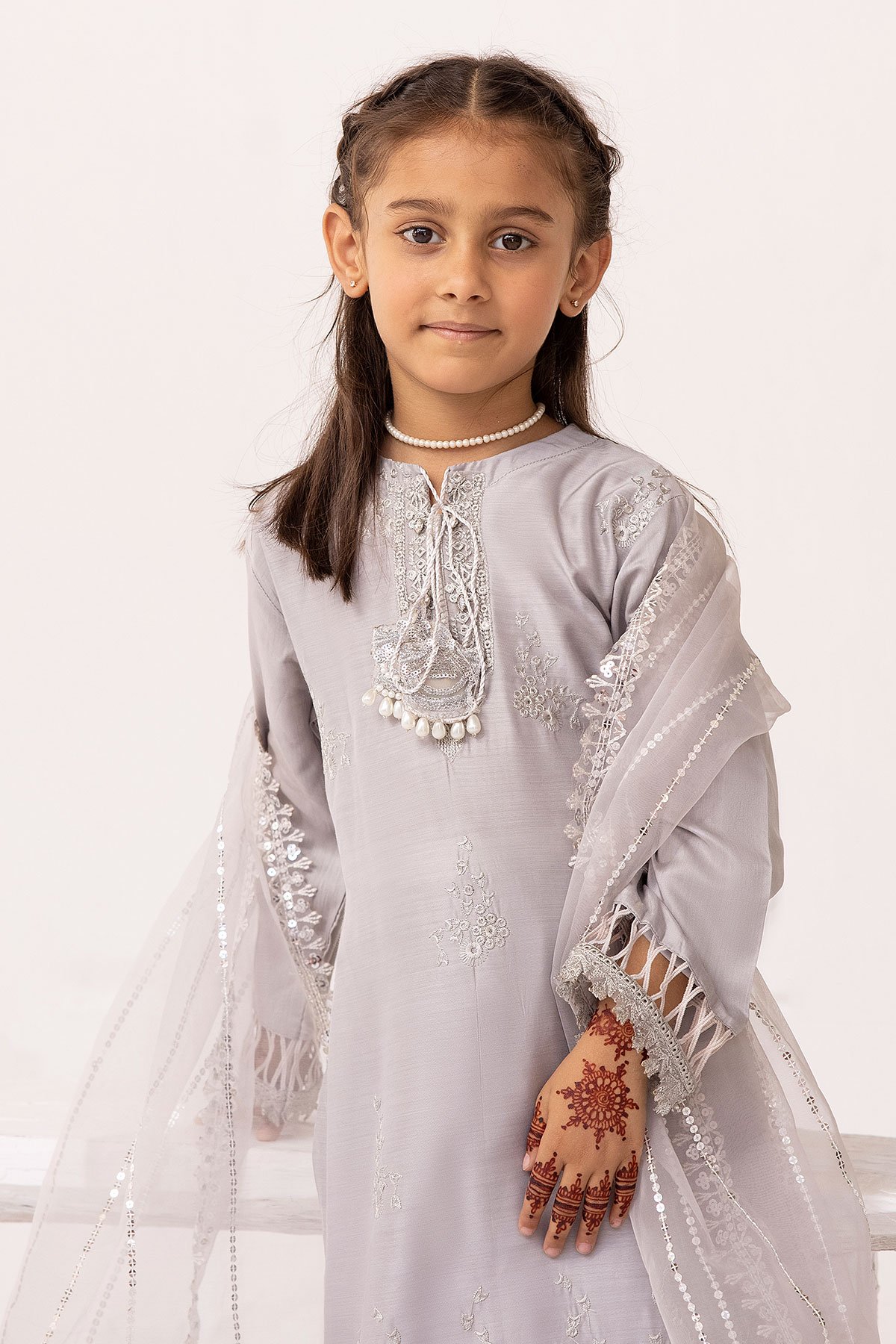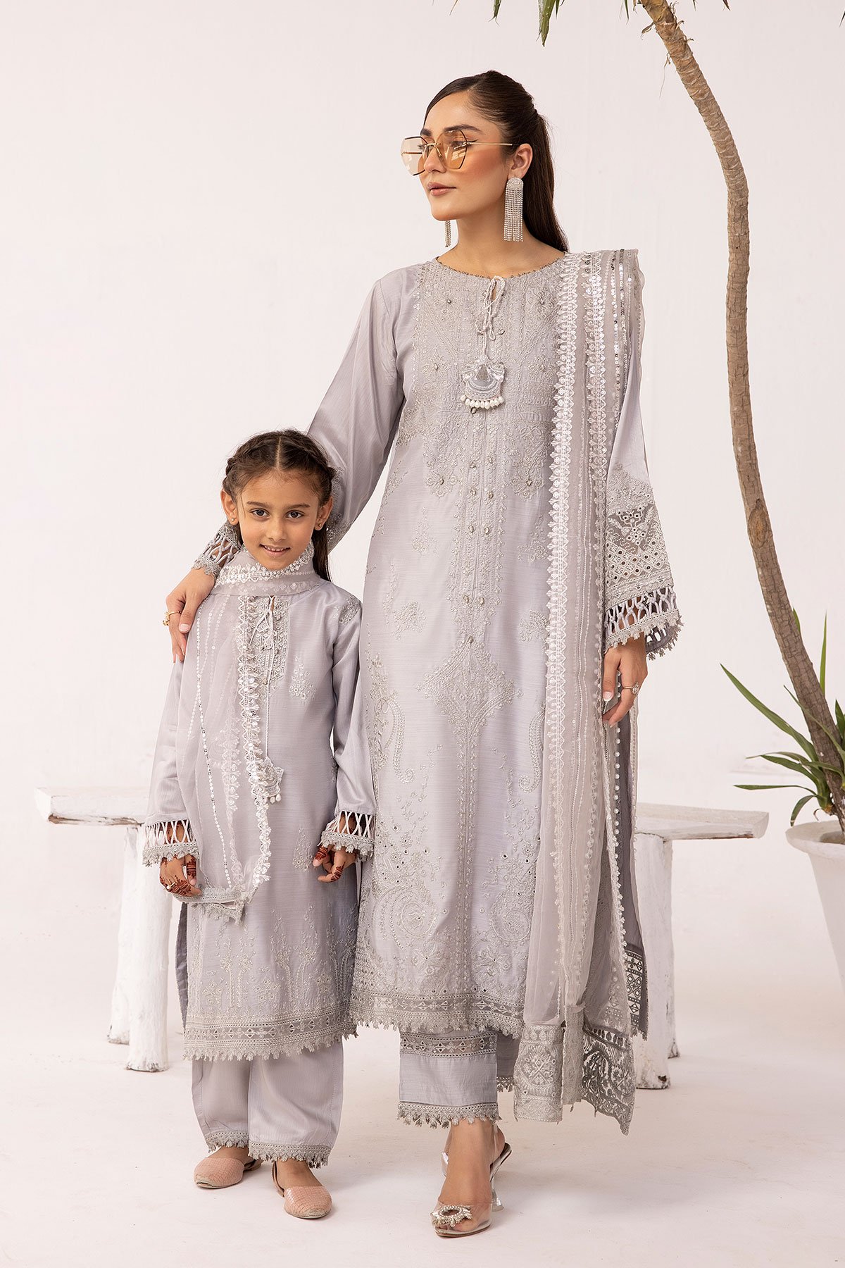 This beautiful 3 piece kids casual suit features a straight shirt with luxury thread work embroidery throughout with dori embellishment on the neckline, finished with lace embellishment on the border and cuffs of full length embroidered sleeves. It comes with straight leg trousers and the look is finished with an embroidered organza dupatta. Perfect mother and daughter collection for this eid.