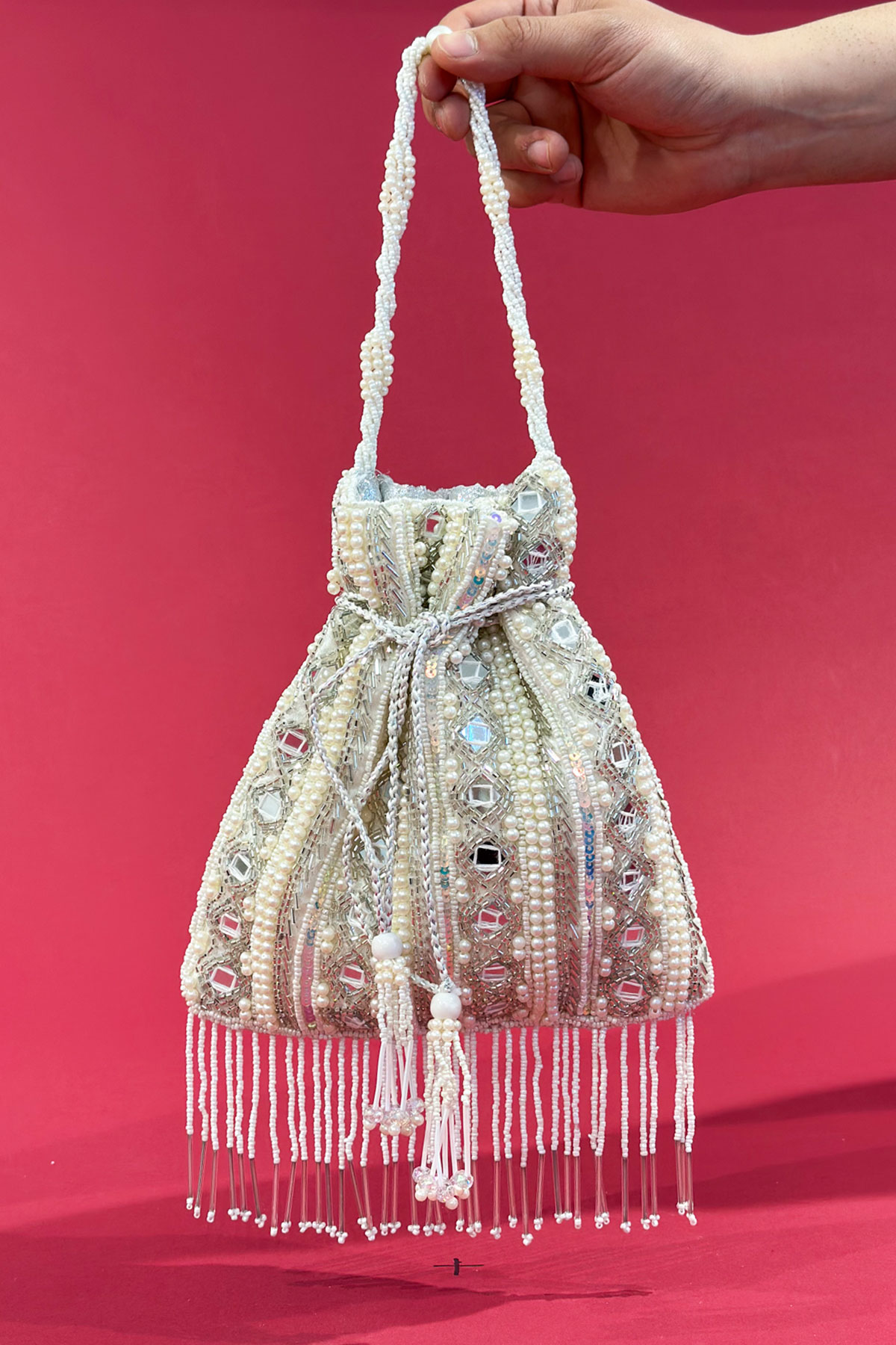 This luxurious bag is offered in the potli pattern and features an embroidered strap for convenient use. It is available in the perfect dimensions and is a beautiful illustration of high-level craftsmanship of pearl motif embellishments, finished on dangling tassels which makes it look much more appealing, this exquisite bag will give you a standout look in casual and party wear attires.