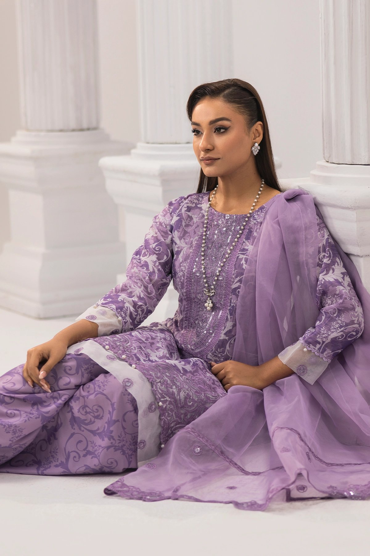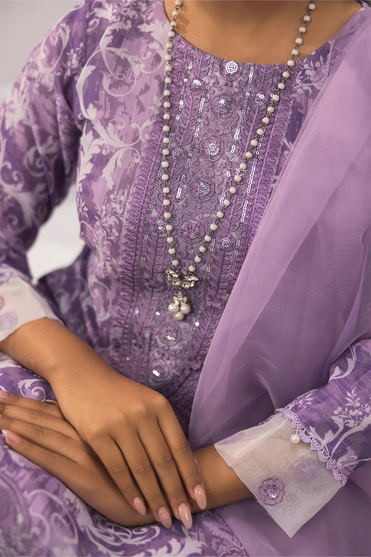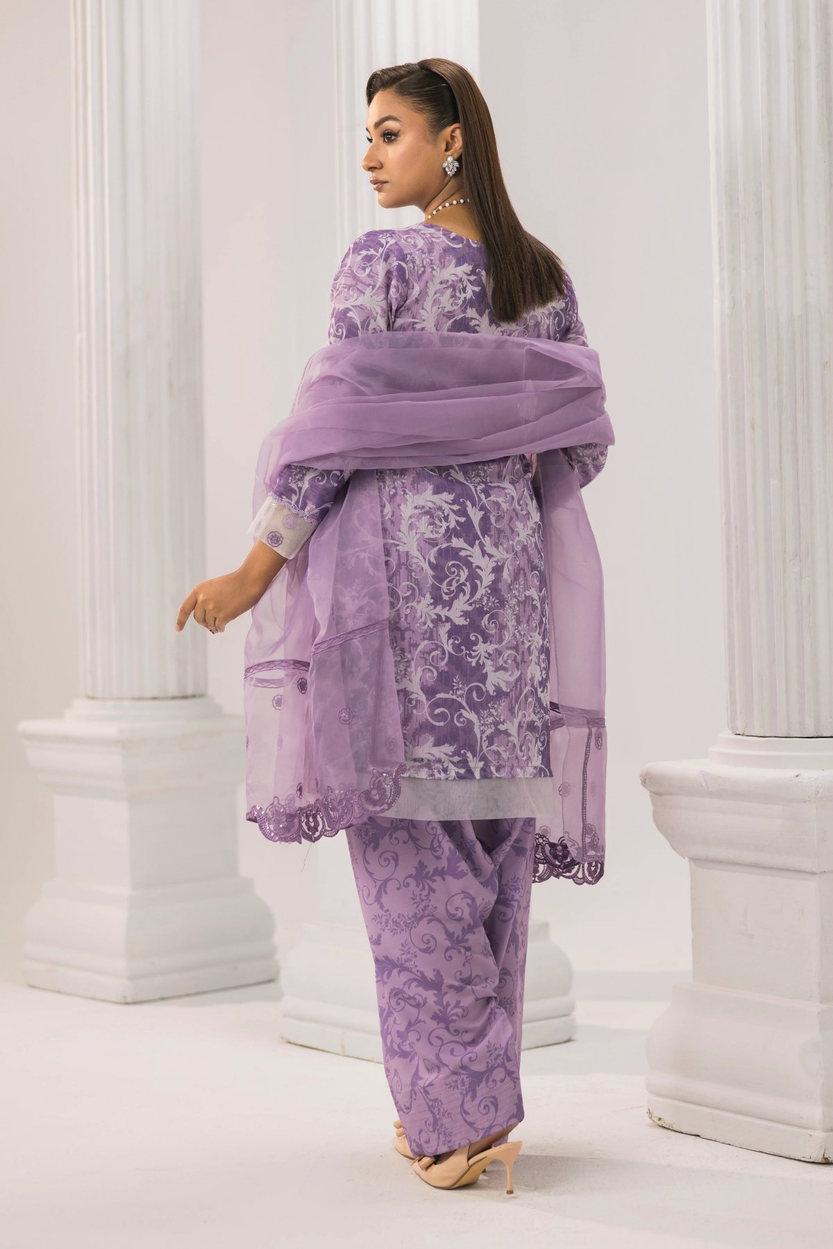 This beautiful 3 piece suit is made from soft monar fabric, featuring a straight kameez with elegant embroidery for a stylish yet traditional look. It comes with a matching farshi shalwar, giving the outfit a graceful flow. The set is completed with a lightweight organza dupatta, decorated with delicate embroidery to tie everything together. Perfect for festive occasions and Eid wear.