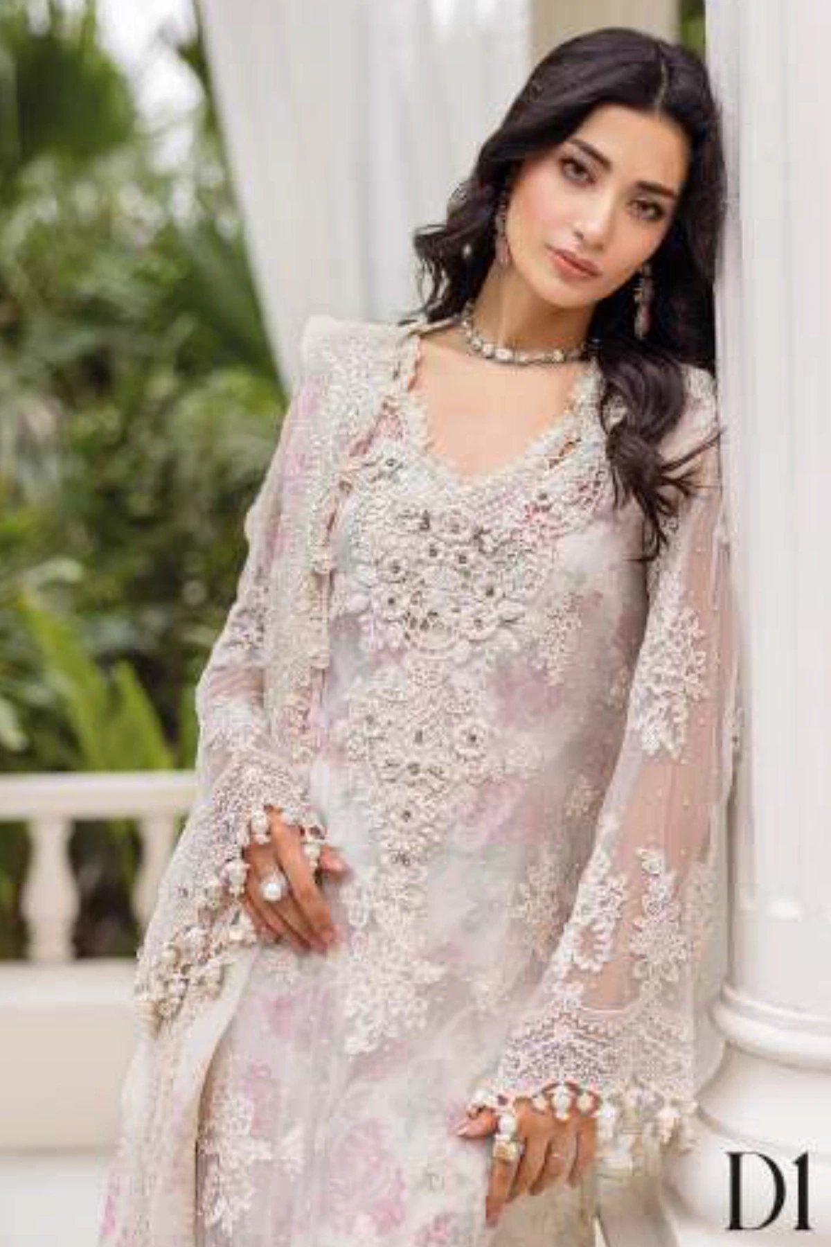 This beautiful 3 piece Maria b inspired suit features a straight chiffon shirt with luxury thread work embroidery throughout with crepe printed inner lining. It comes with full length embroidered sleeves, paired with printed crepe straight leg trousers and the look is finished with a chiffon embroidered dupatta. Note: Above catalogue pictures are for design reference only, embellishments and stitching may vary.