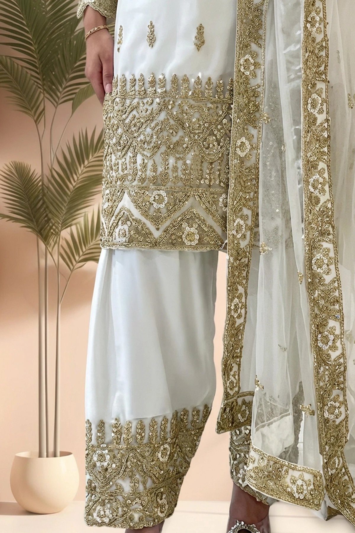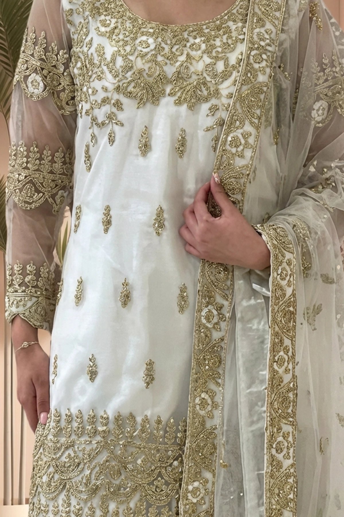 This beautiful 3 piece murraya collection features a straight net shirt with luxury dori embroidery throughout with scattered diamantes, finisehd with full embroidered sleeves. Paired with a shalwar with an embroidered border and the look is finished with a net embroidered dupatta.