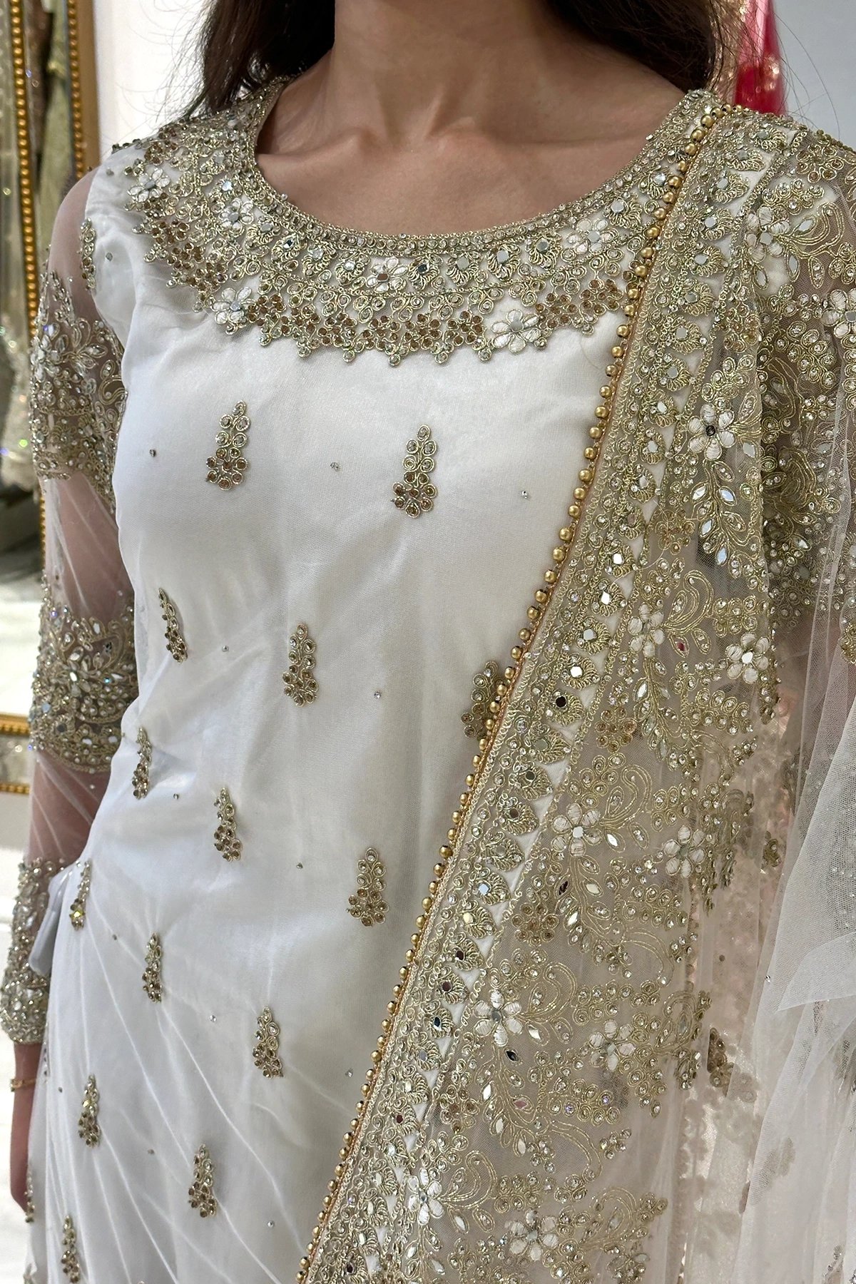 This beautiful 3 piece net suit features a straight shirt with luxury beaded embroidery throughout the front with scattered diamante’s. It comes with full length see throughout net embroidered sleeves. Paired with a crepe silk shalwar with an embroidered border and the look is finished with a net embroidered dupatta.