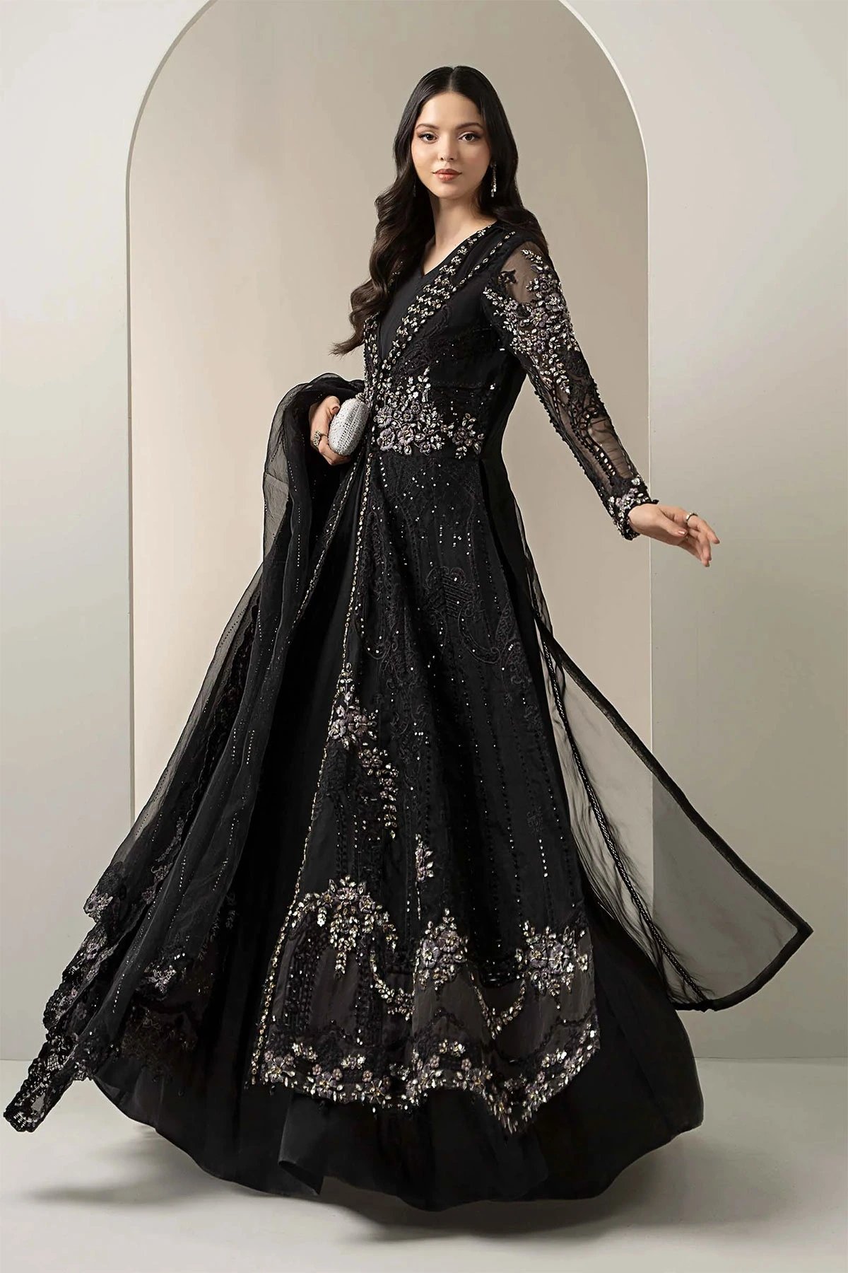This beautiful 3 piece Maria b inspired suit features a long maxi gown with set along the middle with thread work embroidery along with motif and bead embellishments, finished with full length embroidered sleeves. Paired with straight leg crepe trousers and the look is finish with an organza embroidered dupatta. Note: Above catalogue pictures are for design reference only, embellishments and stitching may vary.