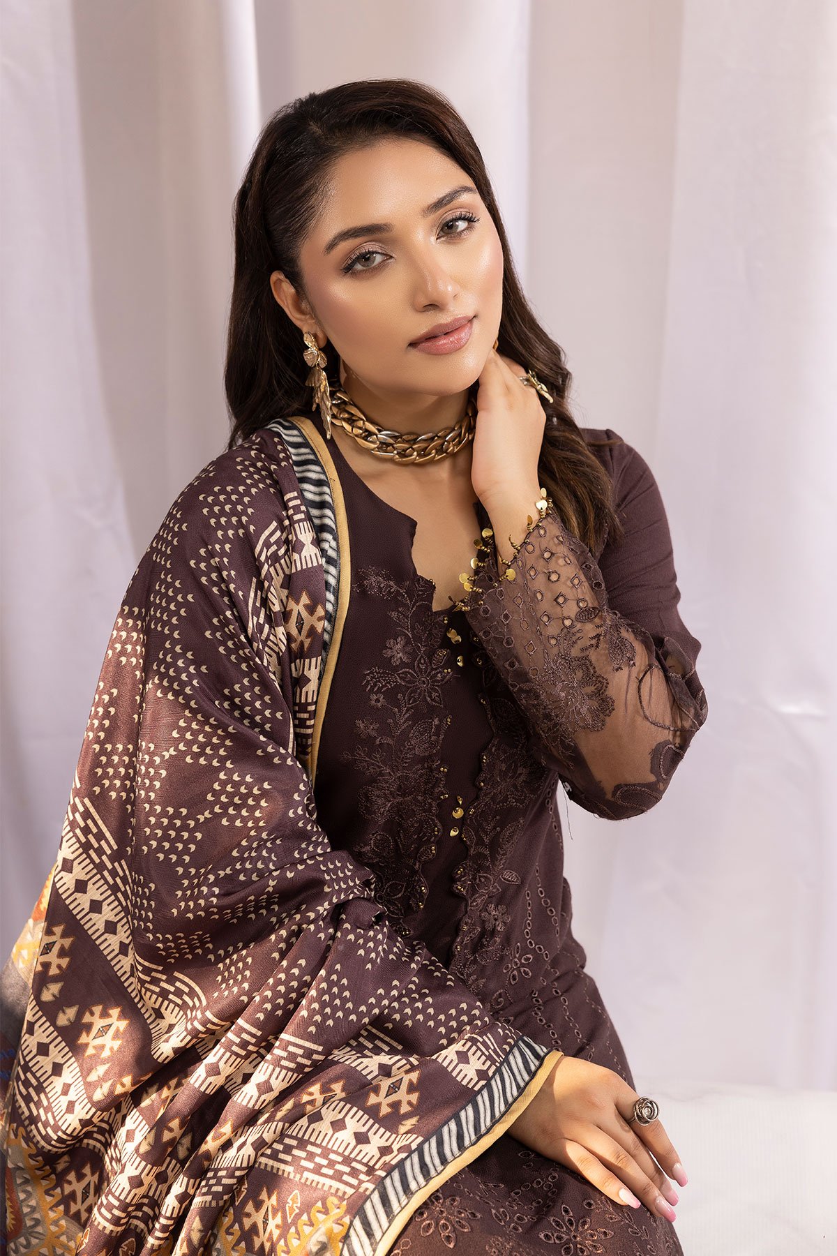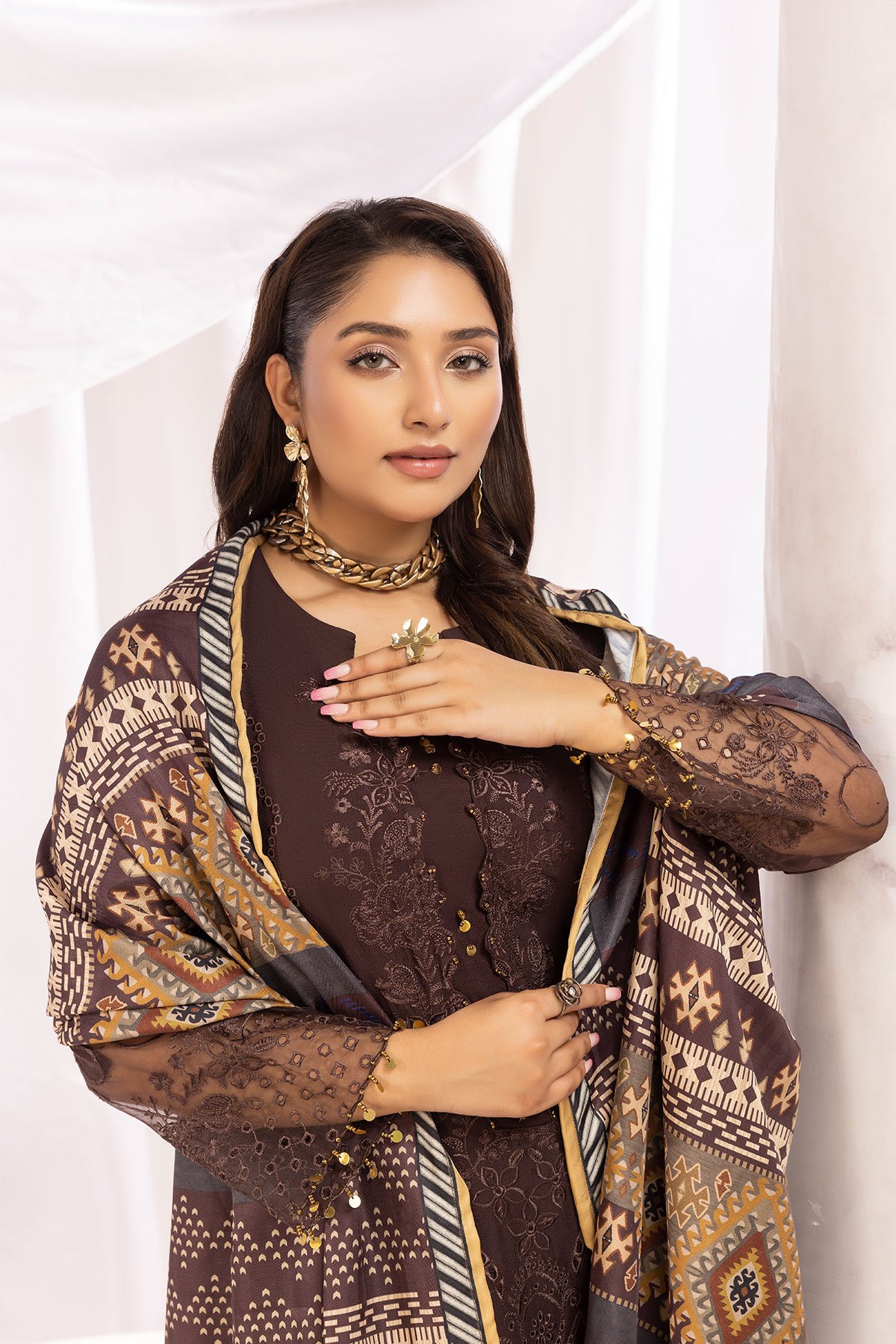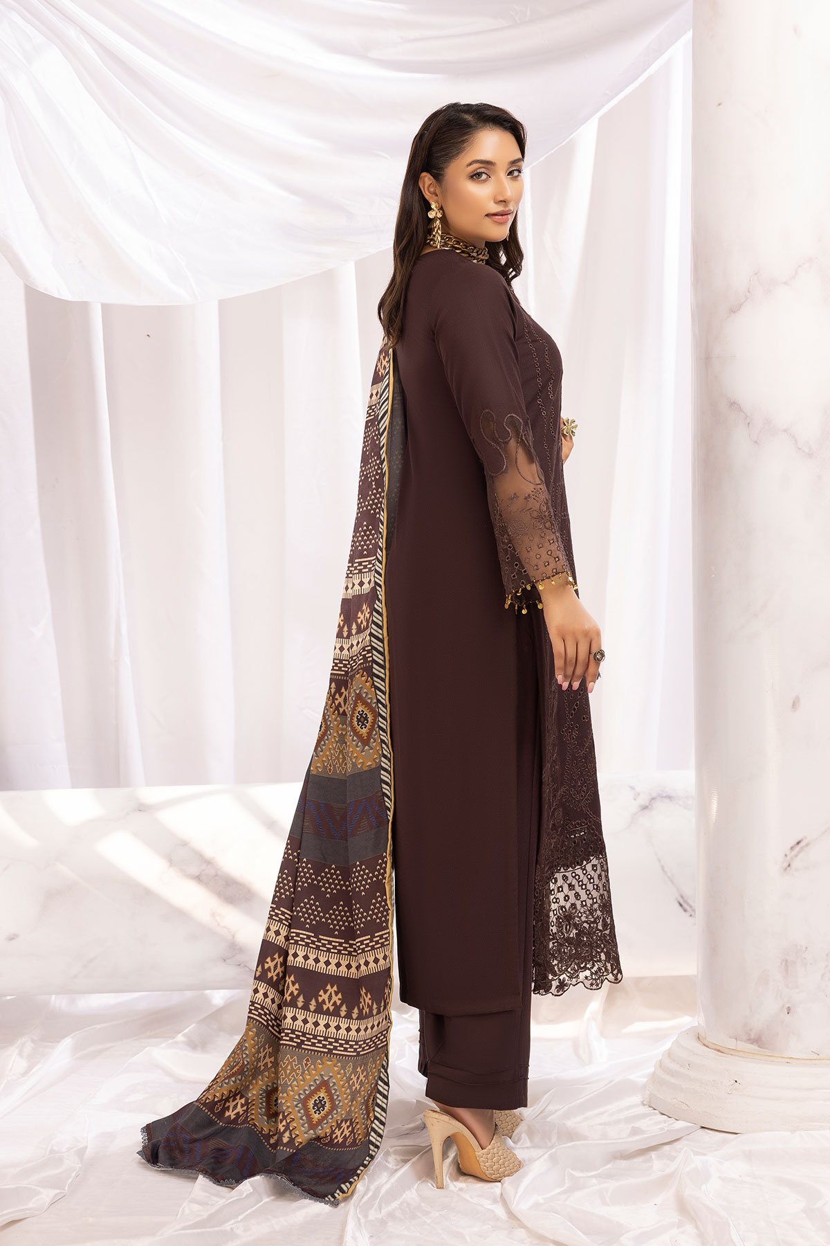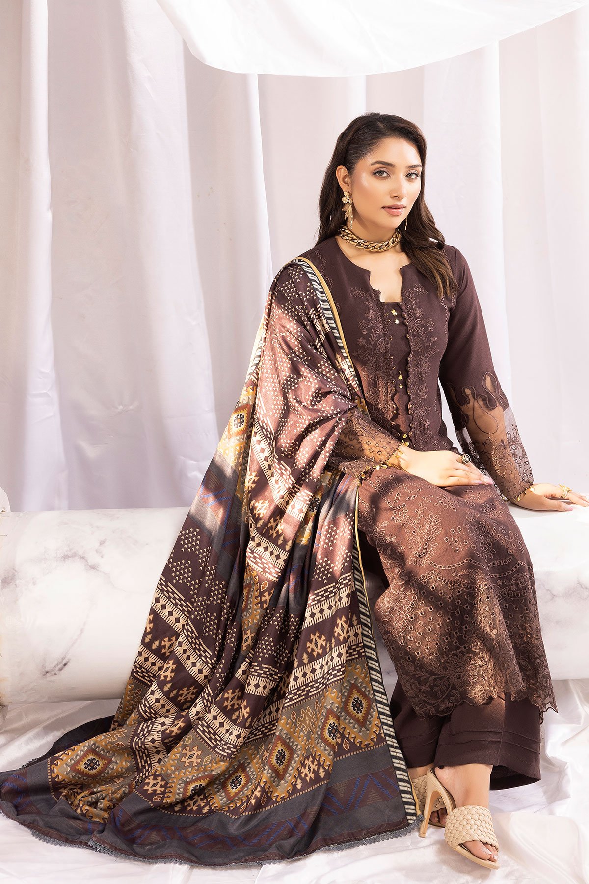 This beautiful Mushq dhanak collection features a straight chickenkari embroidered shirt, with bead embellishments on the front finished with full length embroidered sleeves. It comes with linen trousers and the look is finished with a printed linen shawl. Prefect collection for this winter.