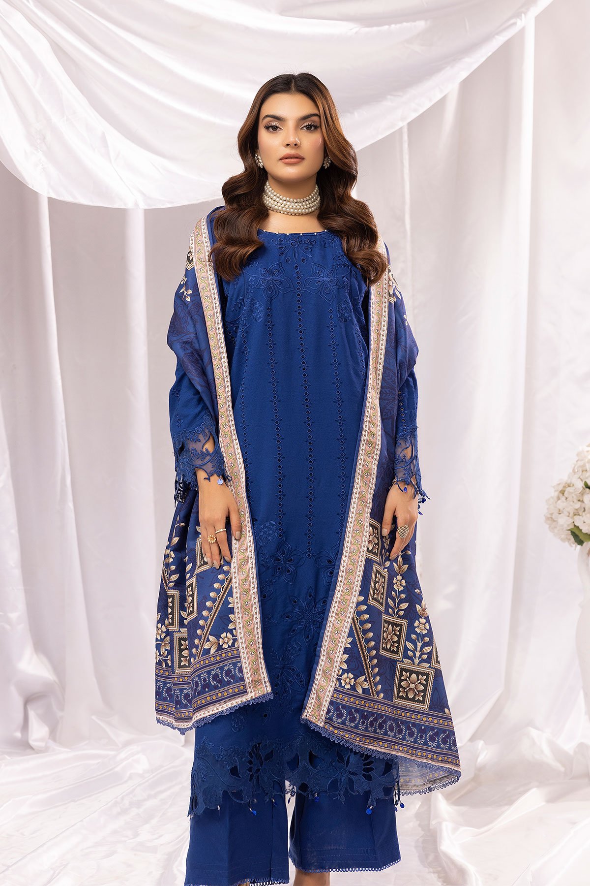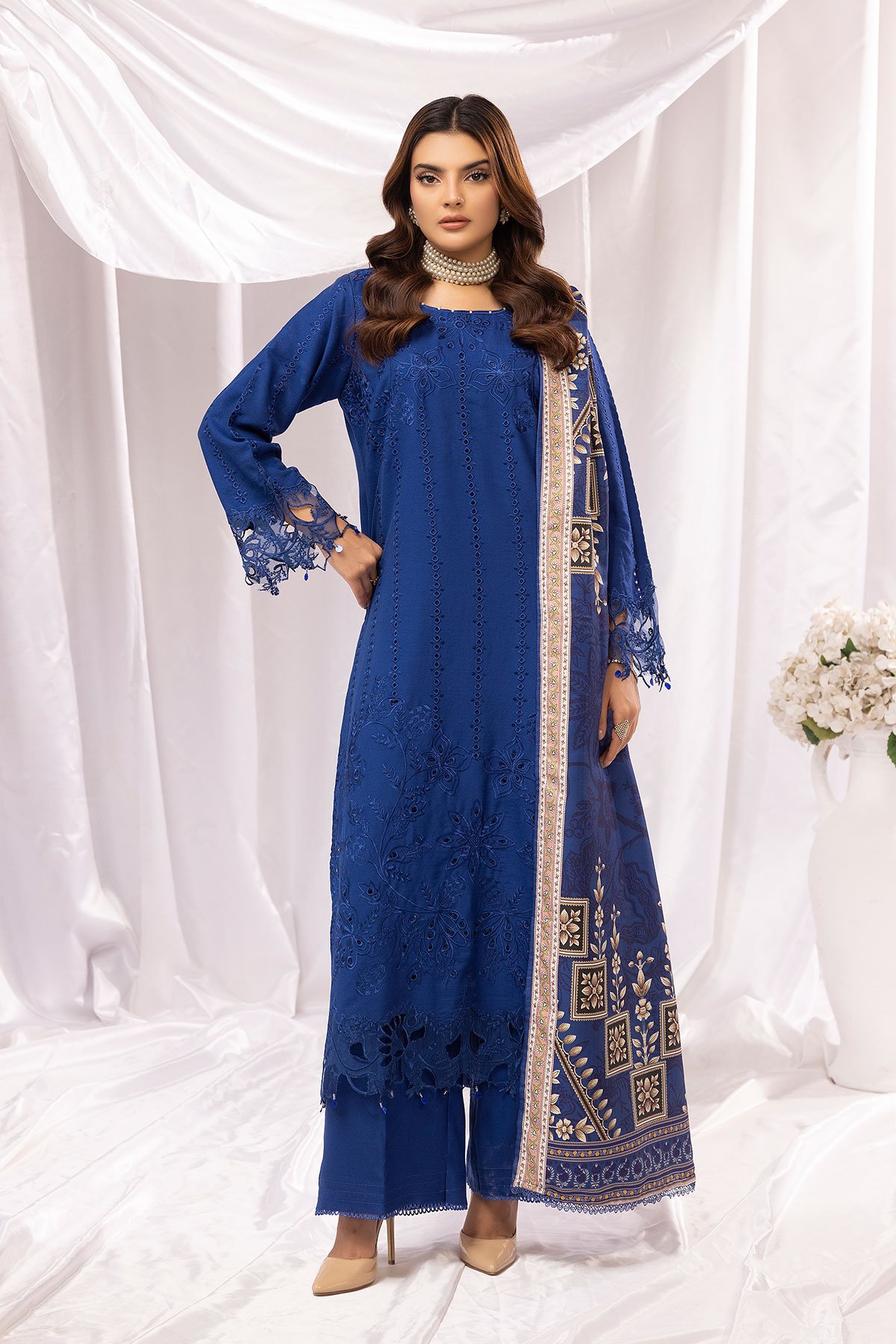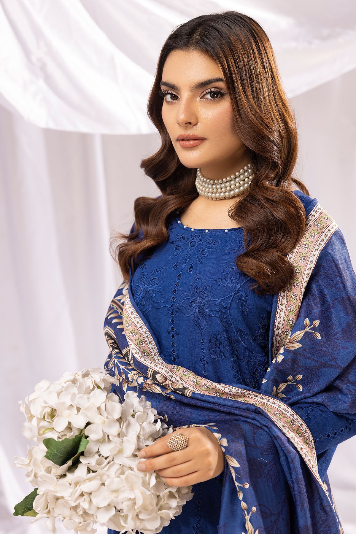 This beautiful Mushq dhanak collection features a straight chickenkari embroidered shirt finished with dangling beads on the border and full length embroidered sleeves. It comes with linen trousers and the look is finished with a printed linen shawl. Prefect collection for this winter.