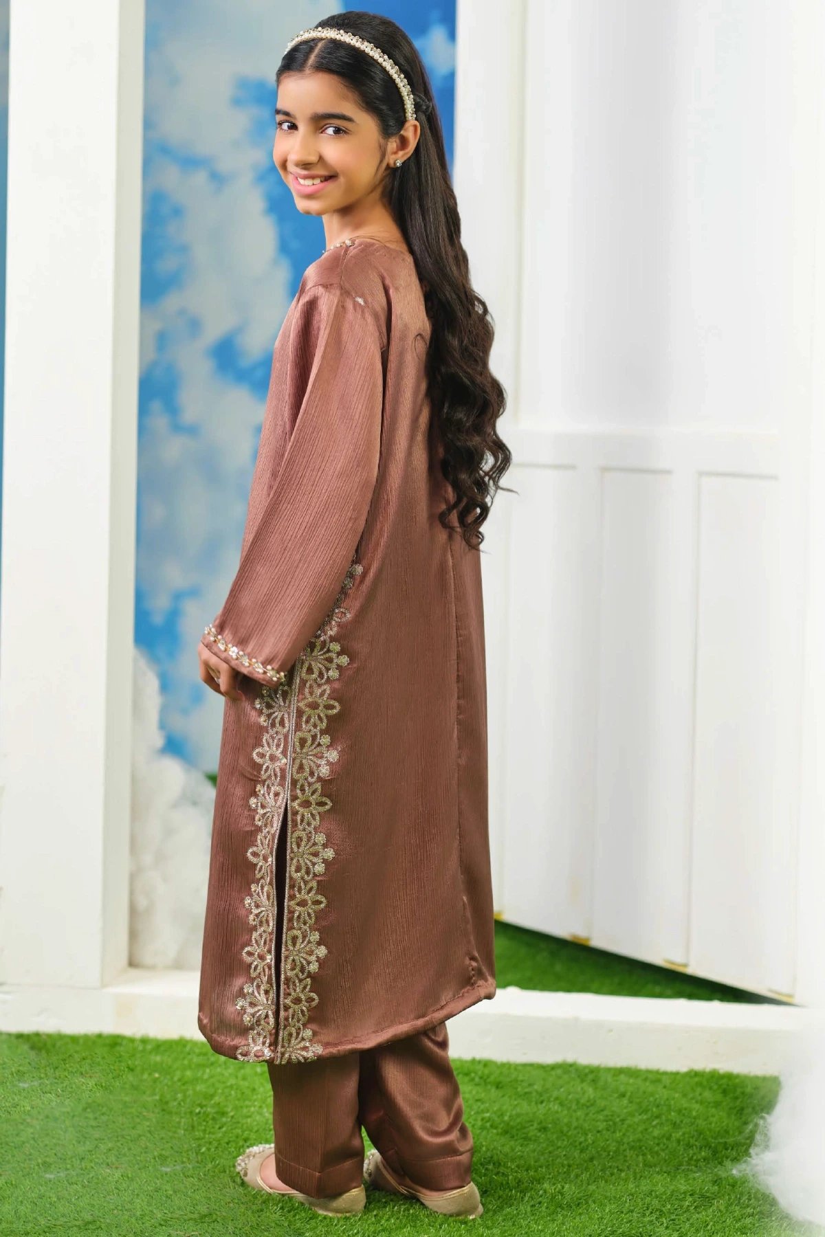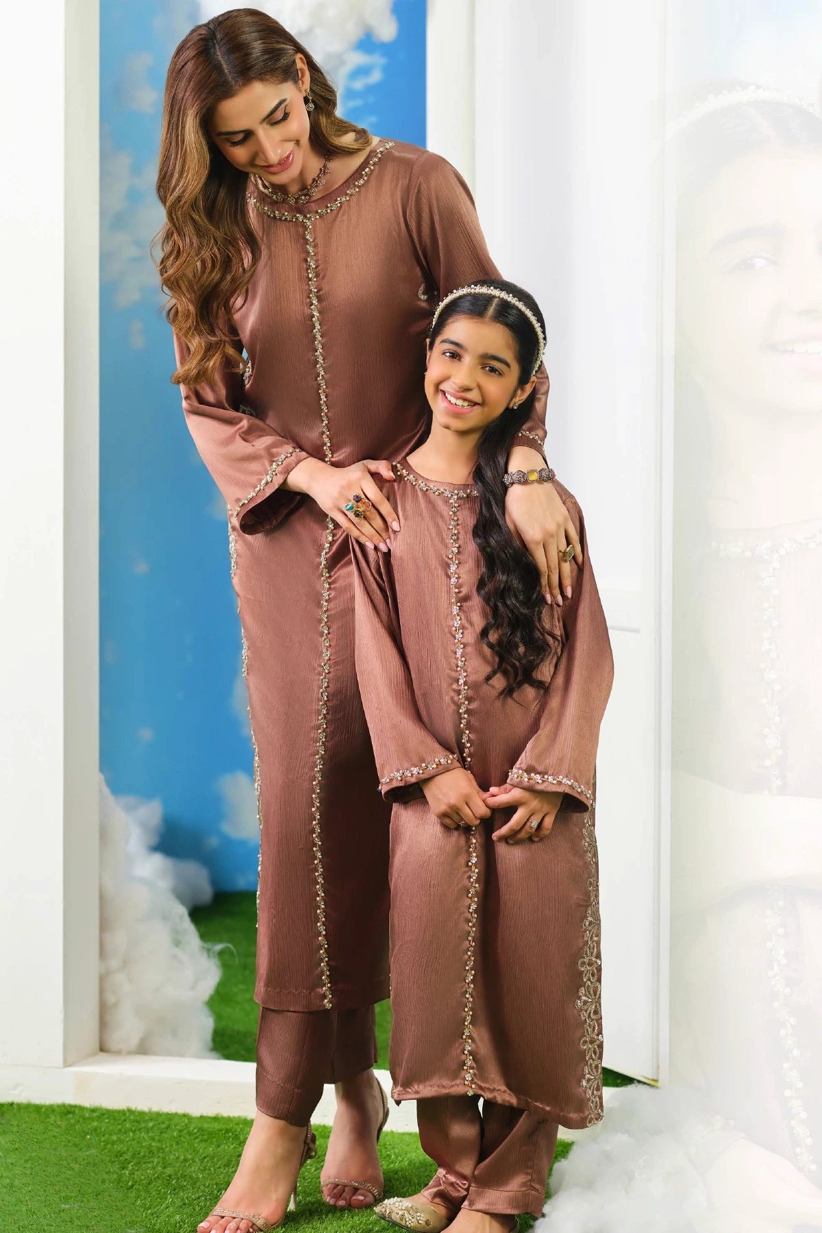 A refined blend of tradition and modern poise, this kids kurta set is crafted for the woman who values understated luxury. The long, straight‑cut kurta features intricate tonal embroidery running along the front placket and side panels, adding depth and artisanal detail without overwhelming the silhouette. A softly rounded neckline, embellished with delicate handwork, frames the look with quiet sophistication. Paired with straight leg trousers. Perfect mother and daughter collection for this Eid.