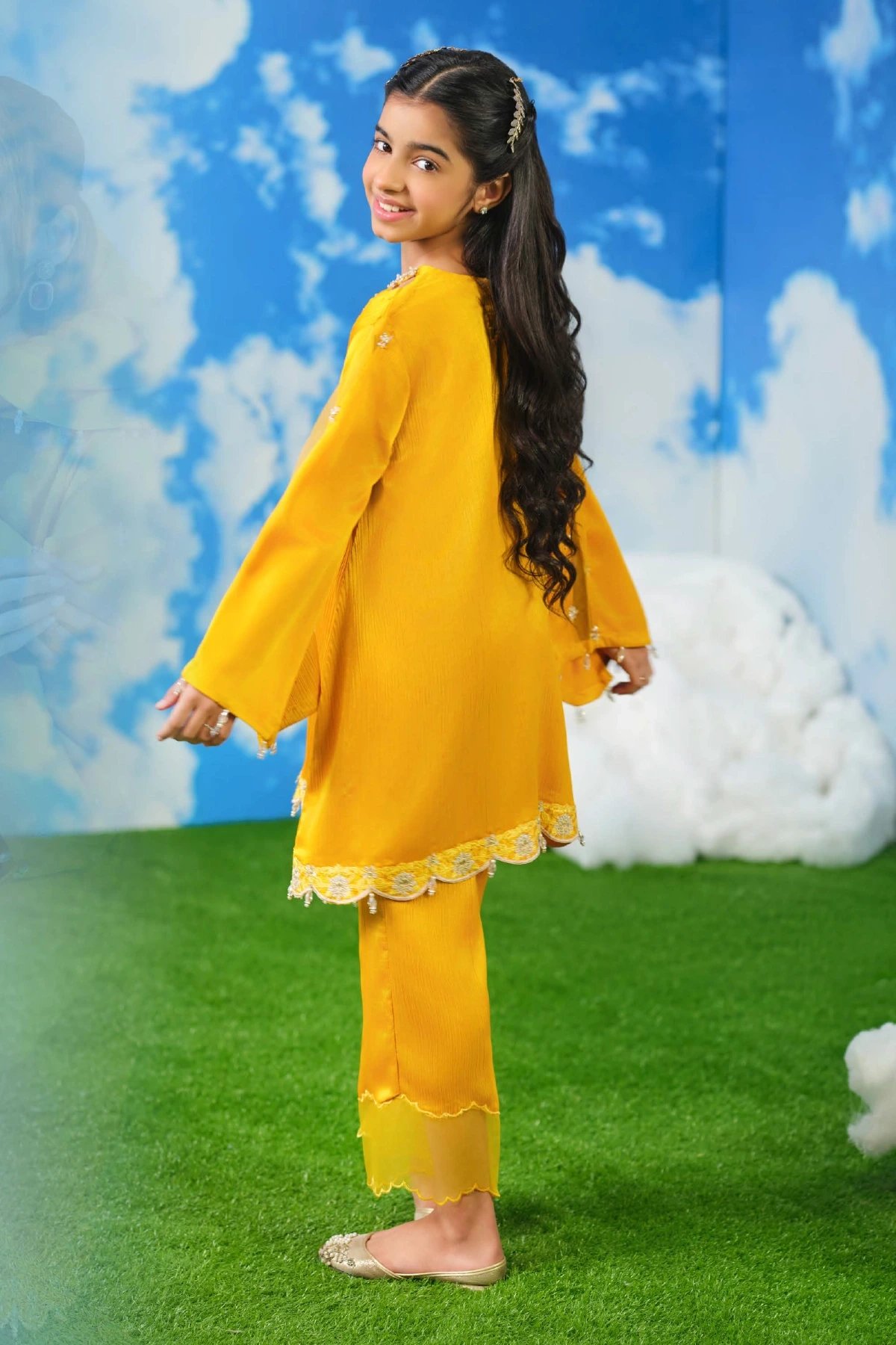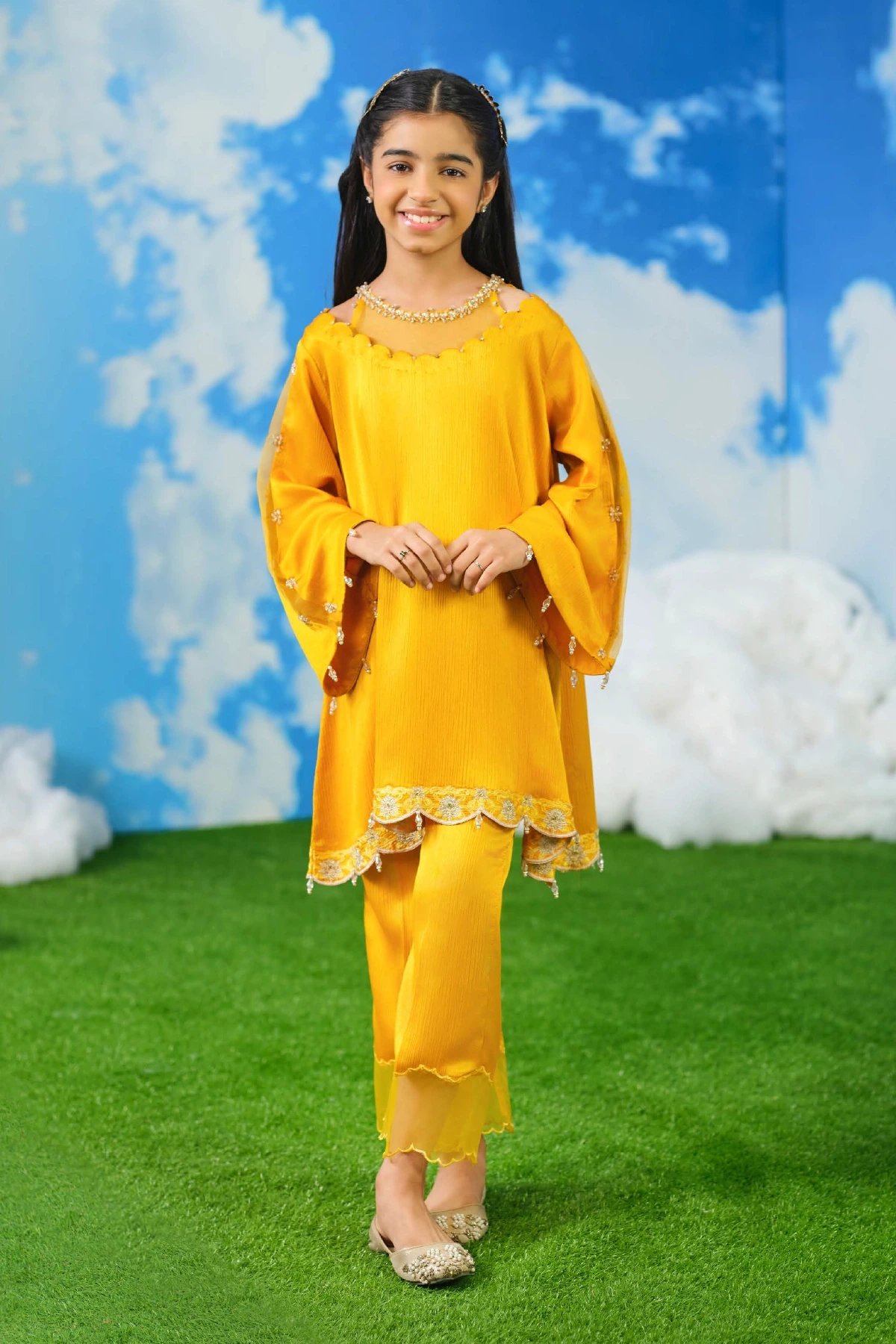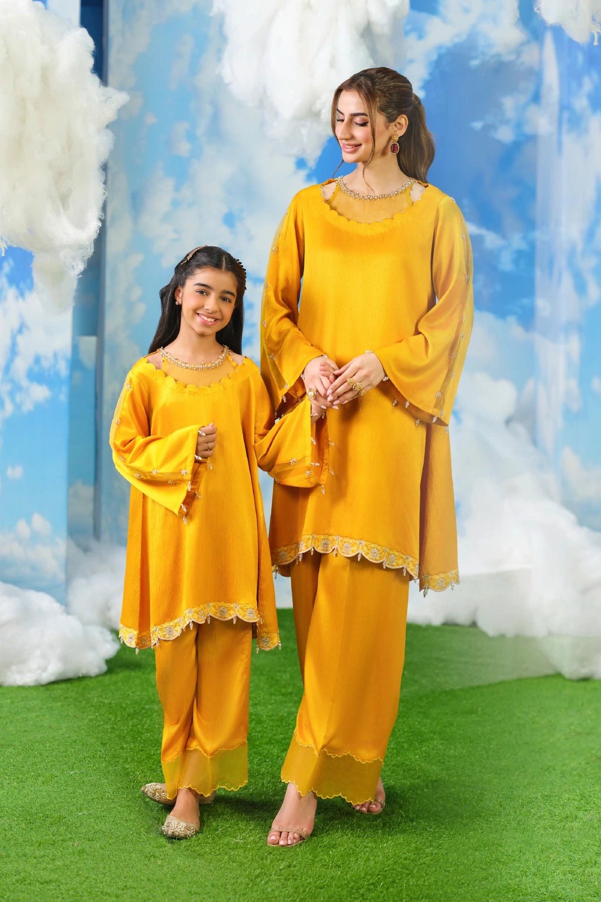 This bright kids co‑ord set brings together festive charm and modern elegance. The long tunic features beautifully scalloped edges, wide flowing sleeves, and delicate embellishments that add subtle sparkle without overwhelming the look. Paired with matching loose‑fit trousers, the silhouette feels airy, graceful, and effortlessly stylish. Perfect mother and daughter collection for this Eid.