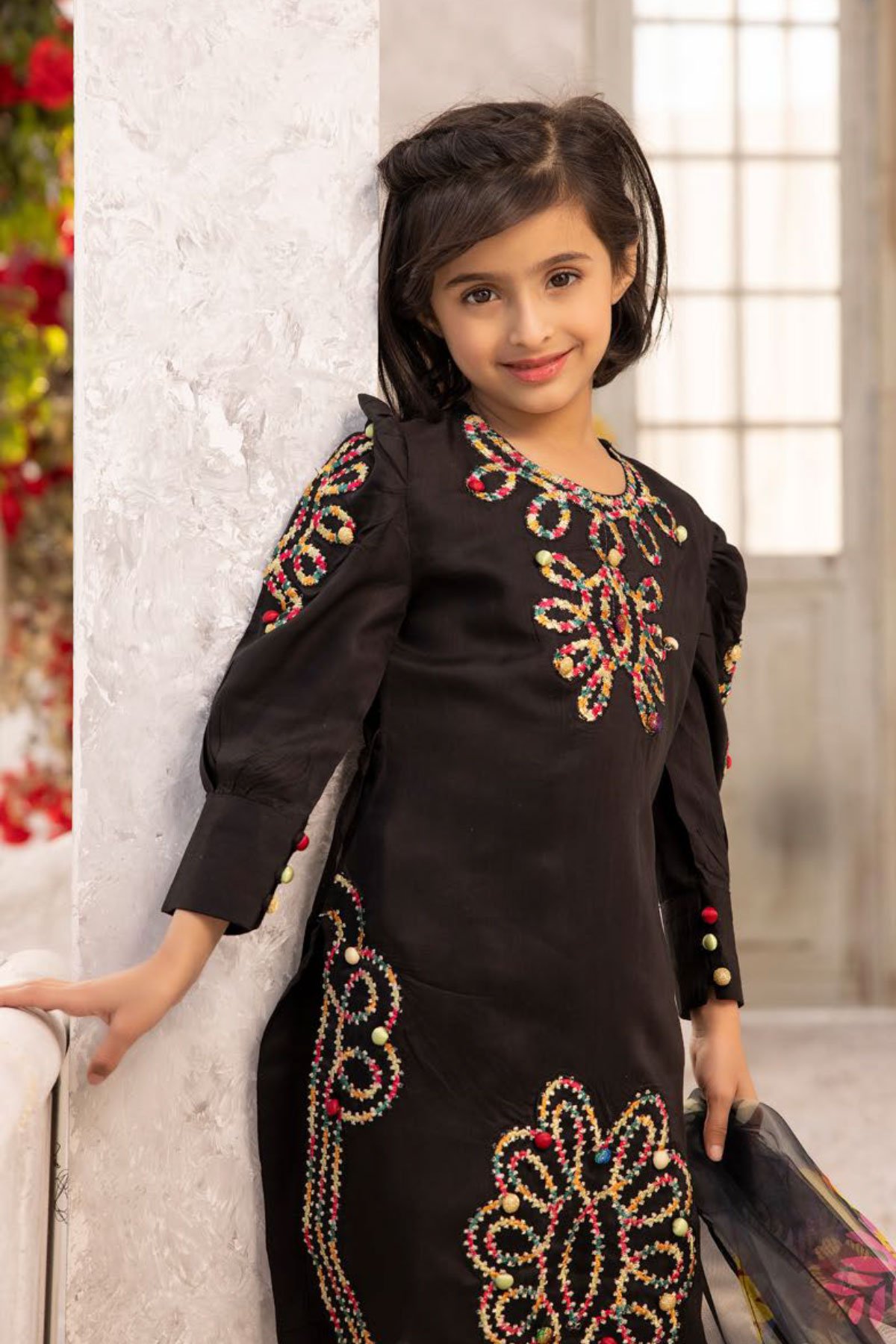 This beautiful 3 piece Nakhra lawn kids collection features a straight shirt with dori work embroidered sides embellished with a cut design back neckline. It comes with full length sleeves with a cut design on the cuffs. The look is finished with a chiffon digital printed dupatta and straight leg trousers.