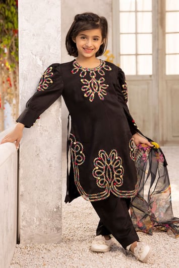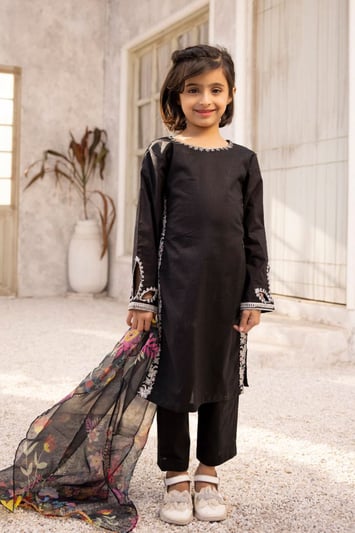 This beautiful 3 piece Nakhra kids lawn collection features a straight shirt with dori work embroidered sides embellished with a cut design back neckline. It comes with full length sleeves with a cut design on the cuffs. The look is finished with a chiffon digital printed dupatta and straight leg trousers.