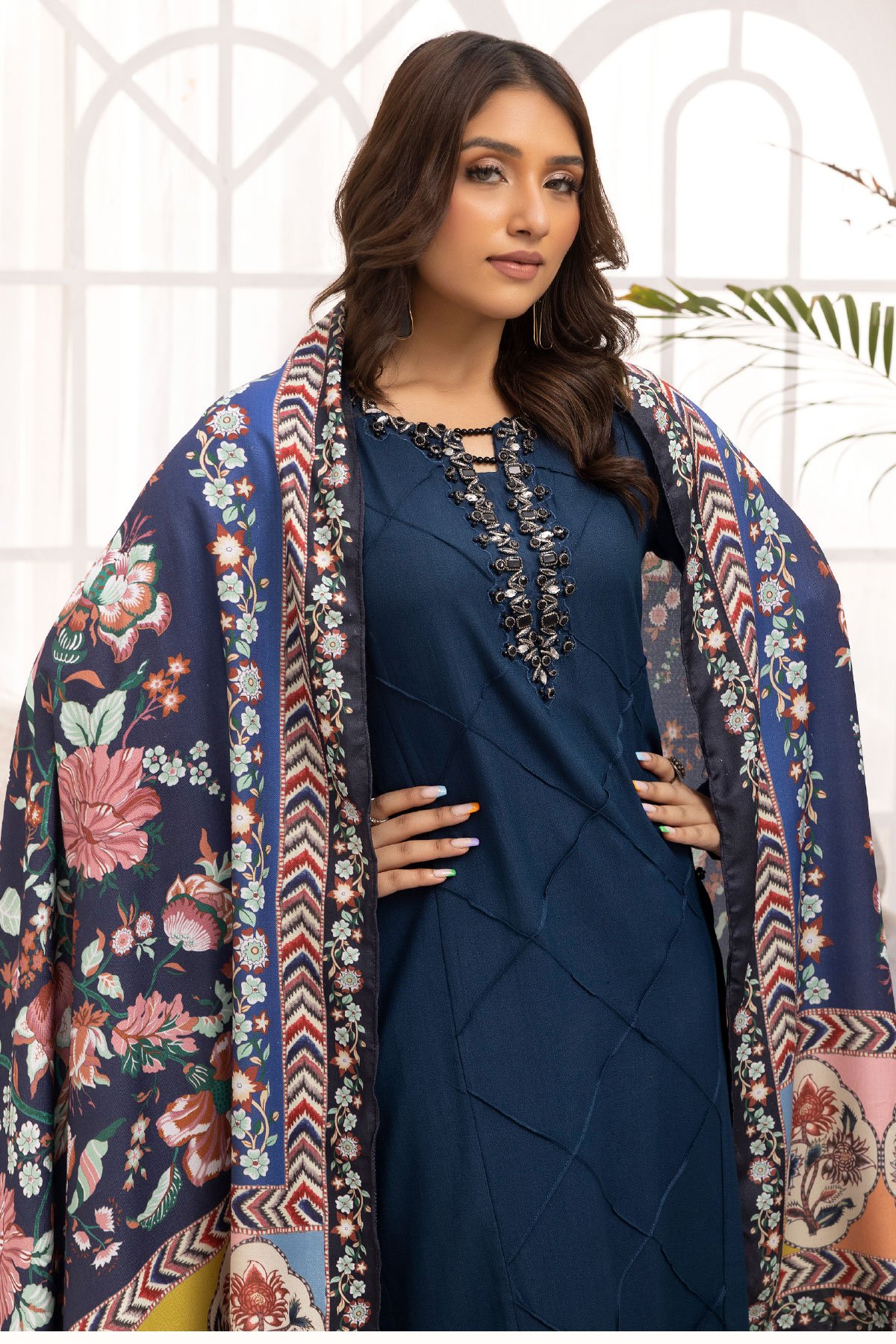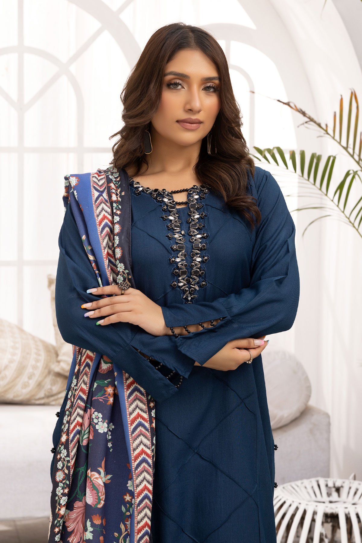 This beautiful 3 piece Nakhra lux collection suit features a straight linen shirt with embellishment on the neckline along with piping throughout, finished with full length sleeves. Paired with flared linen trousers and the look is finished with a printed linen shawl.