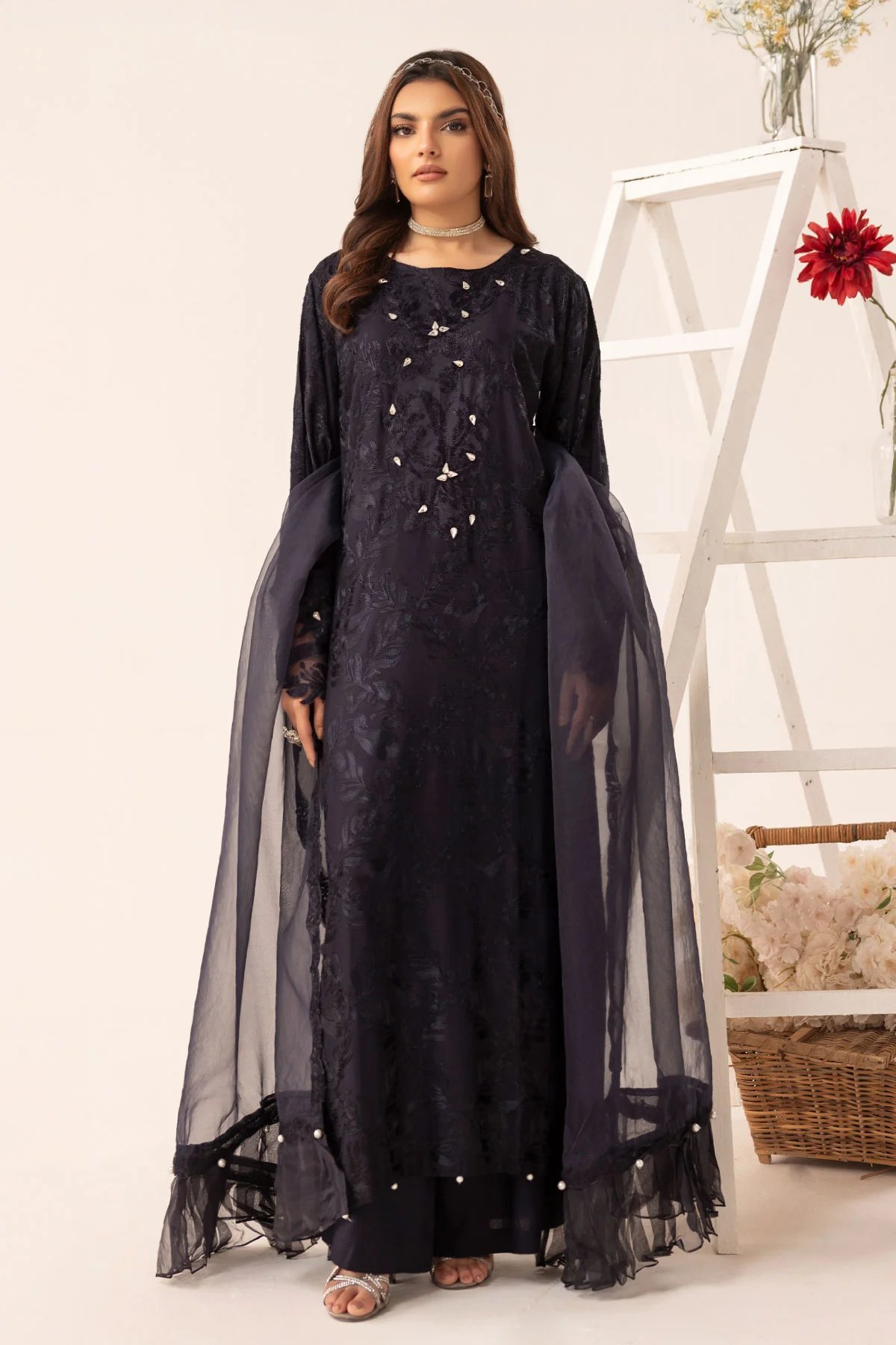This beautiful 3 piece Nakhra Linen Collection features a long-length kameez adorned with intricate embroidery and elegant stone handwork. Paired with stylish plazo trousers, it offers a graceful and timeless appeal. The ensemble is completed with a delicate organza dupatta, enhanced with frills, embroidery, and exquisite accessories, making it a perfect choice for any festive or formal occasion.